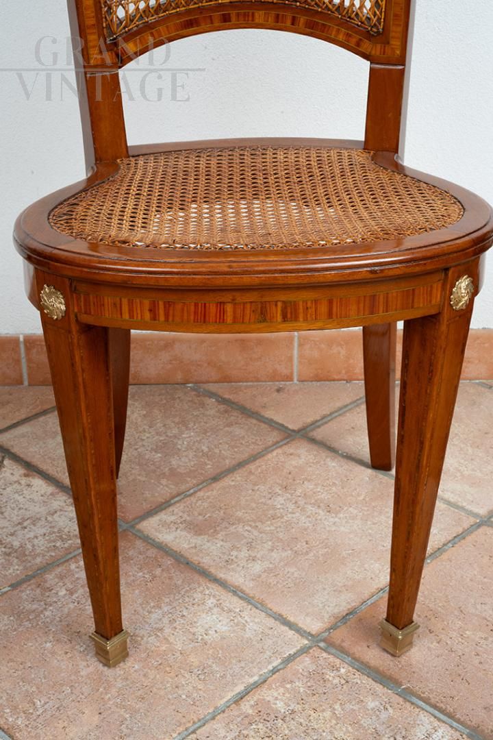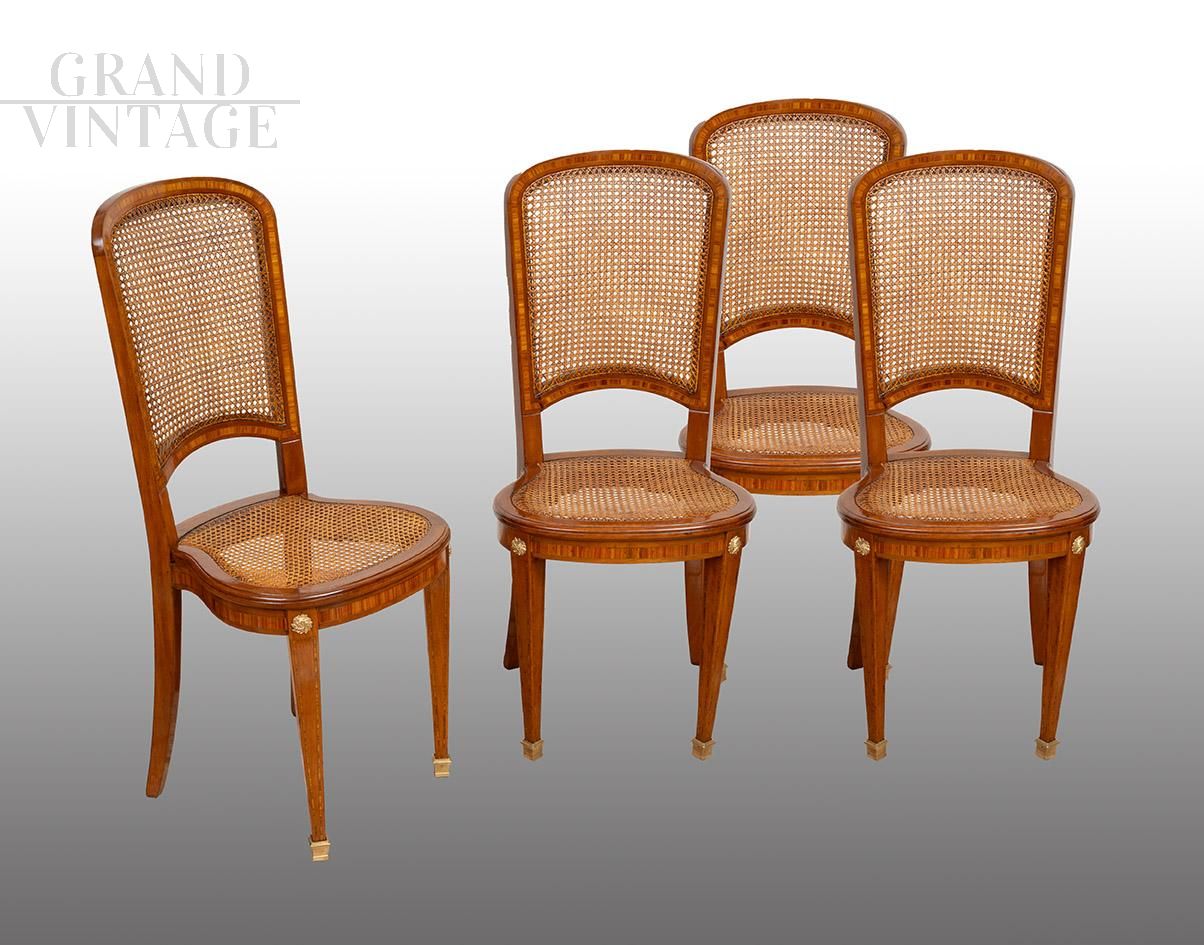 Group of four antique Napoleon III chairs in precious exotic woods with gilded bronze applications, France 19th century. The backrest has a shape nicknamed racket and is embellished by the presence of woven Vienna straw. The seat has the same motif as the backrest and rests on four pyramidal feet ending with a bronze shoe. Origin: France 19th century. Condition: Restored by our master craftsmen with the traditional method of shellac and alcohol done by hand.