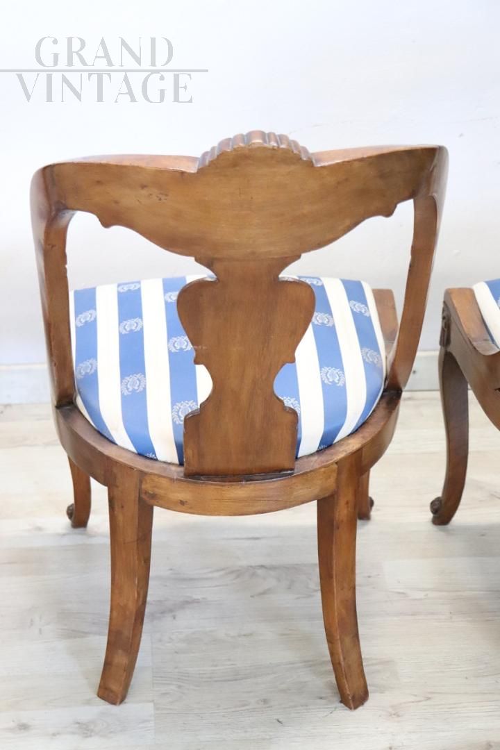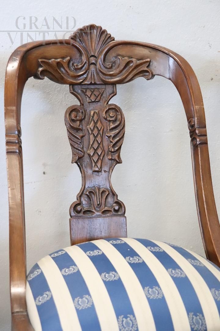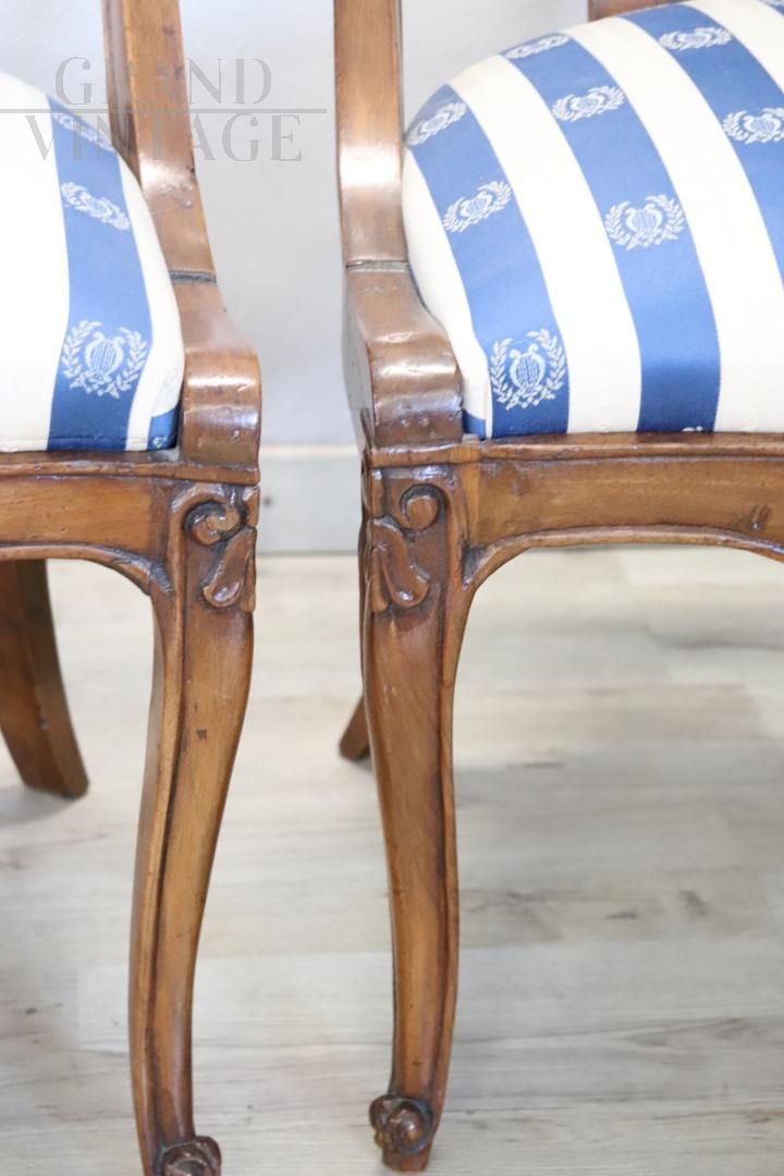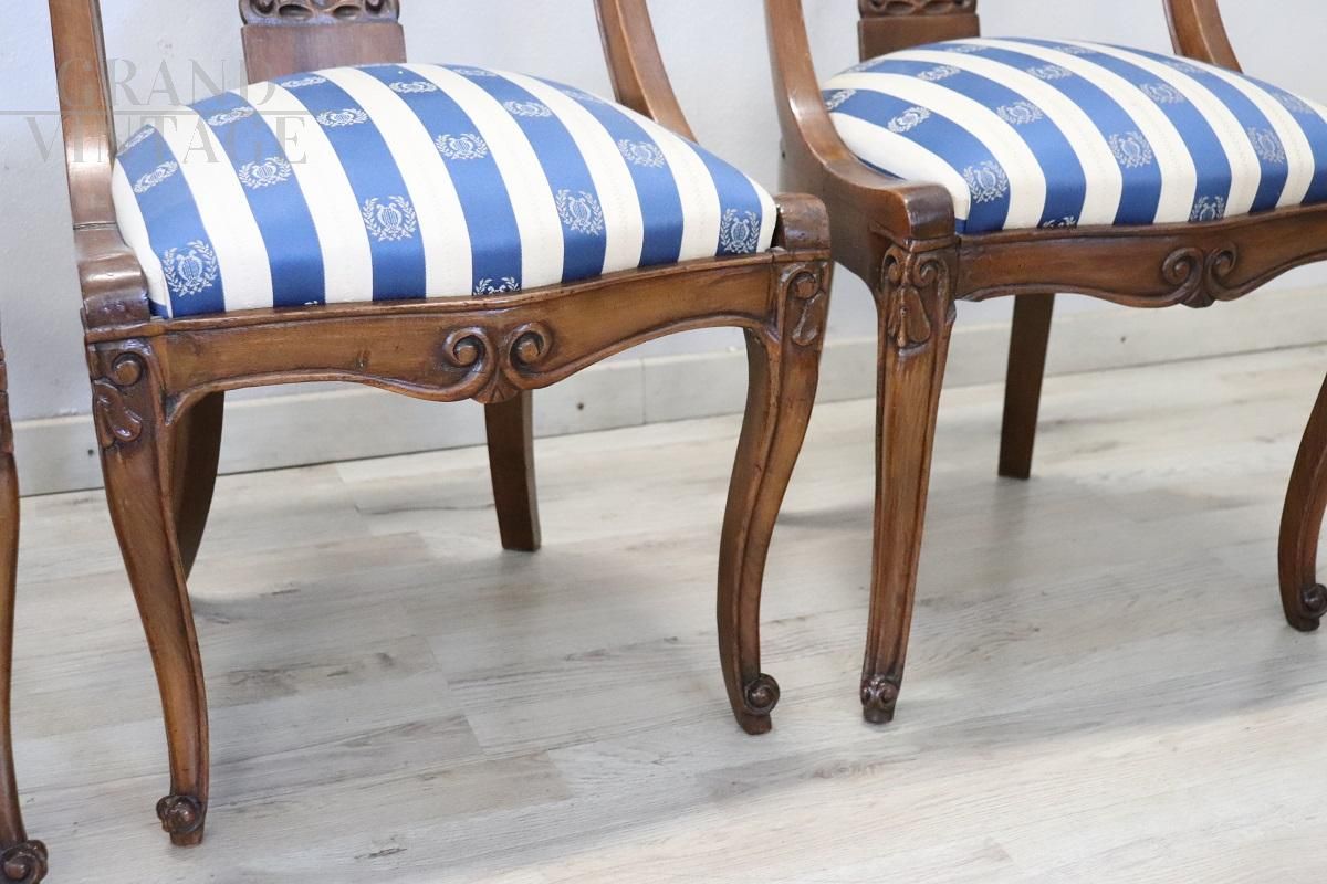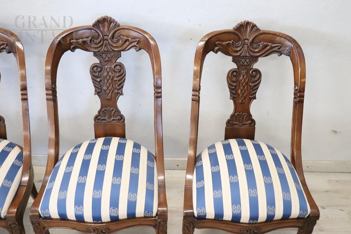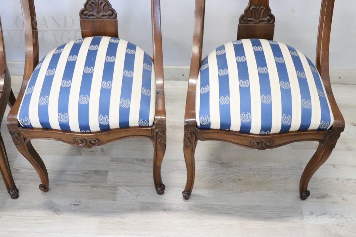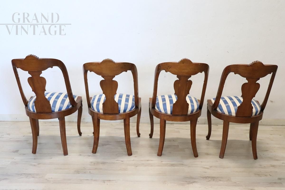 Beautiful set of four antique chairs in solid walnut wood from the first half of the 19th century, Charles X period, produced by an Italian cabinet maker. Characterized by an enveloping and refined backrest, embellished with an elaborate decoration hand-carved in walnut wood. The seat is large and comfortable with padding covered in elegant striped fabric. Excellent condition of the wood and padding, only one chair has a light stain on the fabric. Perfect for an important dining table. Price negotiable.