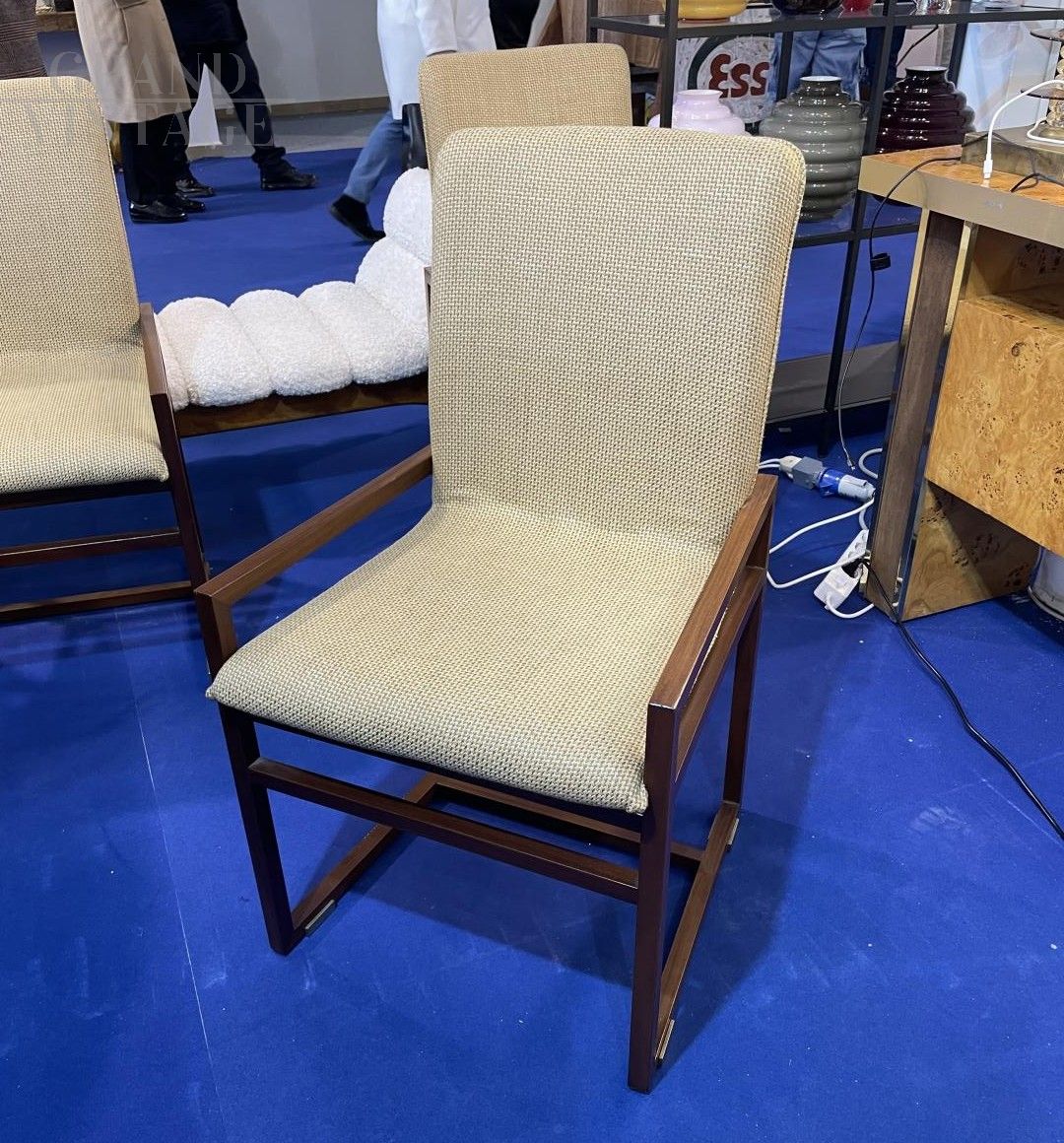 Set of four design chairs armchairs by Paul Balmain with a beautiful geometric wooden structure, in excellent condition with perfect fabric, France 1970s.
