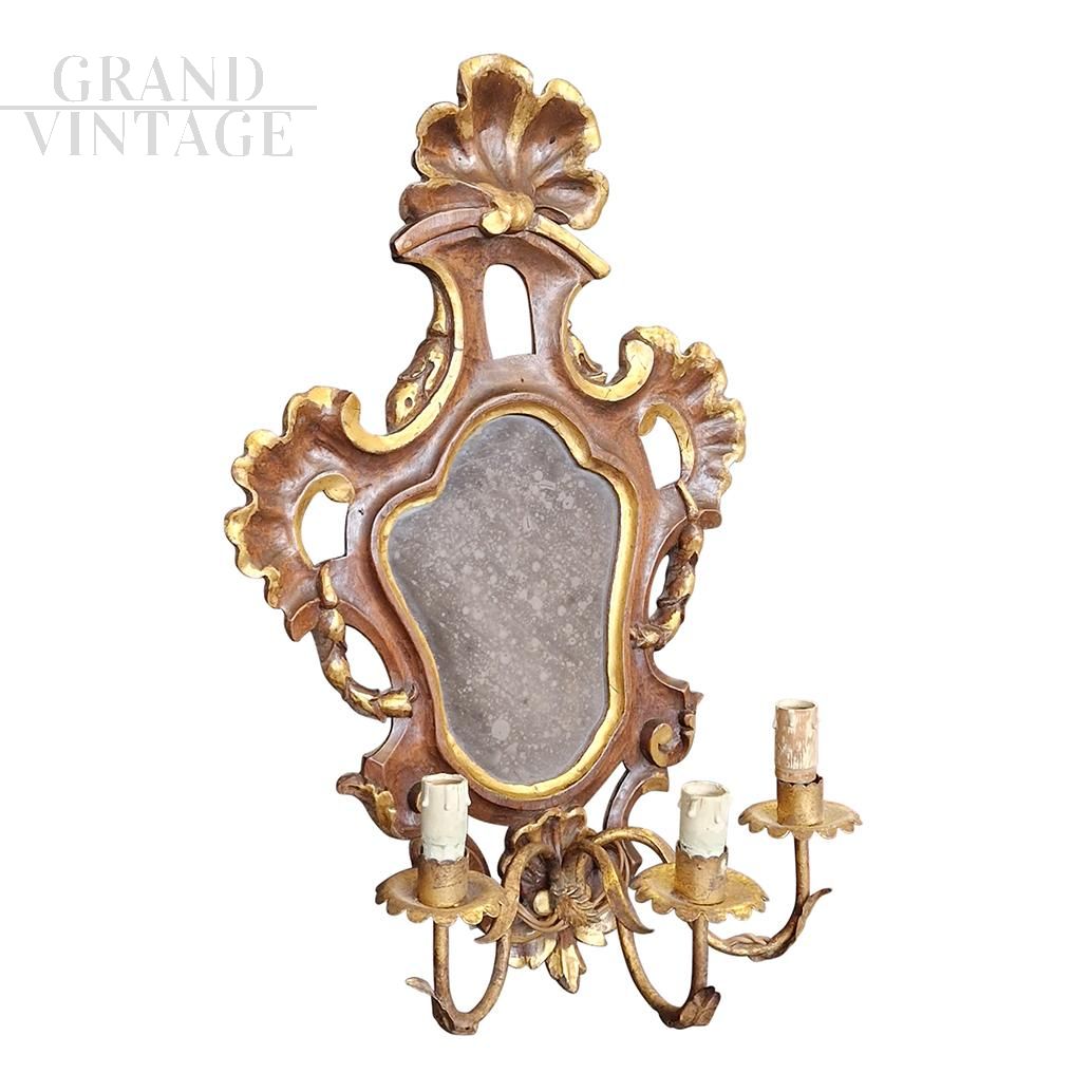 Set of four Venetian three-light fans, in carved, lacquered and gilded wood, with a small central mirror, late 19th century - early 20th century.