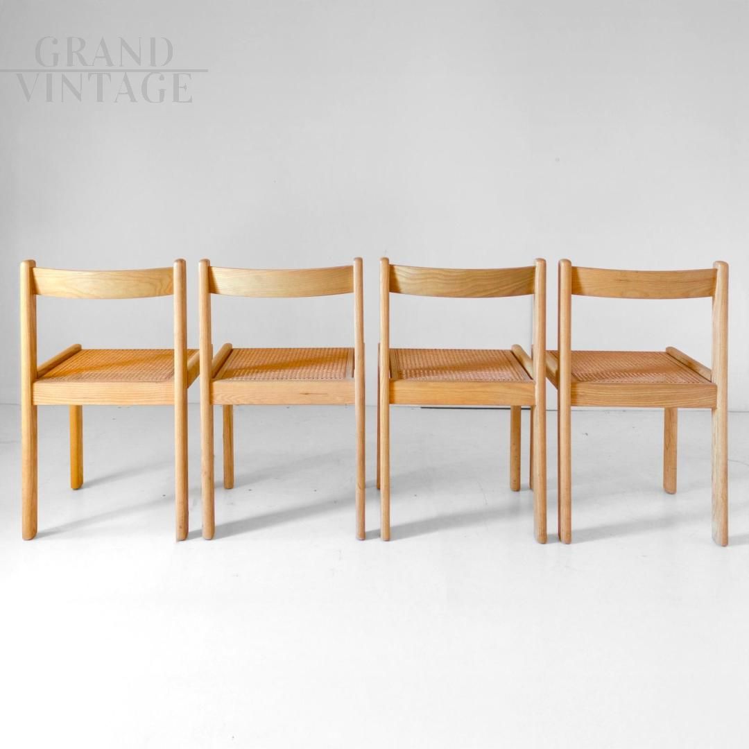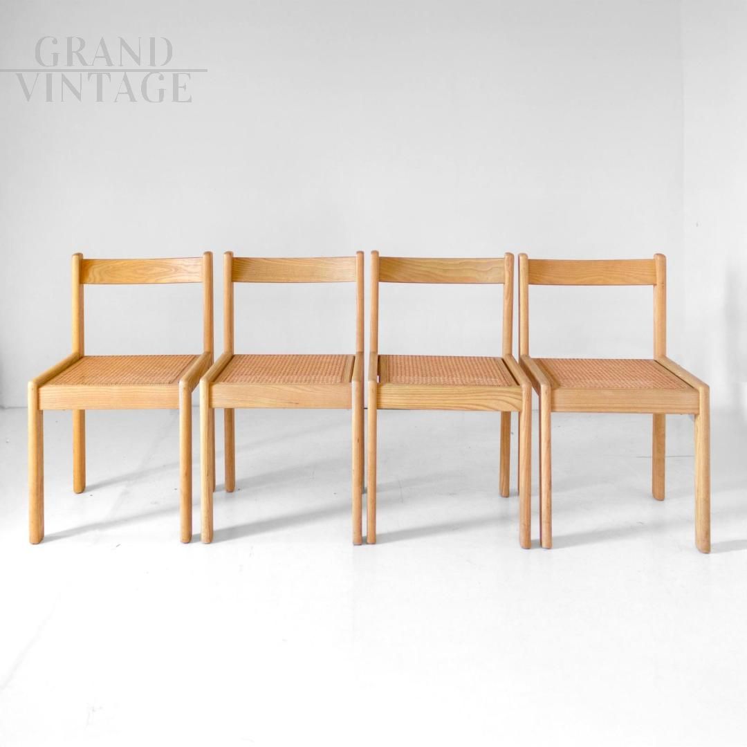 Set of Four Italian Oak and Vienna Straw Chairs, 1970s. An elegant set of four dining chairs made in Italy in the 1970s, featuring a solid oak frame and a seat in fine, hand-woven Vienna straw. The clean lines and use of natural materials give the chairs a timeless appeal, perfect for settings ranging from modern rustic to refined minimalism. The wood finish highlights the beauty of the oak grain, while the hand-woven Vienna straw seat adds a touch of lightness and elegance. The chairs have been professionally refinished and are in excellent structural and aesthetic condition.