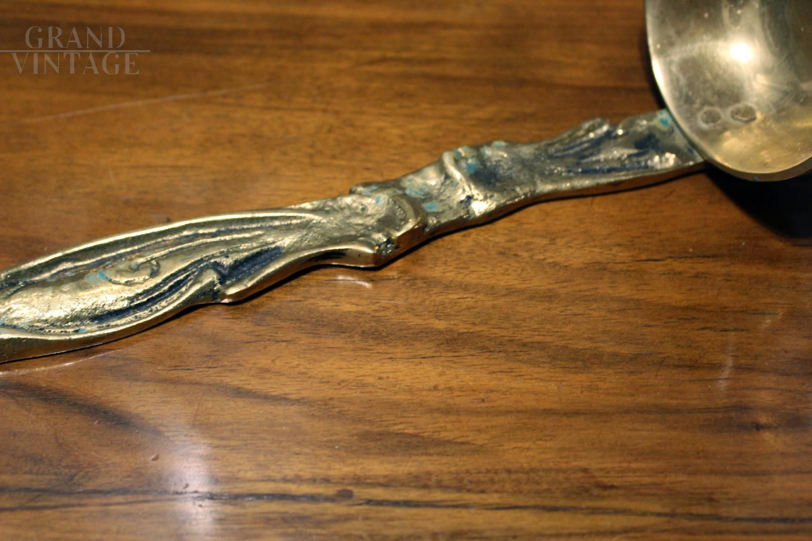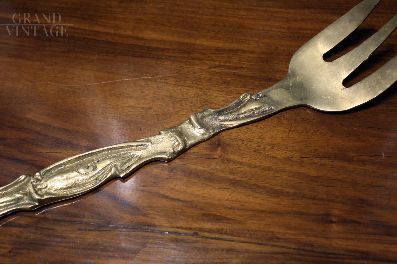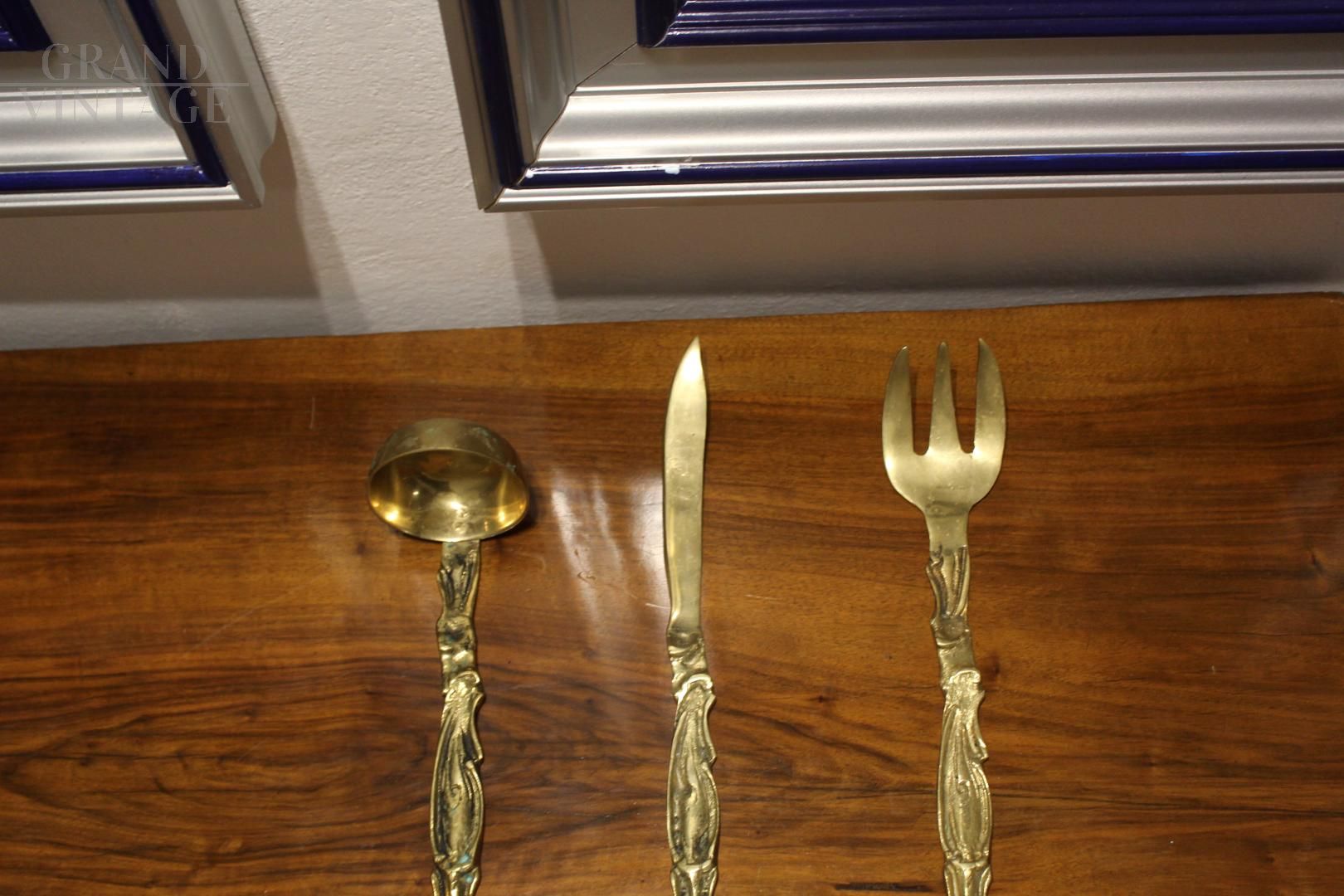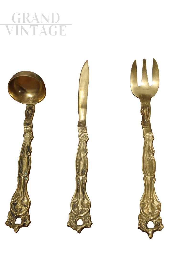 Set of large decorative brass cutlery, Italy from the 1950s, in excellent condition, perfect for furnishing a kitchen with good taste and elegance.