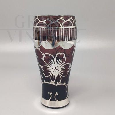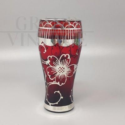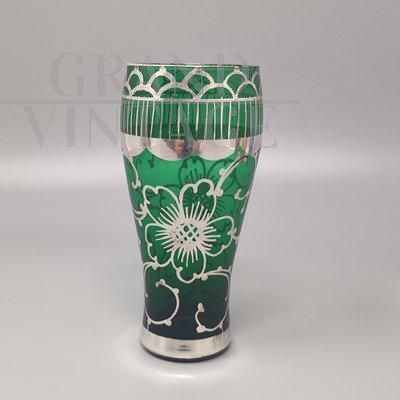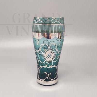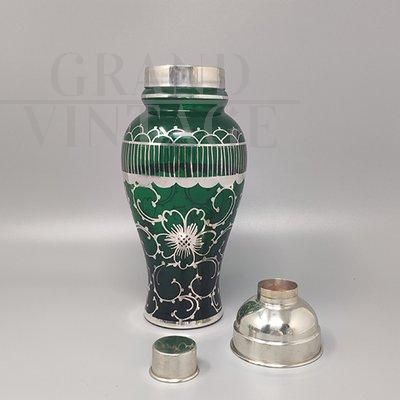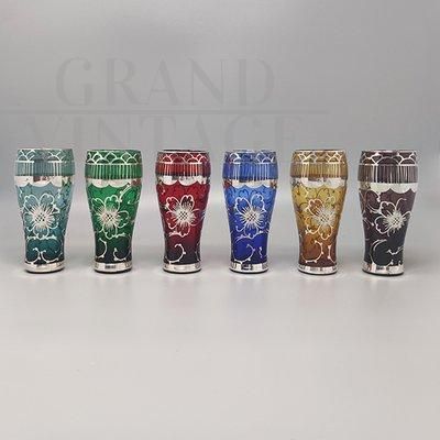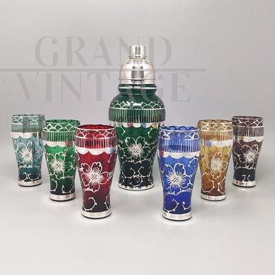 Splendid set of cocktail shaker with six glasses in glass of different colors, finely crafted with silver decorations, produced in Italy in the 1960s. The items are in excellent condition