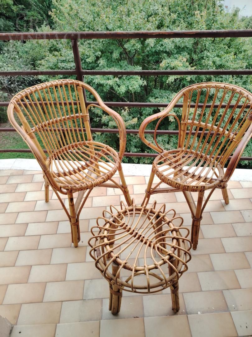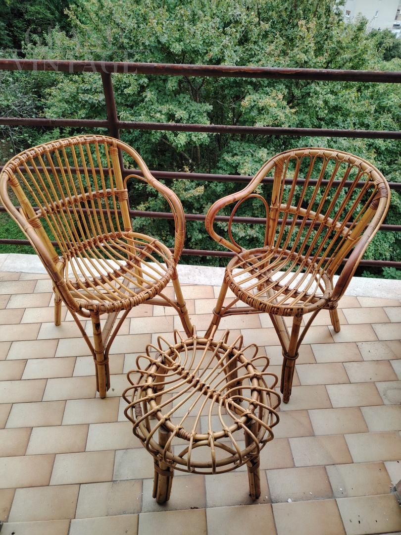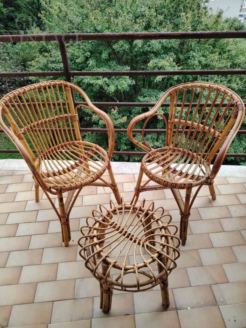 A charming vintage garden lounge set consisting of two armchairs and a bamboo and woven wicker coffee table.