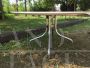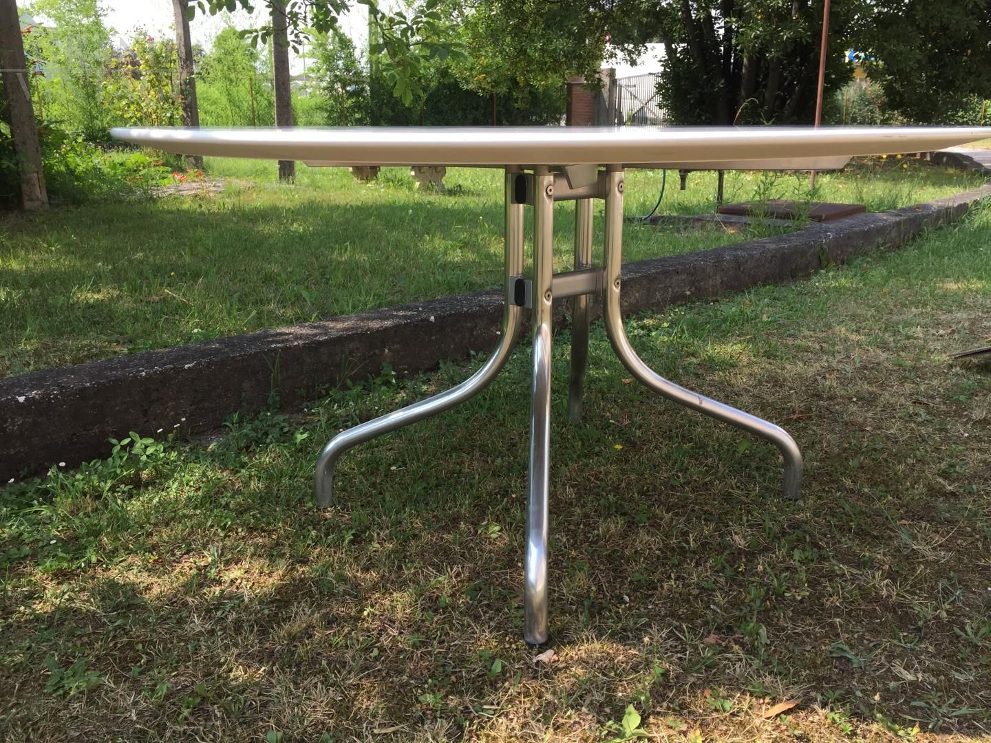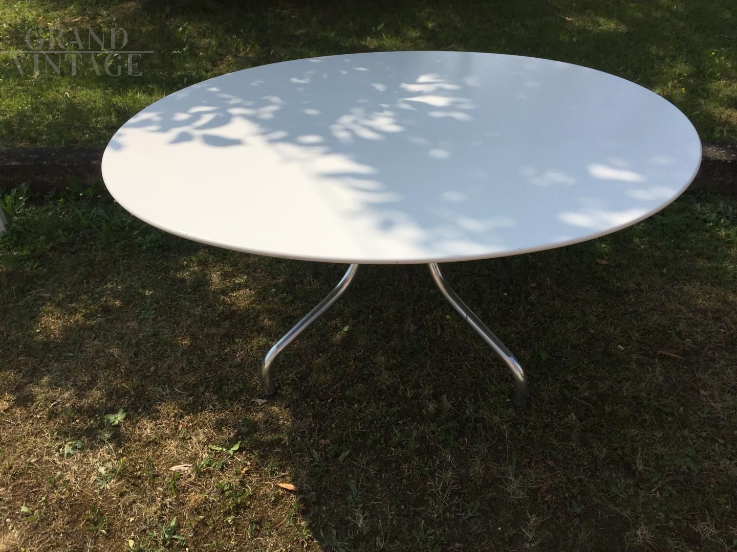 Shine oval dining table by Vico Magistretti for De Padova with 130 x 150 cm white laminate top and natural aluminum base. The table is in very good condition, it was used in a design shop as a part of the display.