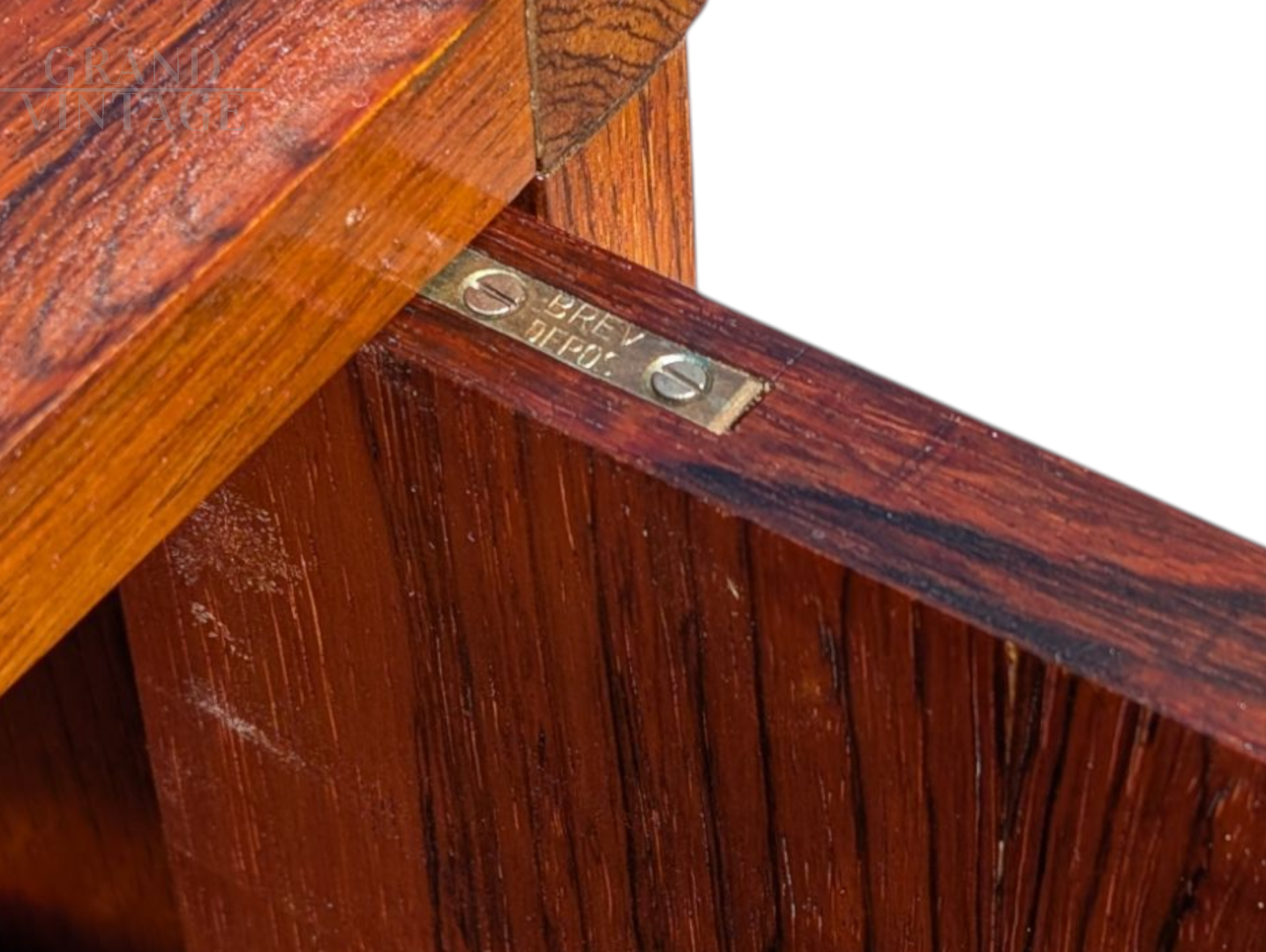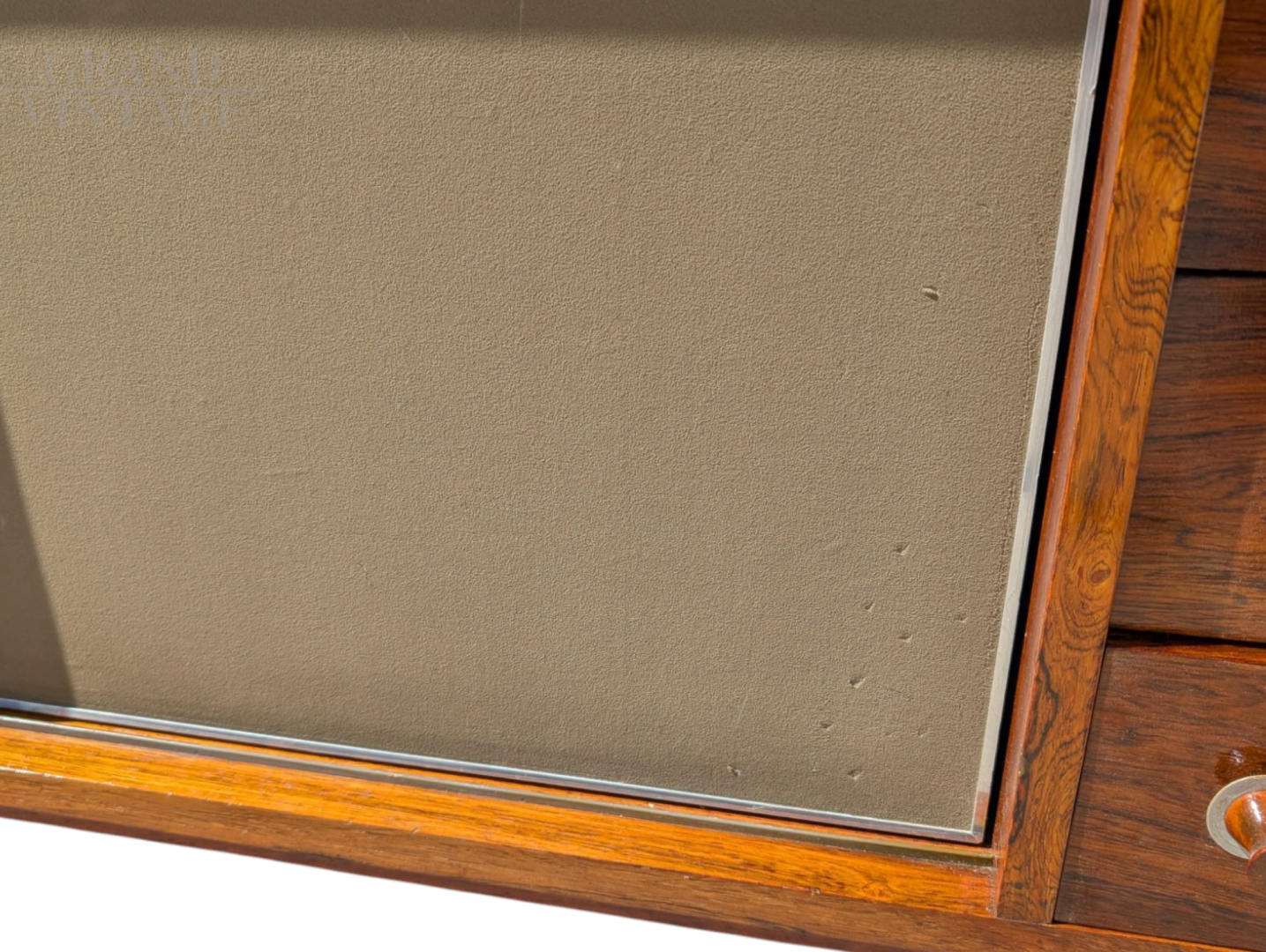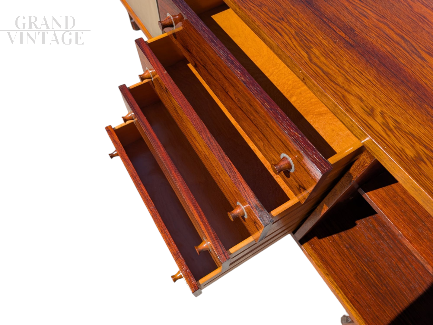 Beautiful vintage wooden sideboard designed by George Coslin for 3V arredamenti Padova in the 60s. This piece has been completely restored and has come back to life thanks to its unmistakable style. Dimensions 77 x 217 x 45 cm (Height, width, depth)