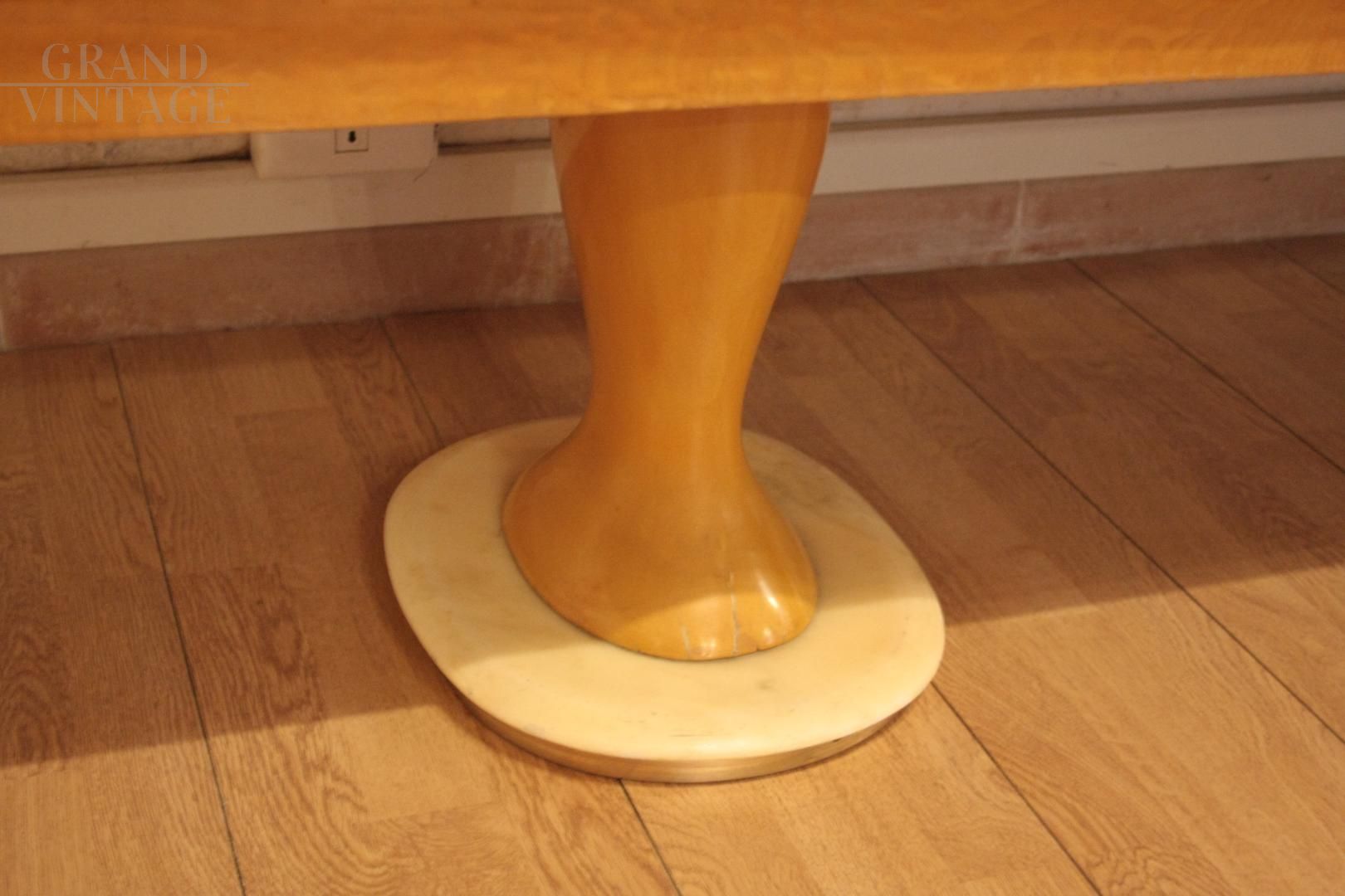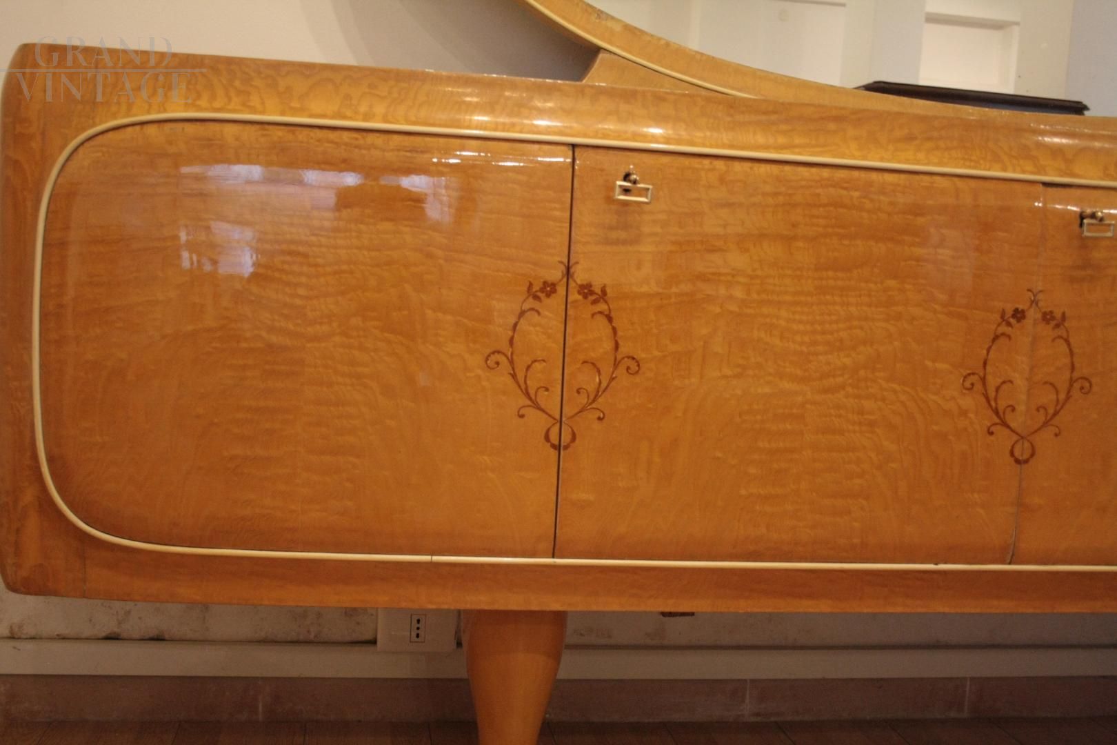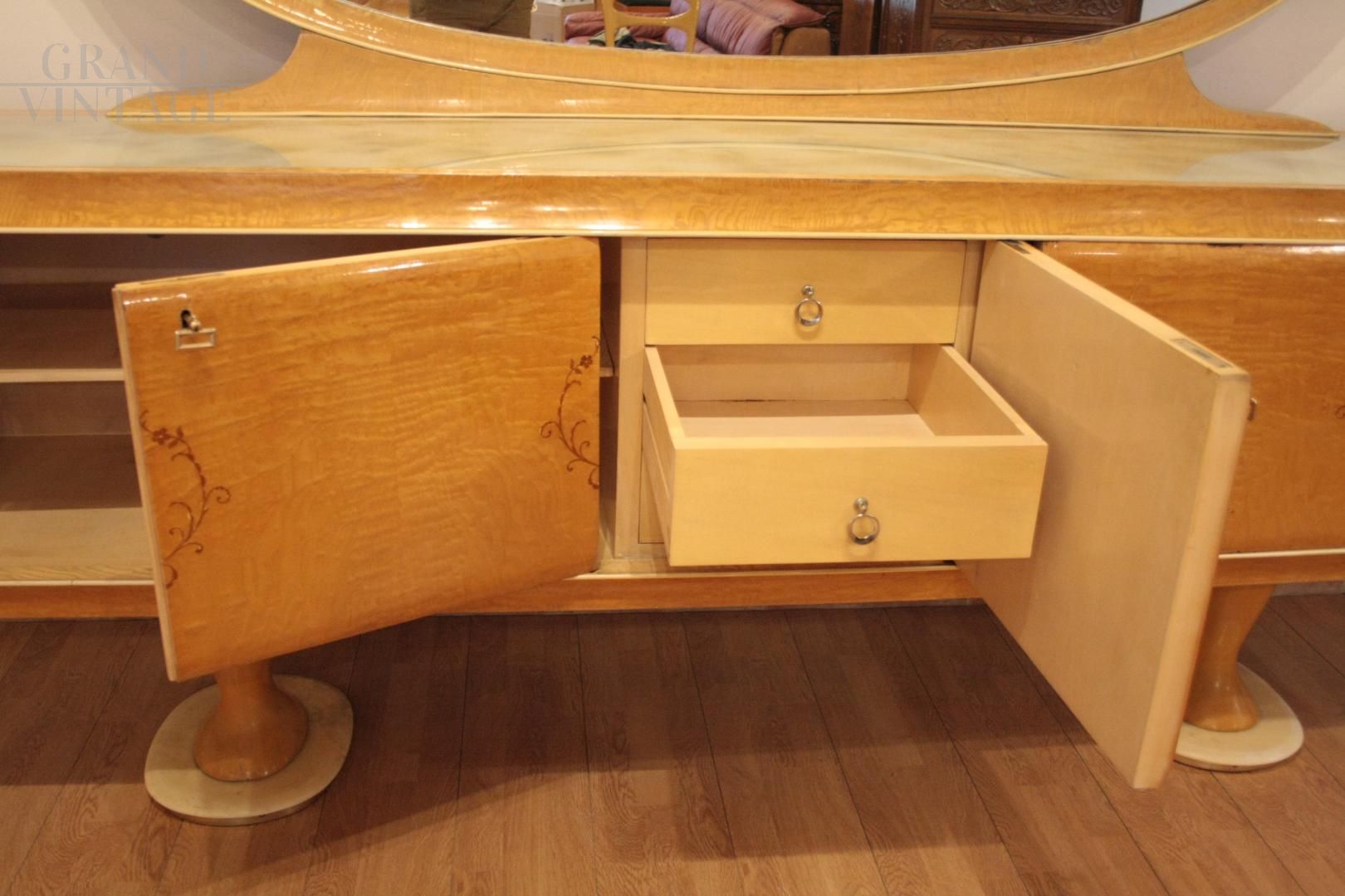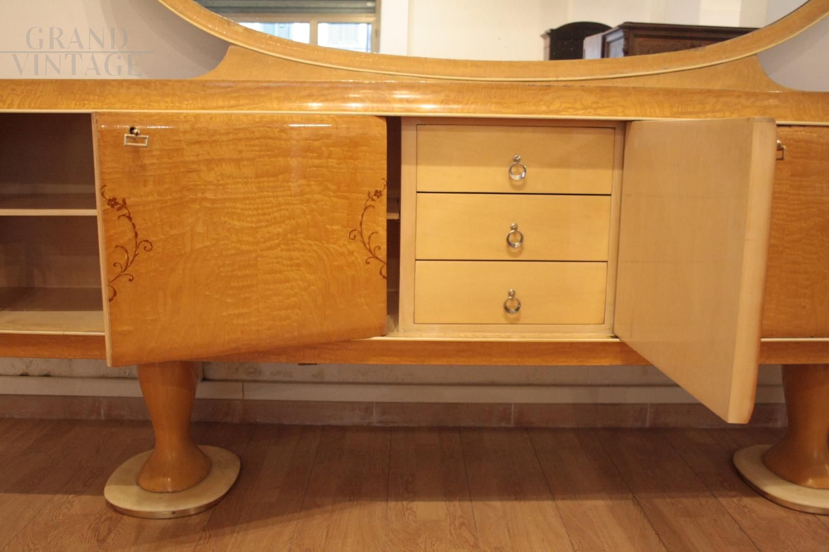 This sideboard was designed by the famous Italian designer Vittorio Dassi, Italy 1950. The piece of furniture is a very particular version of the most common sideboard in mahogany wood and maple inlays. In this sideboard the wood is light presumably maple and the inlays are in dark wood. The white thread that surrounds the profile gives a further touch of elegance to a modern and current piece of furniture. Glass top in the upper part of the sideboard, in the central part two side doors and centrally a smaller door with internal chest of drawers. Supported by two solid wood columns, with marble bases and brass finish. Large upper mirror to embellish the sideboard. In excellent condition of conservation, as shown in the photo. Proportionate in size with a width of 275 cm