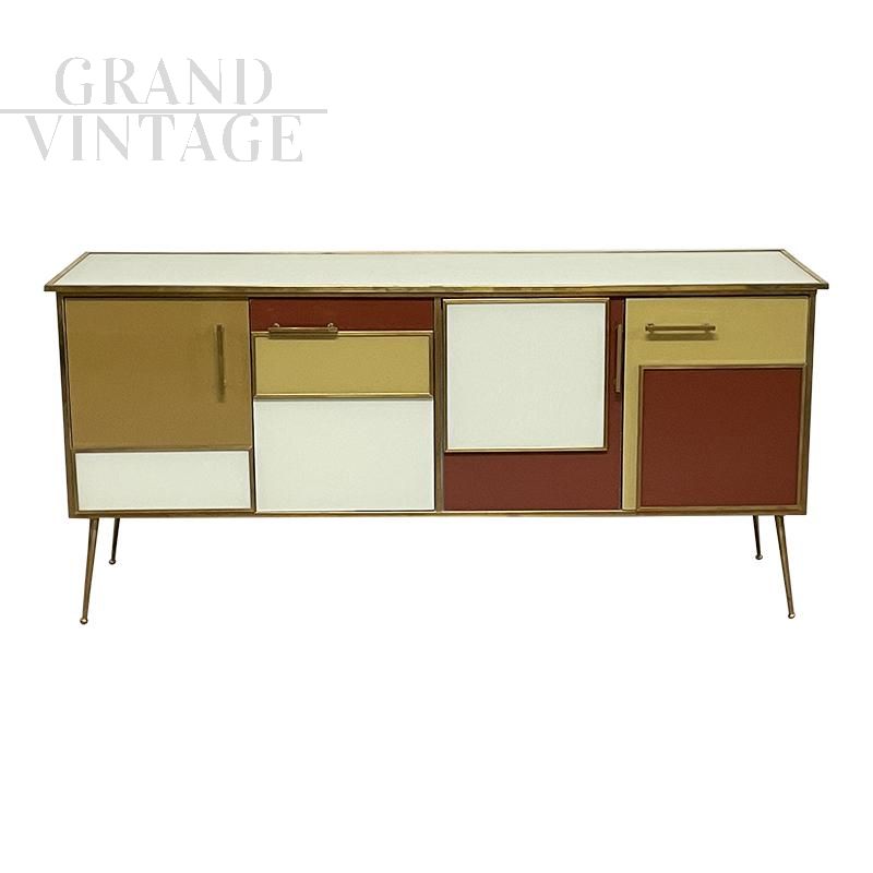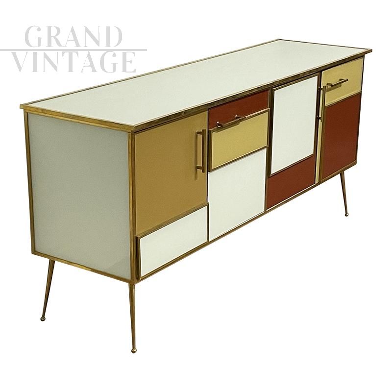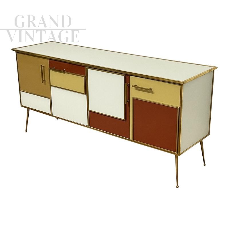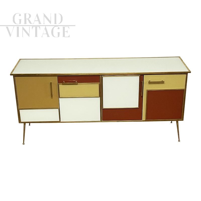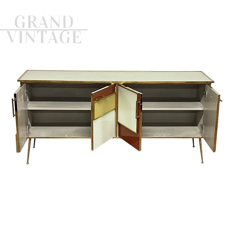 Four-door sideboard in vintage style entirely handmade, with wooden structure covered in white, brown and yellow glass; profiles, handles and feet finishes in golden brass, equipped with internal shelf.