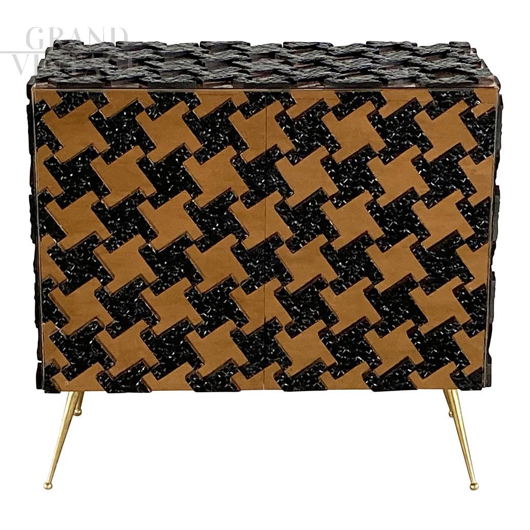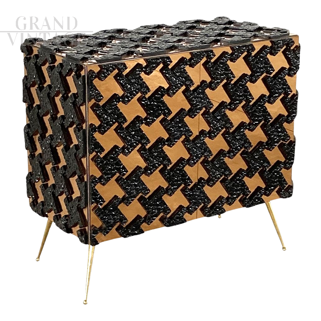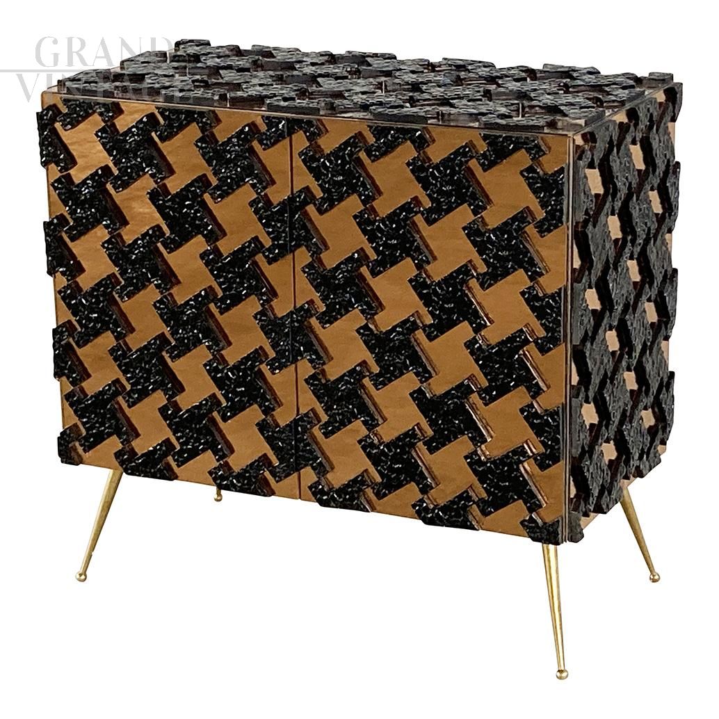Two-door design sideboard, entirely handmade, with wooden structure covered with golden mirror sheets and three-dimensional geometric applications in black lacquered wood that recall the houndstooth motif, the feet are in golden brass. The sideboard is equipped with push-pull doors and internal shelf.