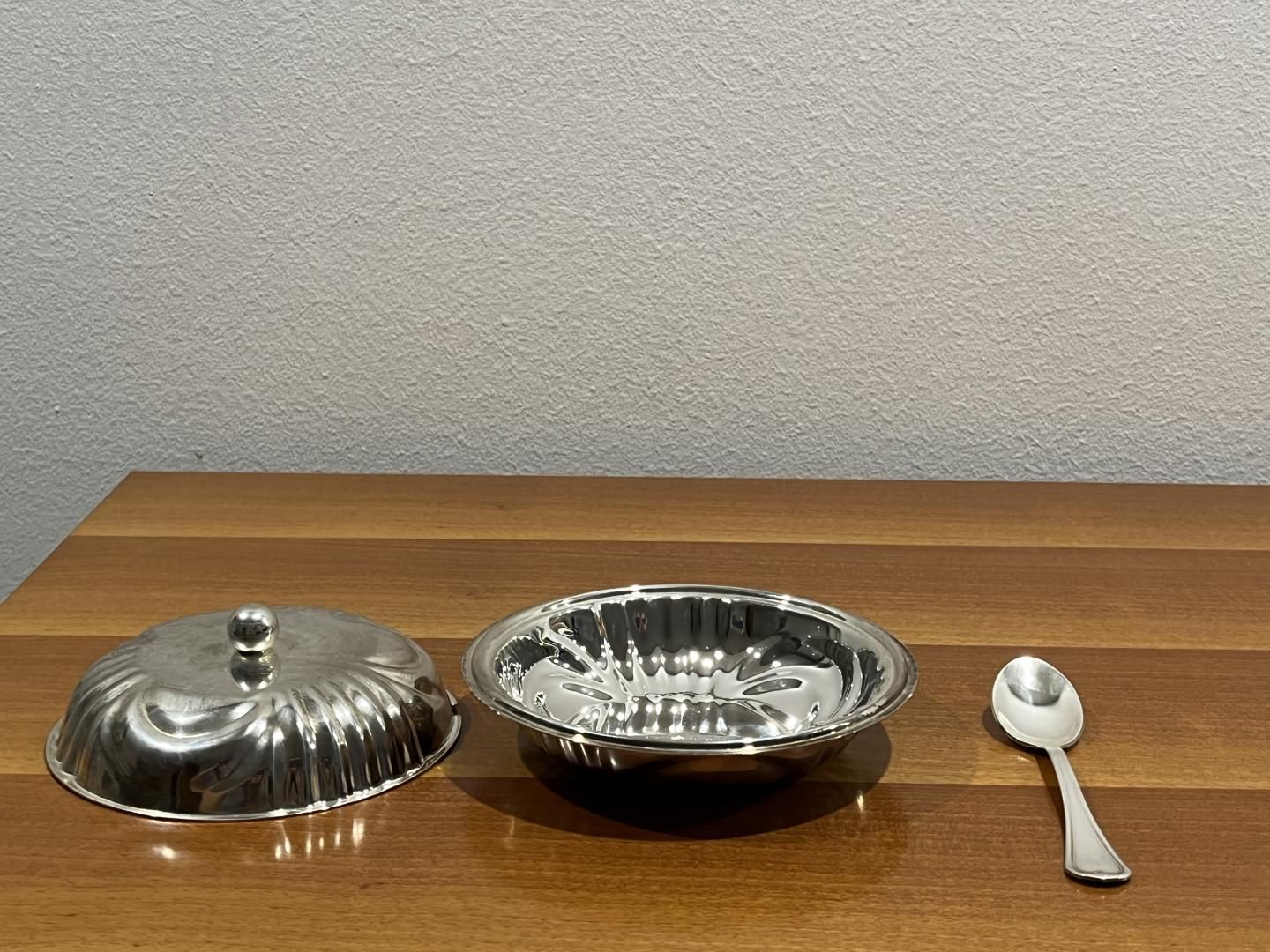 Vintage silver plated tray tureen or bowl with lid and spoon included, 1940s.