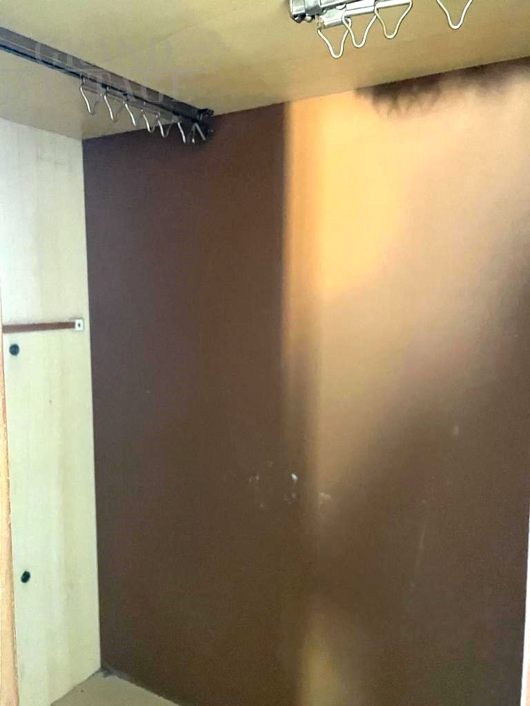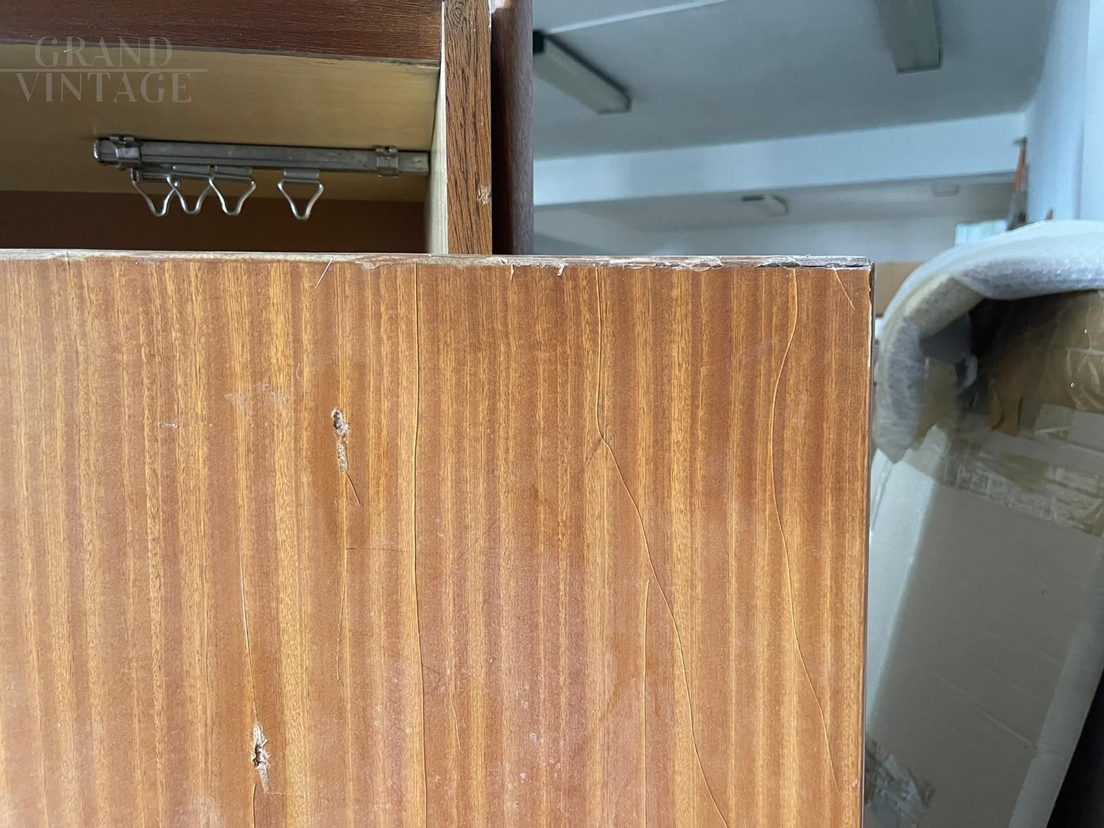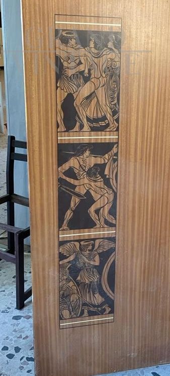 Small vintage 1950s entrance wardrobe with sliding door, in rosewood, decorated on the front with Ancient Greek style figures. Inside a comfortable chest of drawers and several coat hanger hooks.
