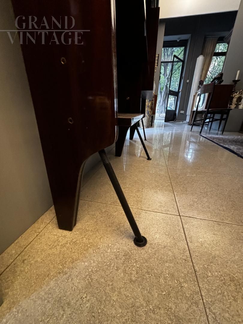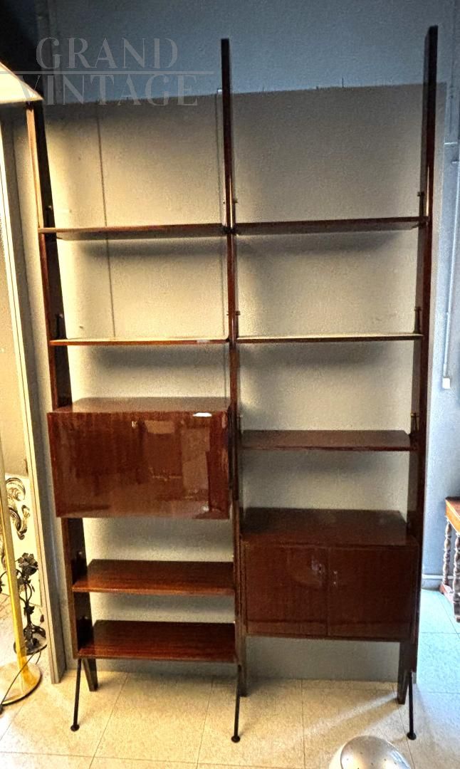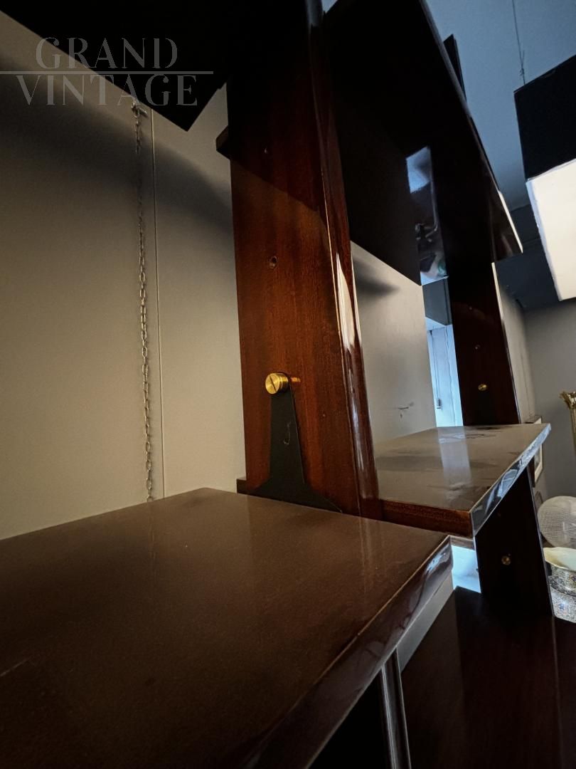 Stunning vintage modular bookcase in mahogany wood with shelves, doors and folding desk. The bookcase has three metal feet that support it, therefore it is not necessary to fix it to the ceiling, but it can be secured to the wall with two dowels to guarantee its stability.