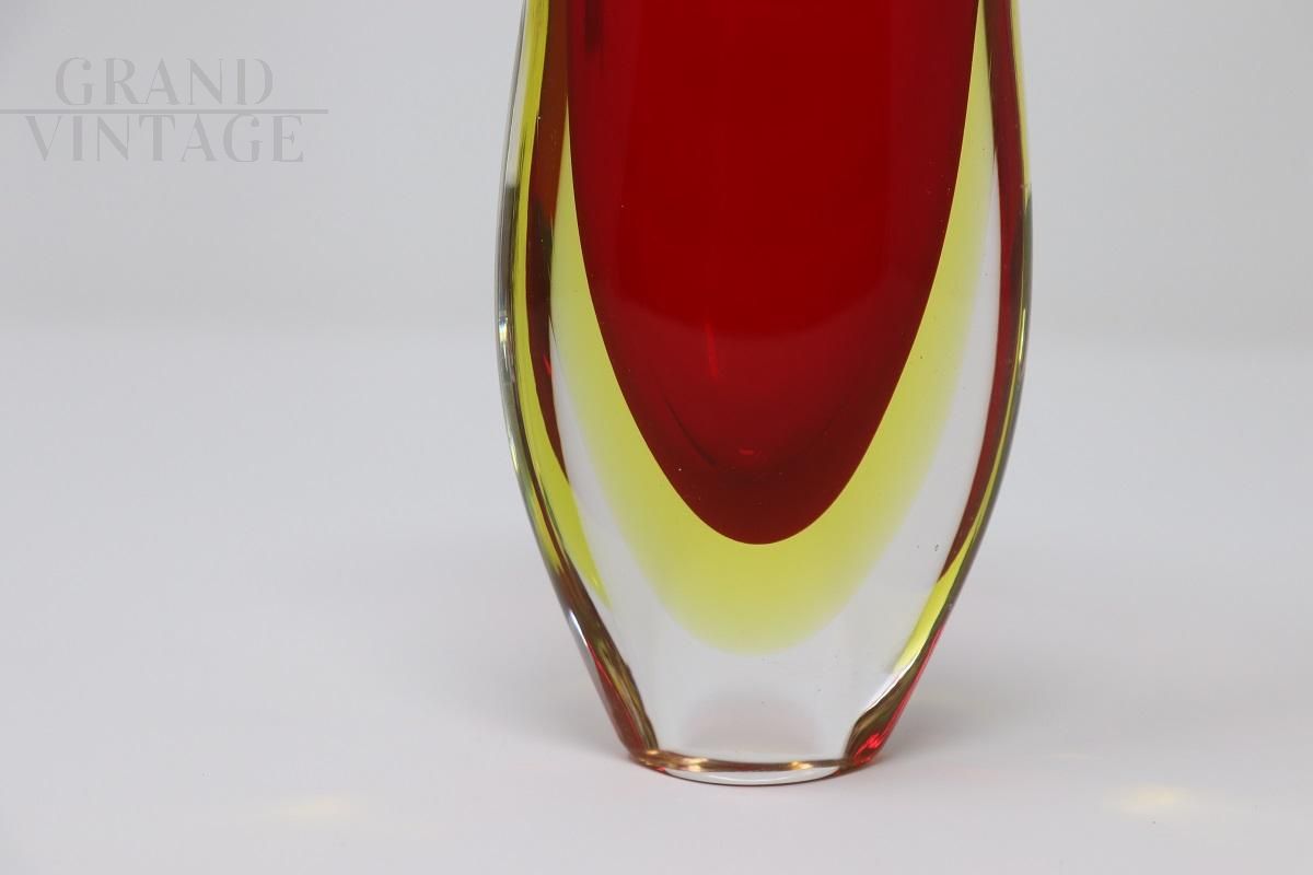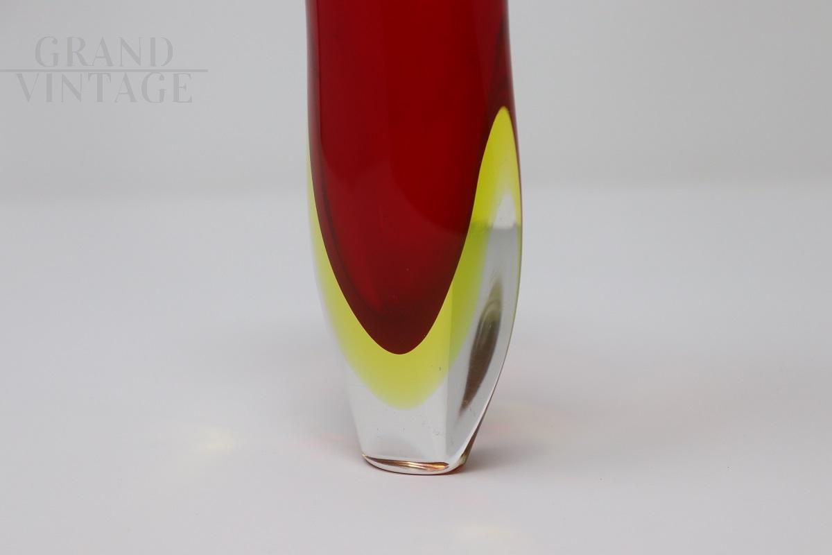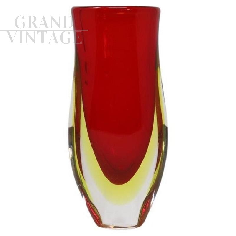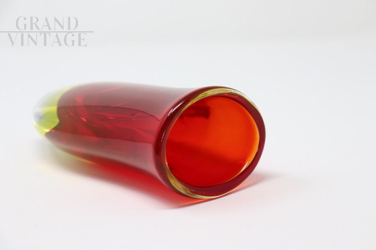 This artistic vase is an exceptional example of the skill of Murano glass masters and the aesthetics of the 1960s. Made with the sommerso technique, represented by the overlapping of layers of differently colored glass, it is characterized by a unique visual depth and a play of colors that captures attention with its ruby red and yellow tones. The fluid and sinuous shape of the vase adds a touch of delicacy and elegance, making it a versatile and timeless piece. Vase without brands or signatures but due to its quality attributable to the mastery of Flavio Poli. Perfect condition, price negotiable.