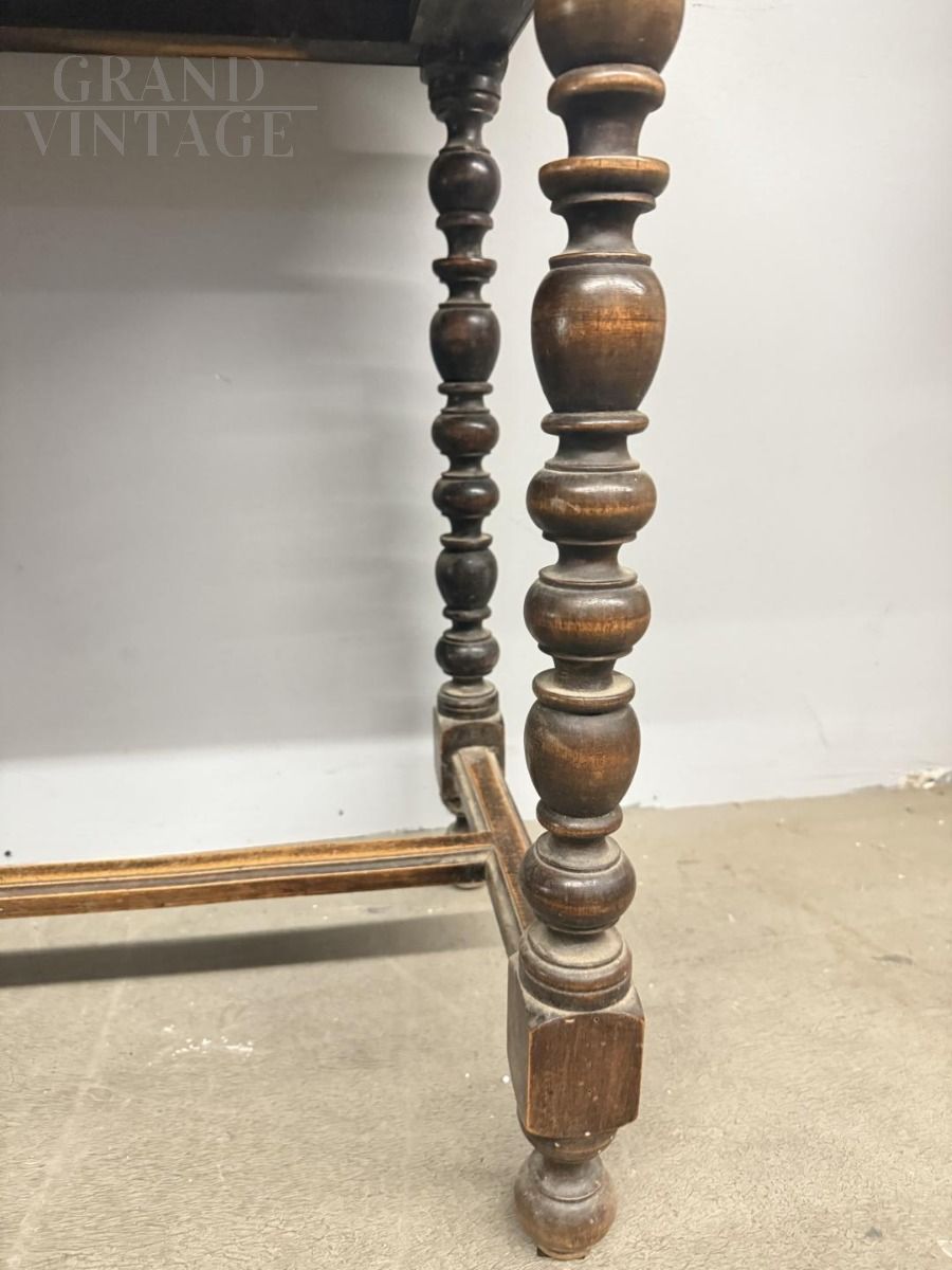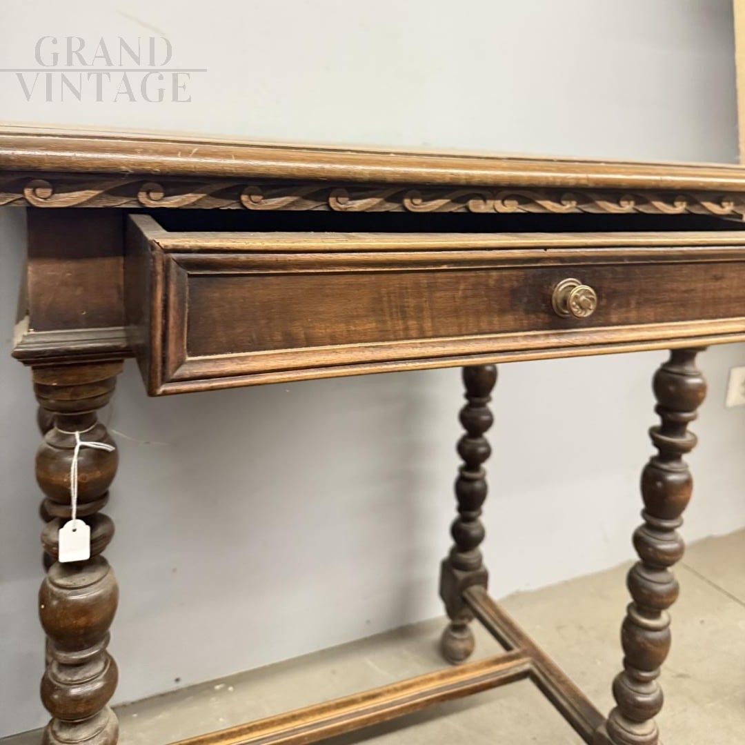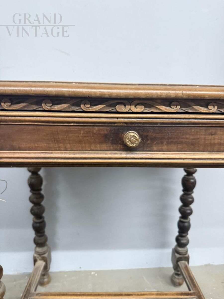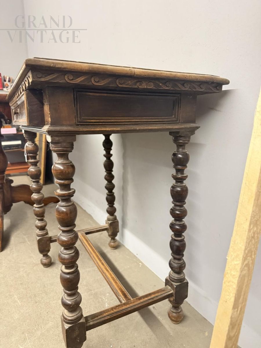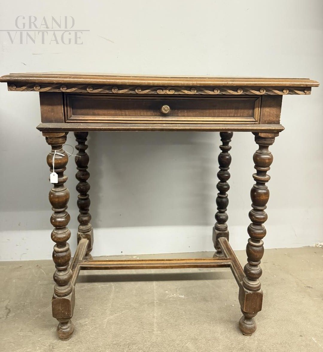 Small antique writing table or side table from the 19th century in solid walnut with turned legs, carved undertop and central drawer, in patina, to be restored. 75 x 80 x 50 cm.
