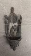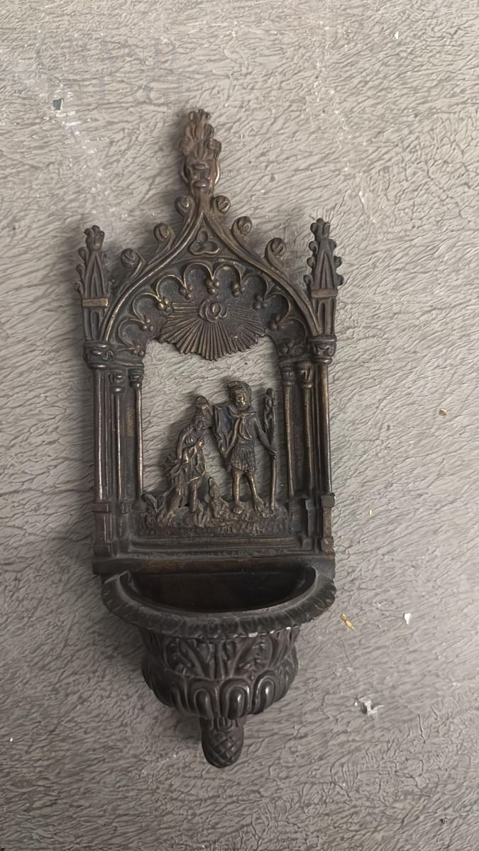 Small antique bronze holy water stoup with a depiction of the baptism of Jesus