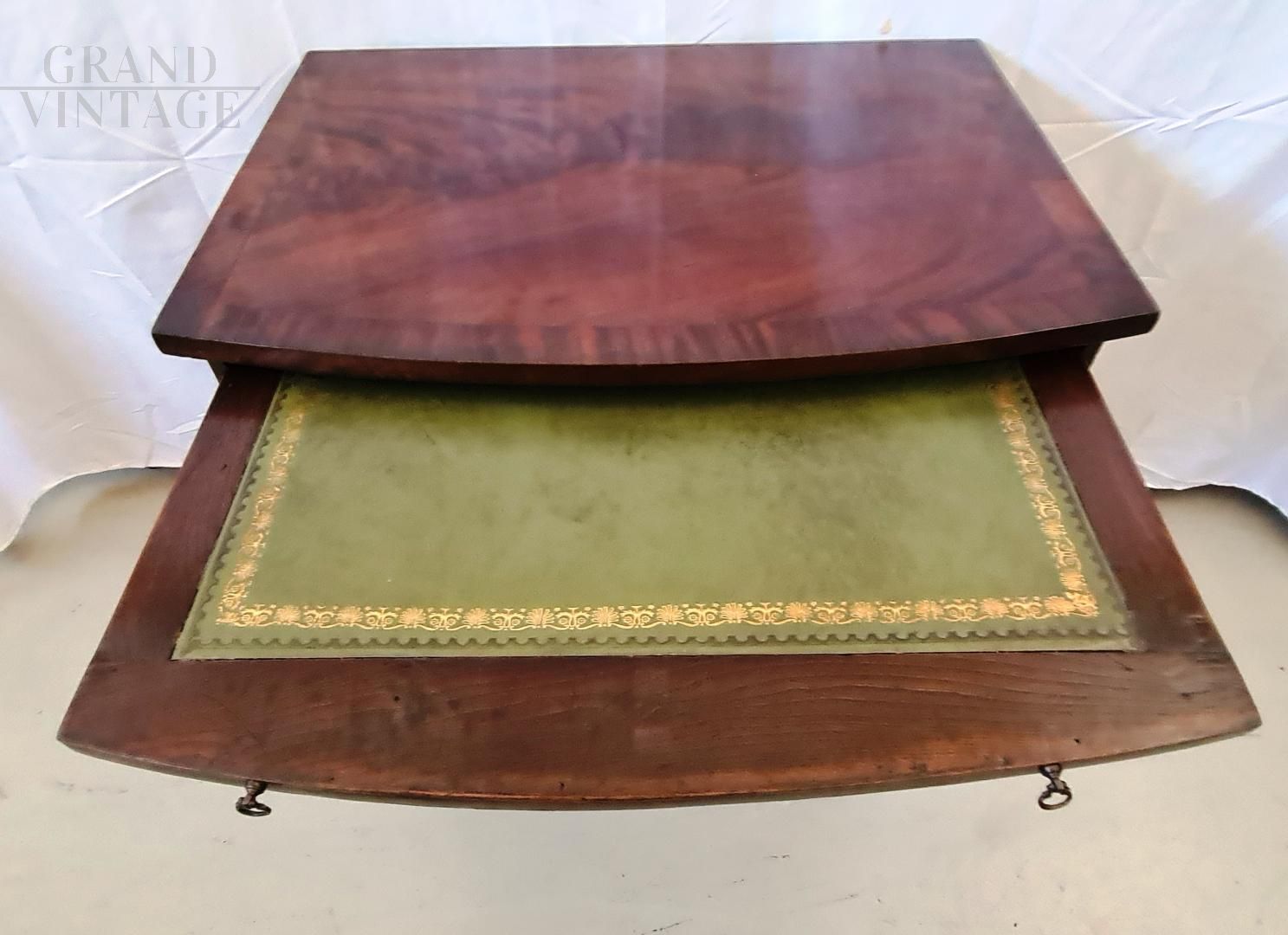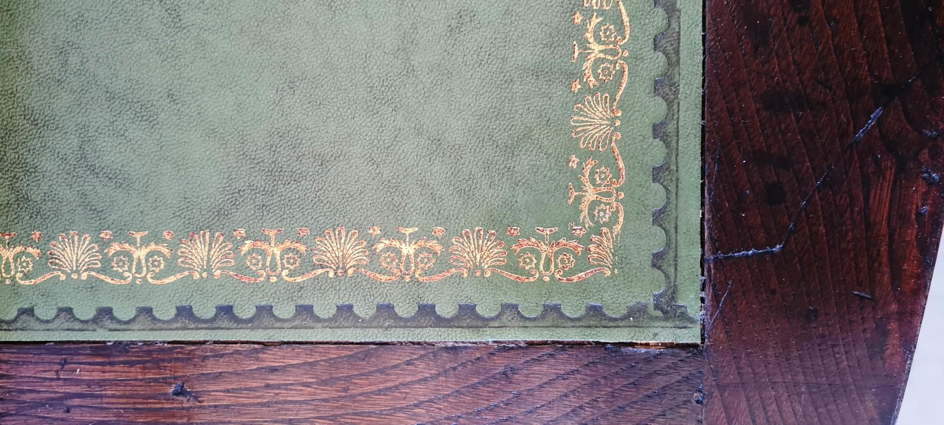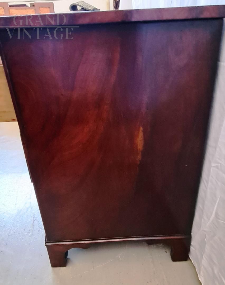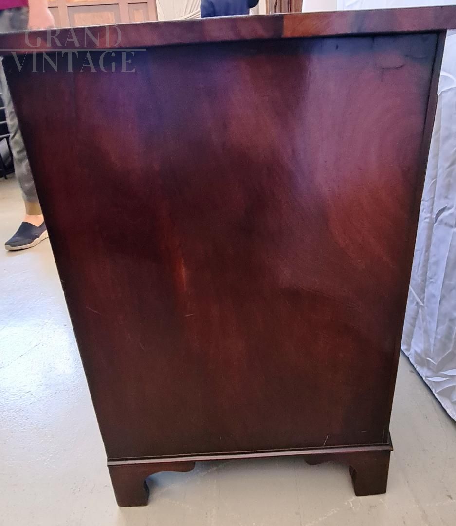 Wonderful small antique Georgian chest of drawers from the early 19th century in mahogany and bois de rose, complete with pull-out writing desk with beautiful dark green leather top with gilded decorations. In very good condition, restored not so long ago.