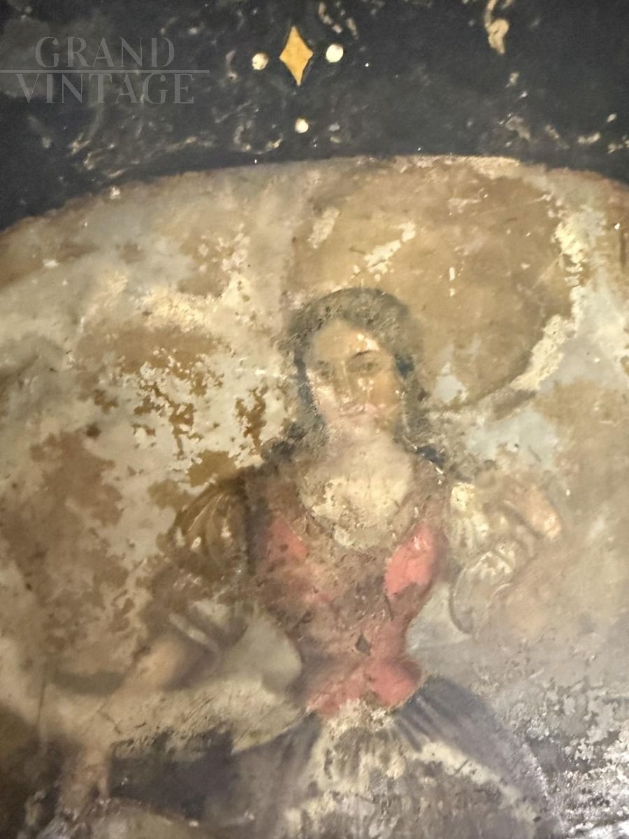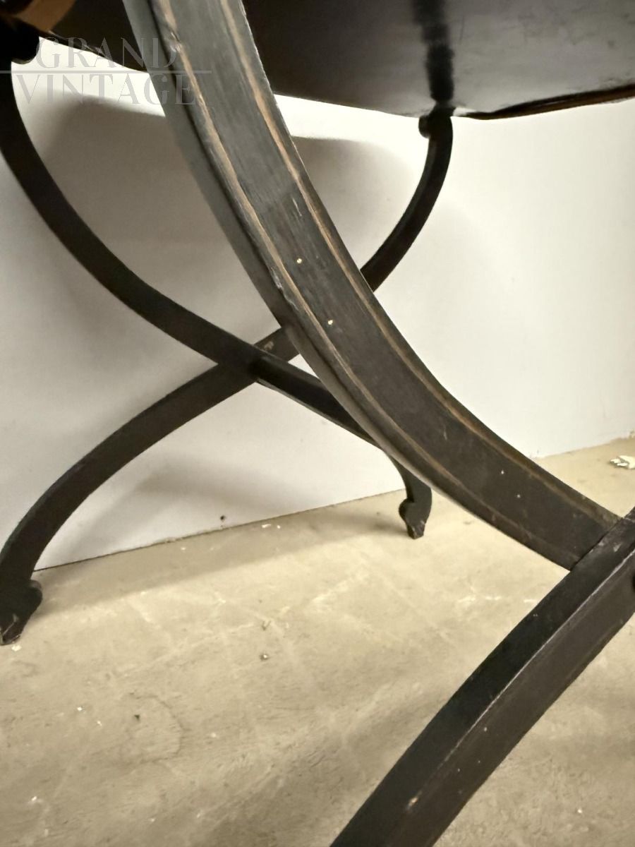 Small antique folding picnic table from 1850 in black lacquered wood with gold inserts, the top is a tray with an elegant wavy shape and is enriched by a painting of a classical scene on the top, 52 x 56 x 64cm.