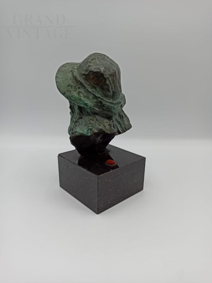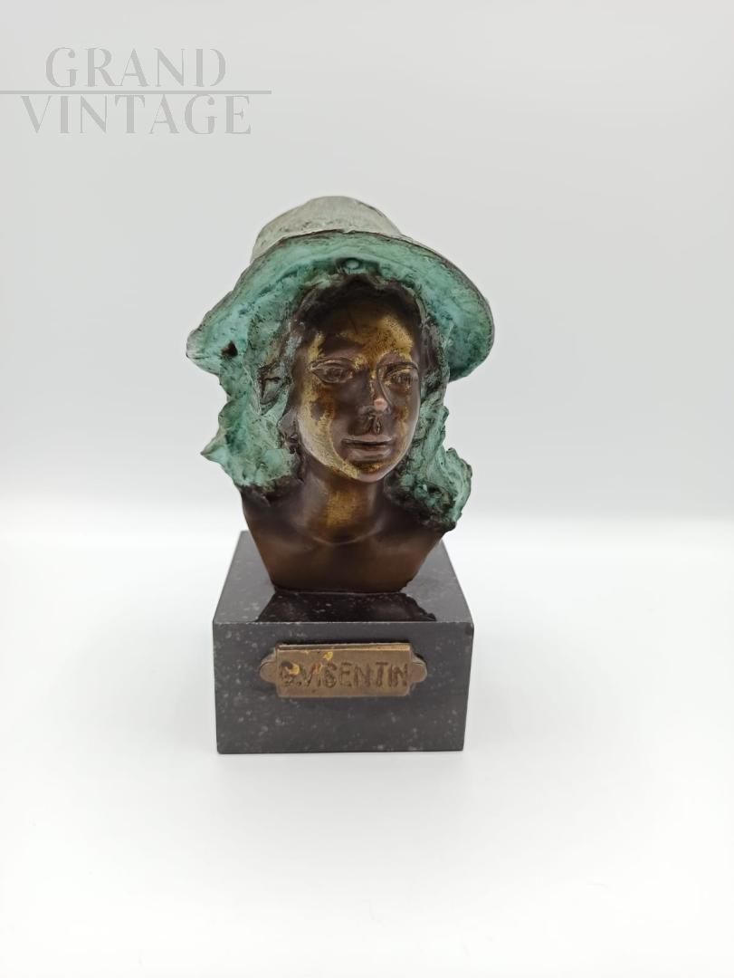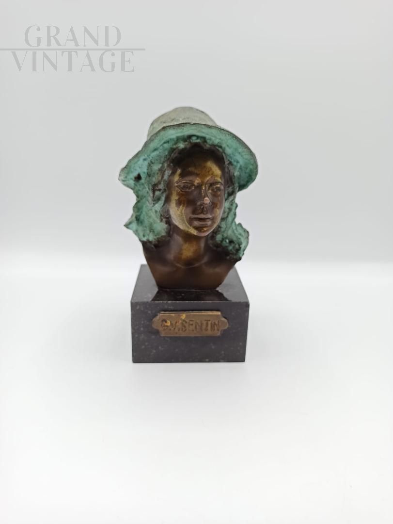 Small bronze sculpture bust of a woman with hat by Gianni Visentin.