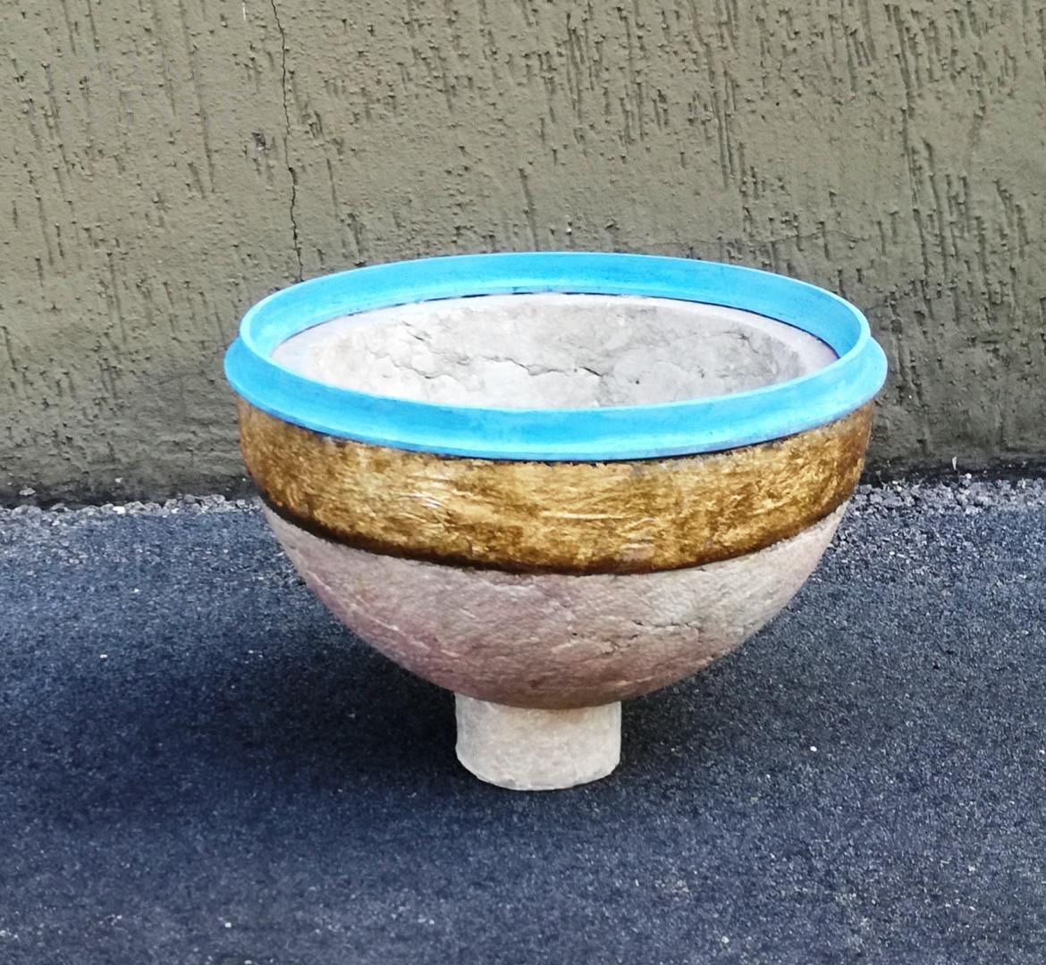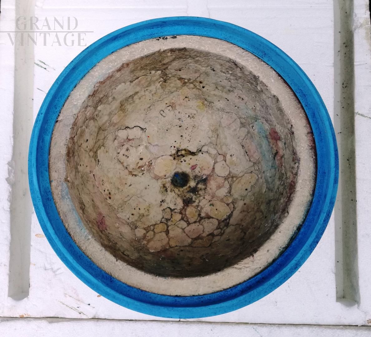 Small holy water stoup in Jerusalem stone, originally chipped and ruined, was transformed into a sculpture by the master Valter Berni, whose intervention made it possible to create a small jewel of art. The bowl is decorated with gold leaf covering the upper edge, and has an iron ring painted in an oxidized copper colour. The bowl is very heavy, weighing approximately 6 kg. The base is an addition wanted by Maestro Berni.