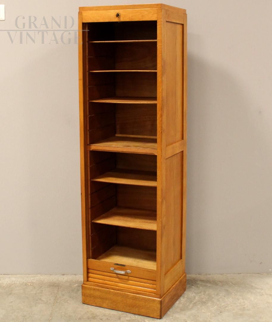 Small office bookcase filing cabinet with single rolling shutter in oak