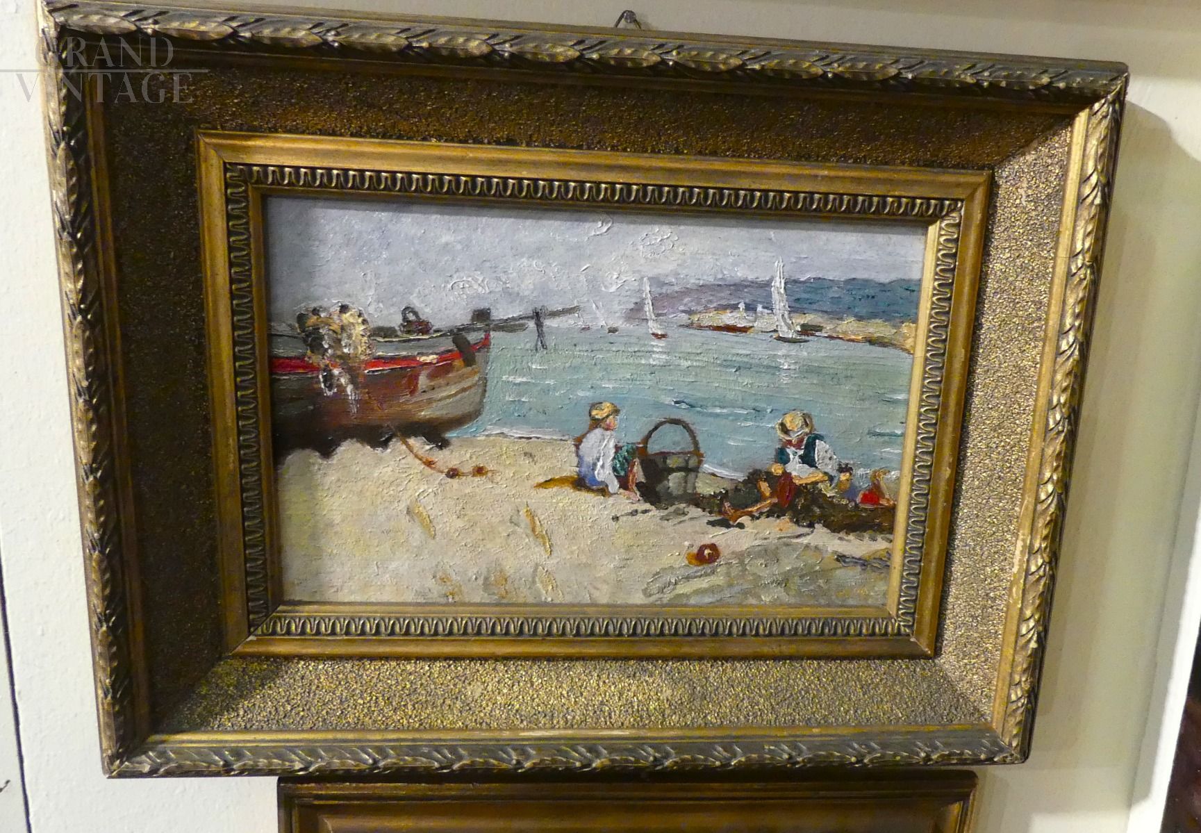 Marine painting with subjects on the beach and sailing boats, oil on panel of small dimensions and with bright colors, particularly suitable for a kids bedroom. The painting is unsigned and comes complete with frame.
