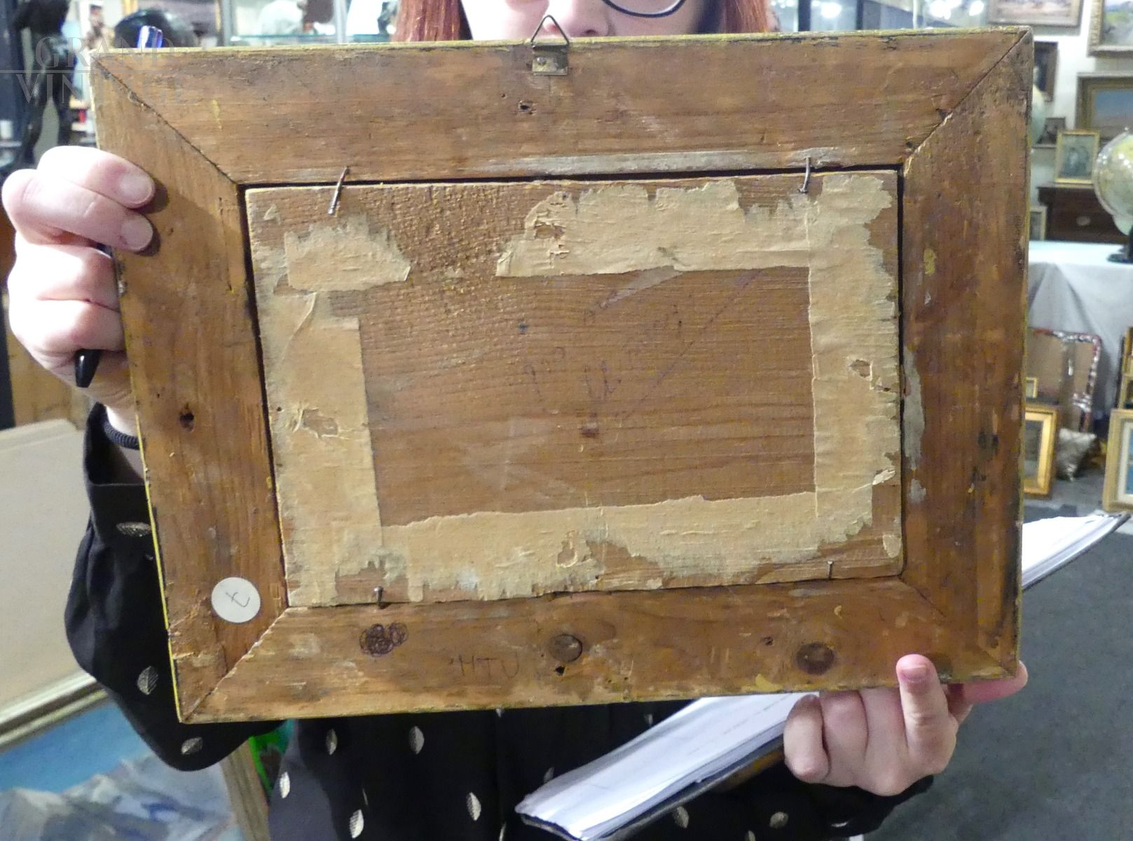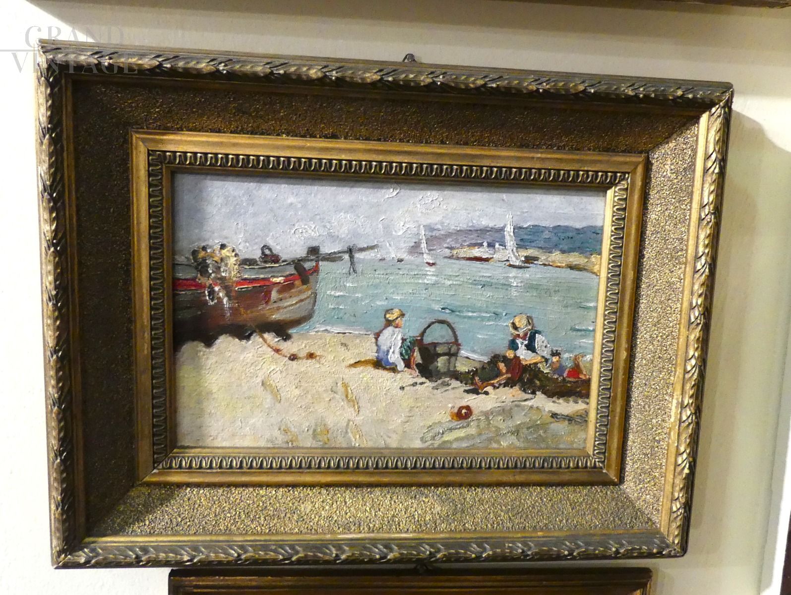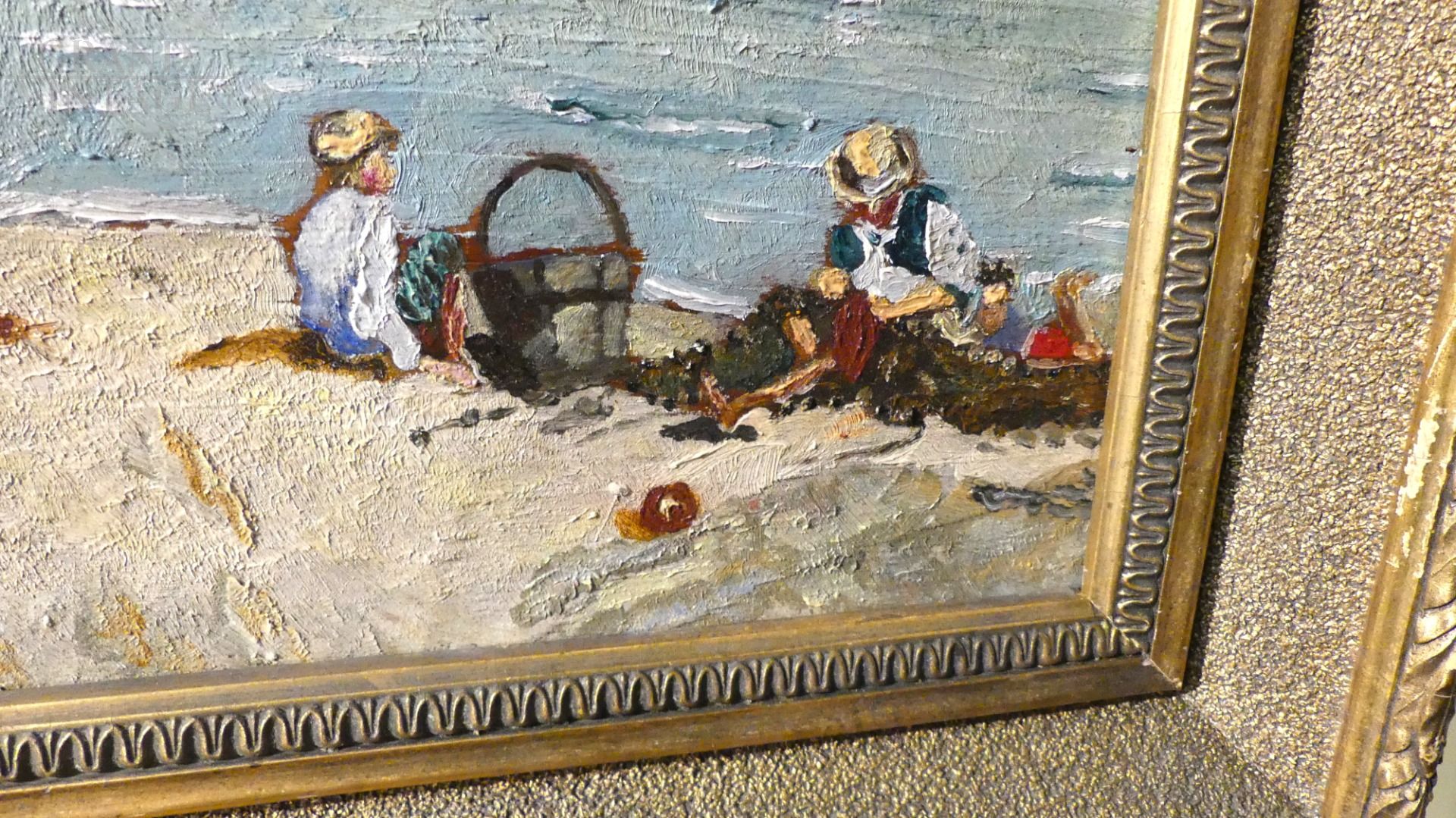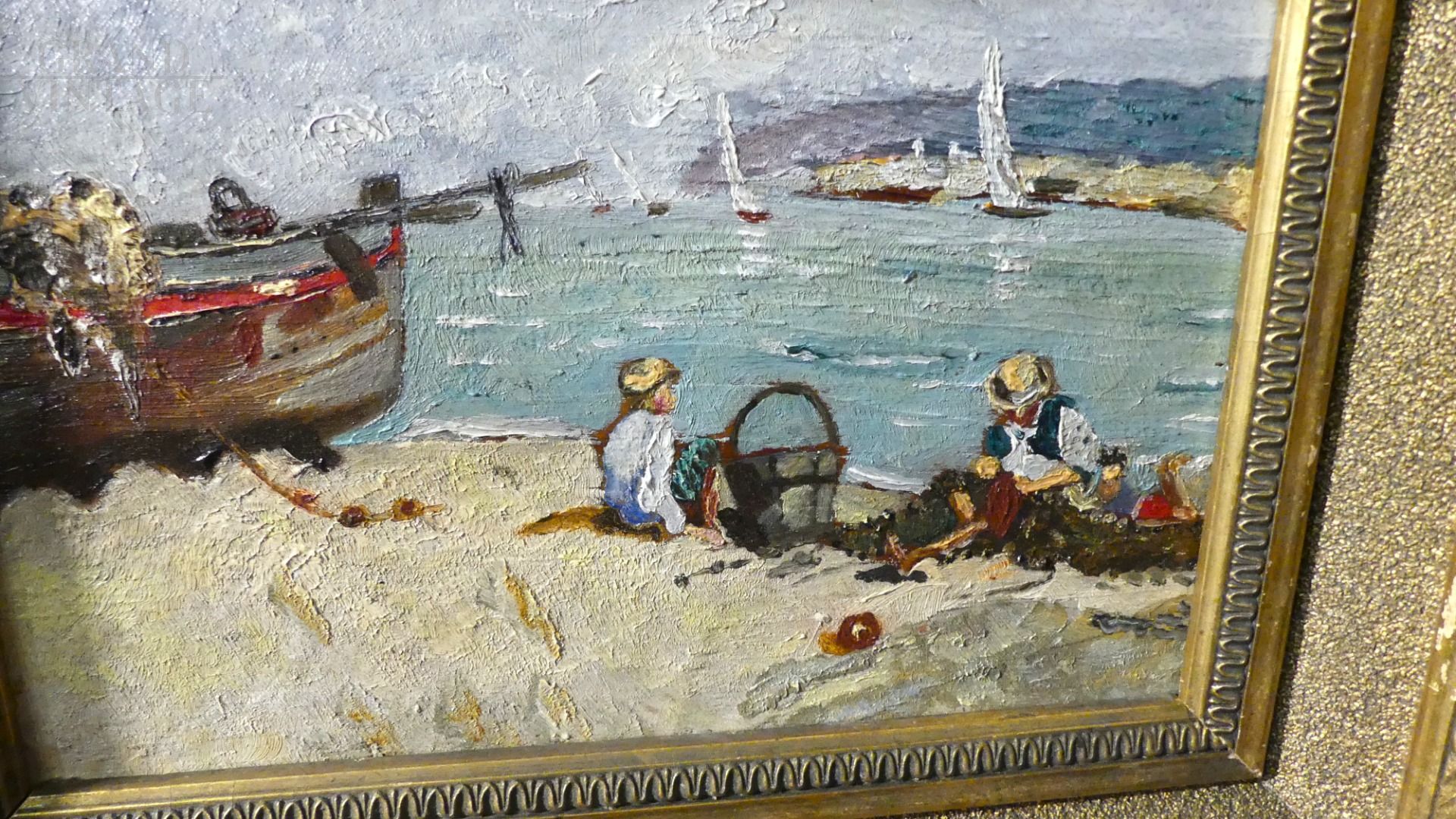 Small painting of a beach scene with characters