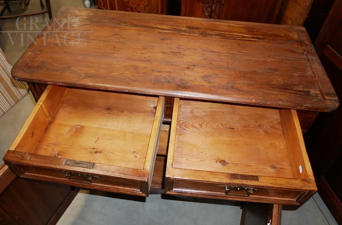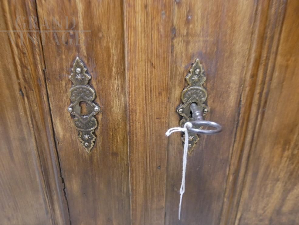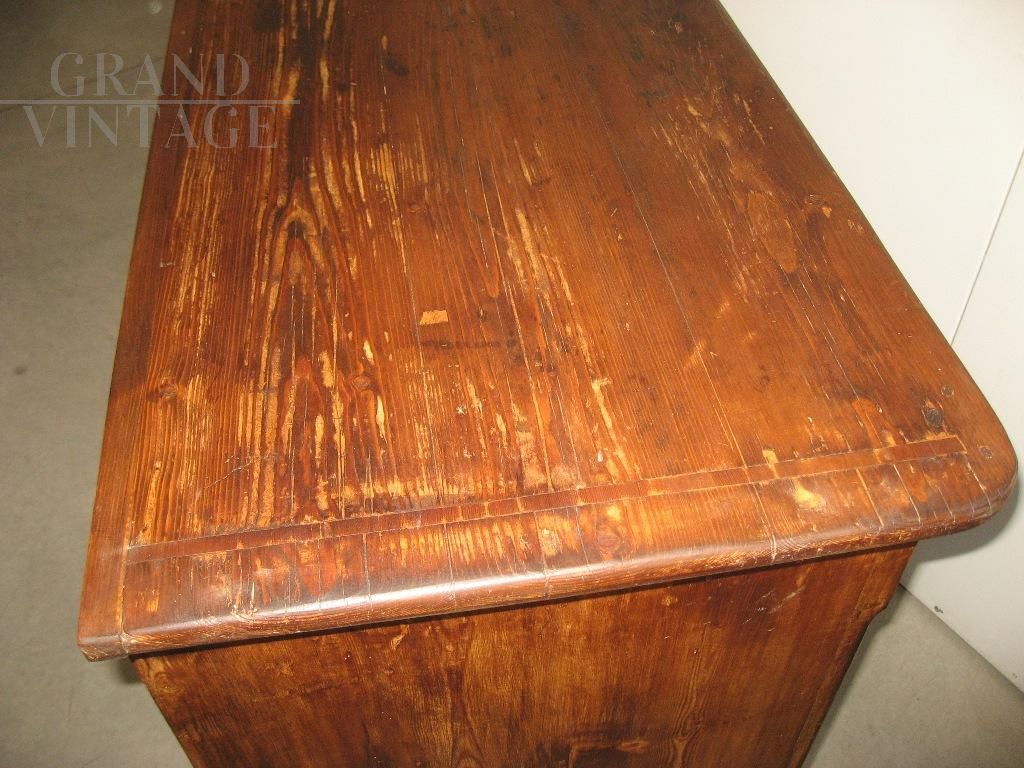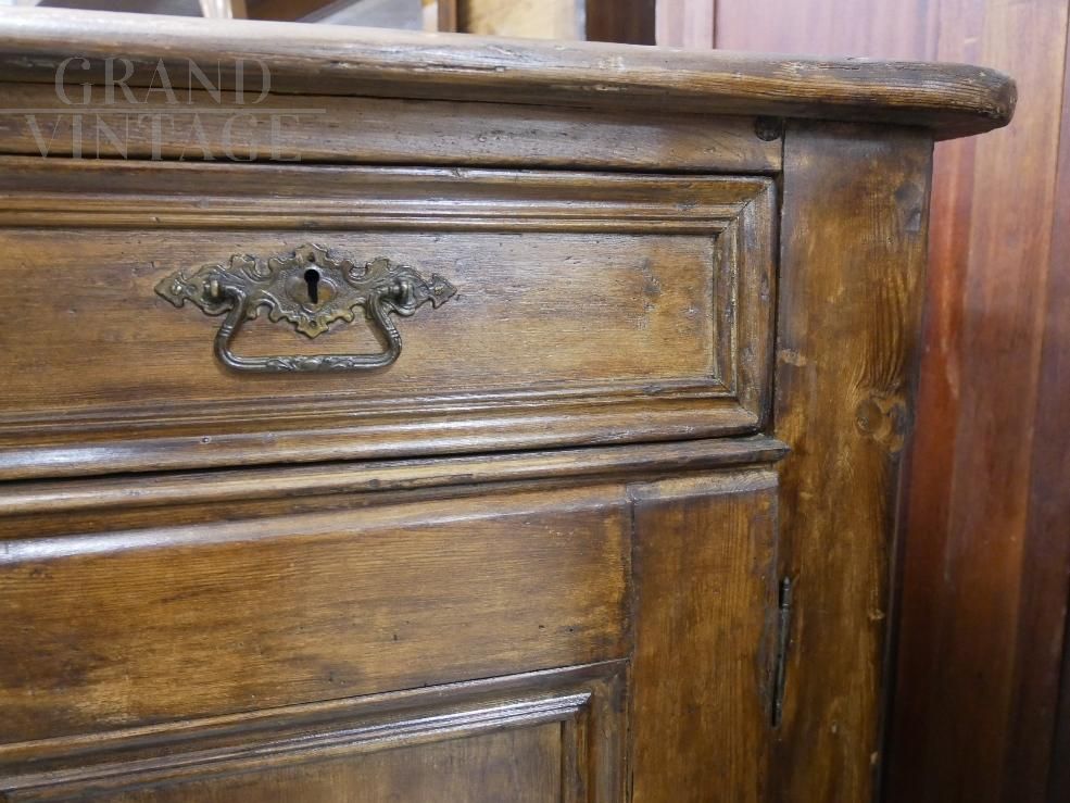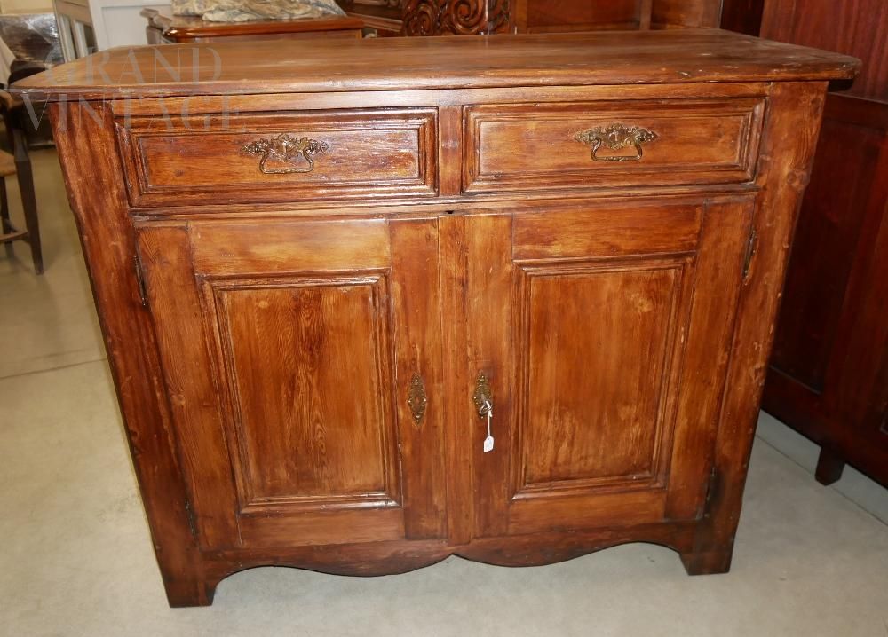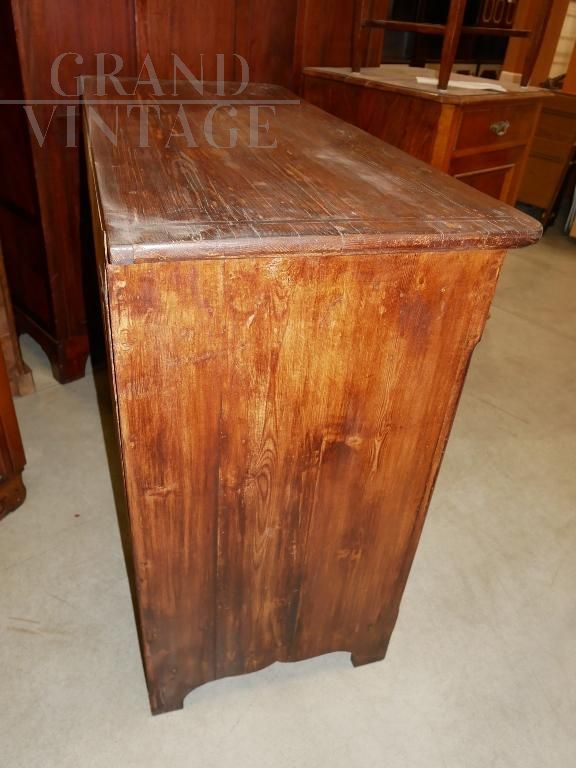 Antique rustic sideboard in solid pine from the late 19th century, from Northern Europe, with two doors and two drawers, it has been restored and dyed in dark wood tones with various light streaks.