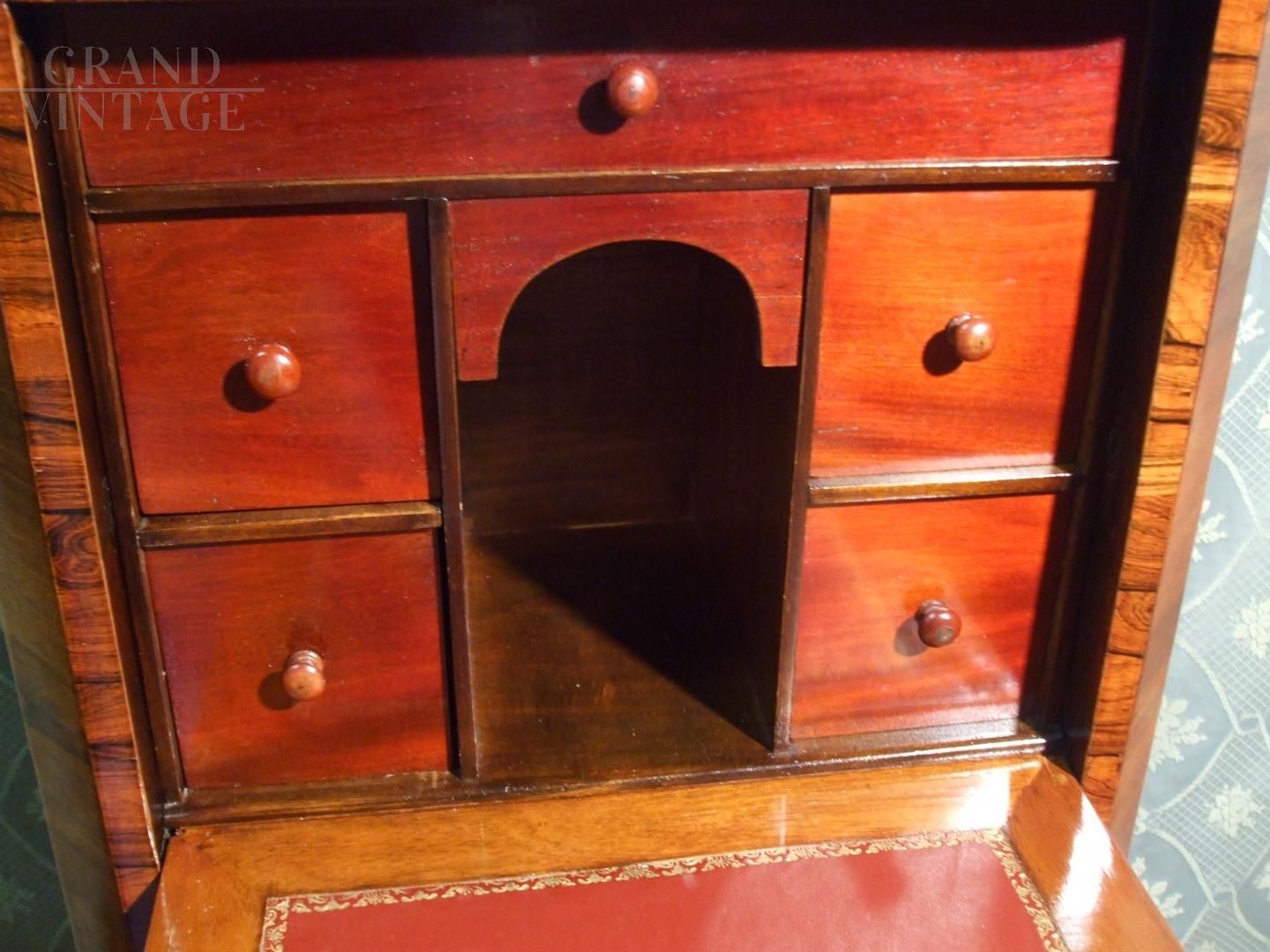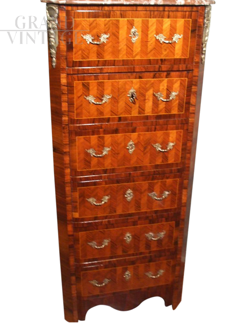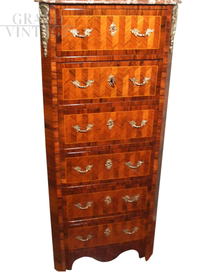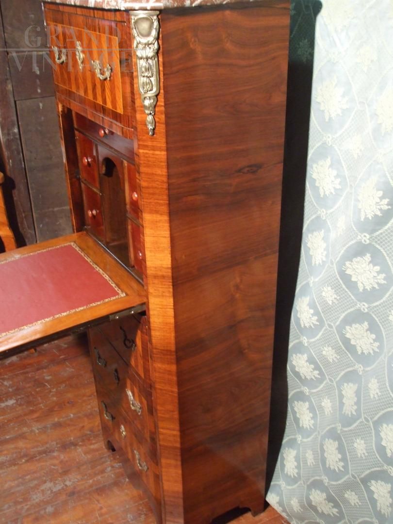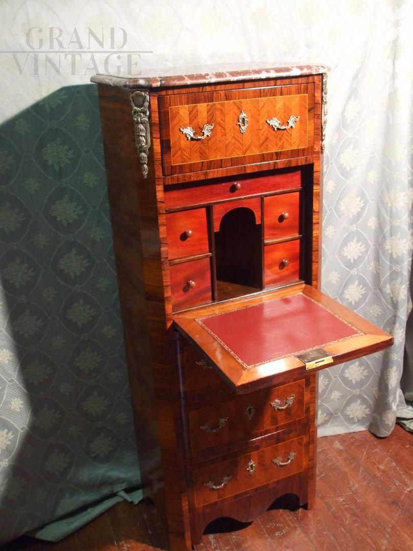 Small secretaire veneered in rosewood, bois de rose and boxwood, herringbone pattern on the drawers. The beautiful bronzes make it precious and refined. France red marble top. Internal top is lined in bordeaux goatskin finished in hot-stamped gold. The small size makes it particularly rare and adaptable to any environment.