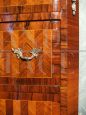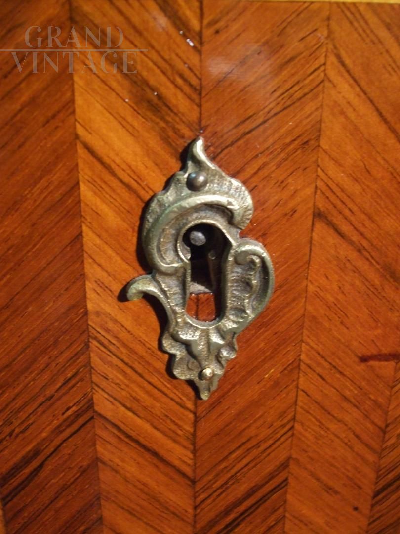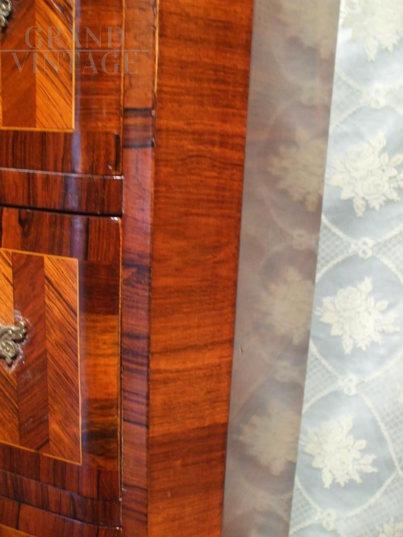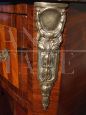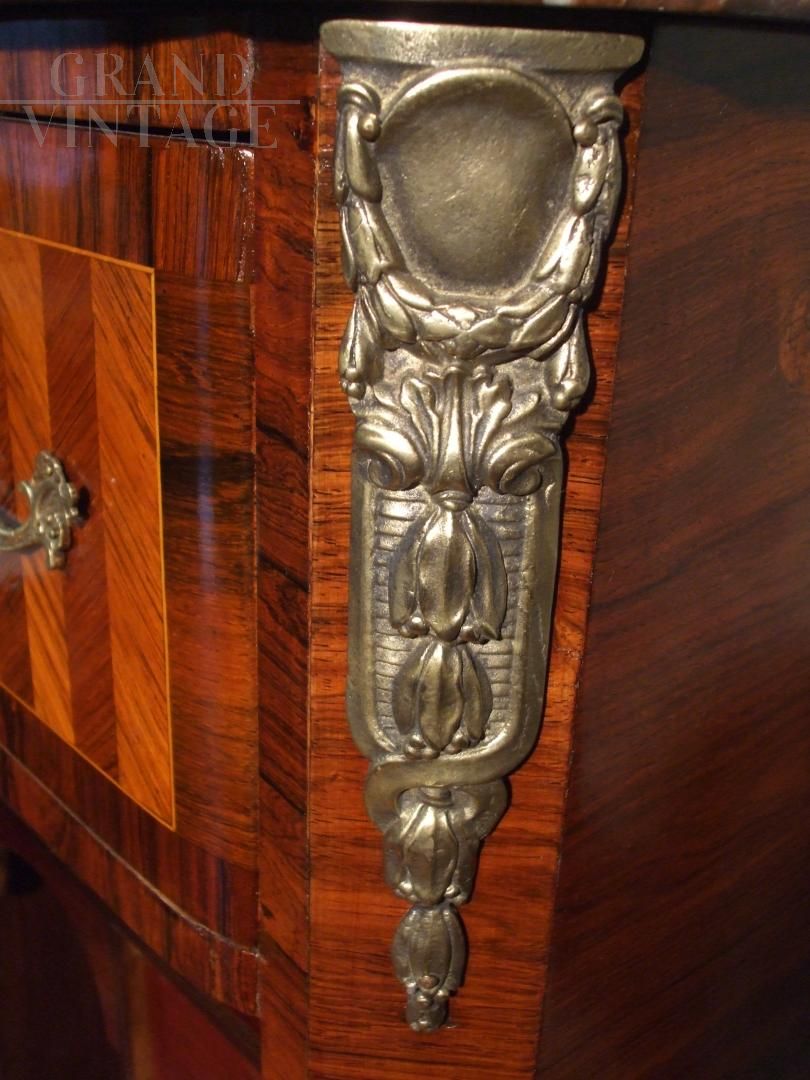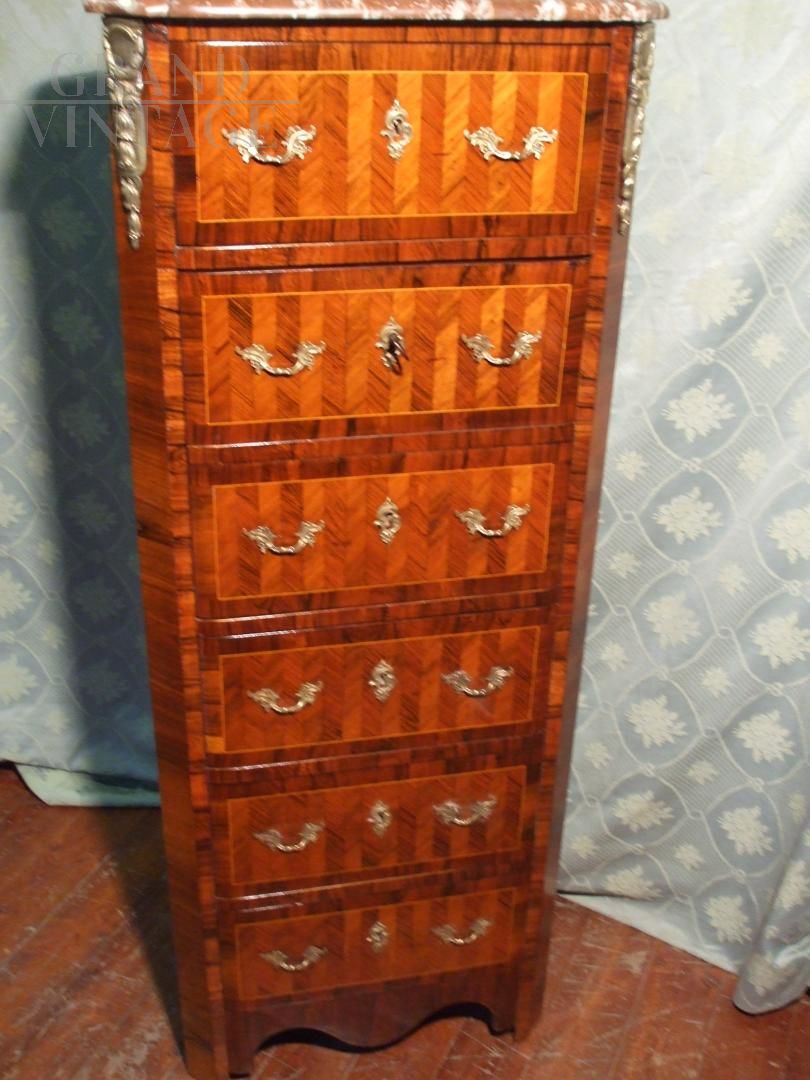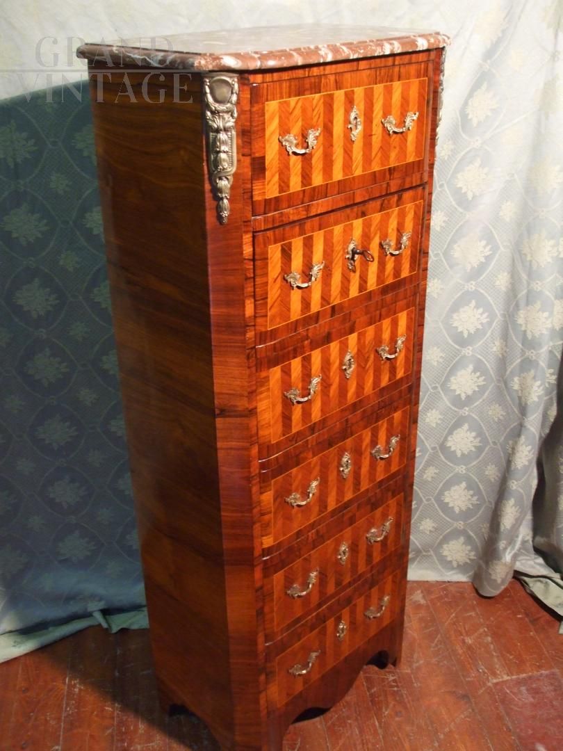 Small secretaire veneered in rosewood, bois de rose and boxwood, herringbone pattern on the drawers. The beautiful bronzes make it precious and refined. France red marble top. Internal top is lined in bordeaux goatskin finished in hot-stamped gold. The small size makes it particularly rare and adaptable to any environment.