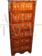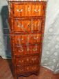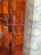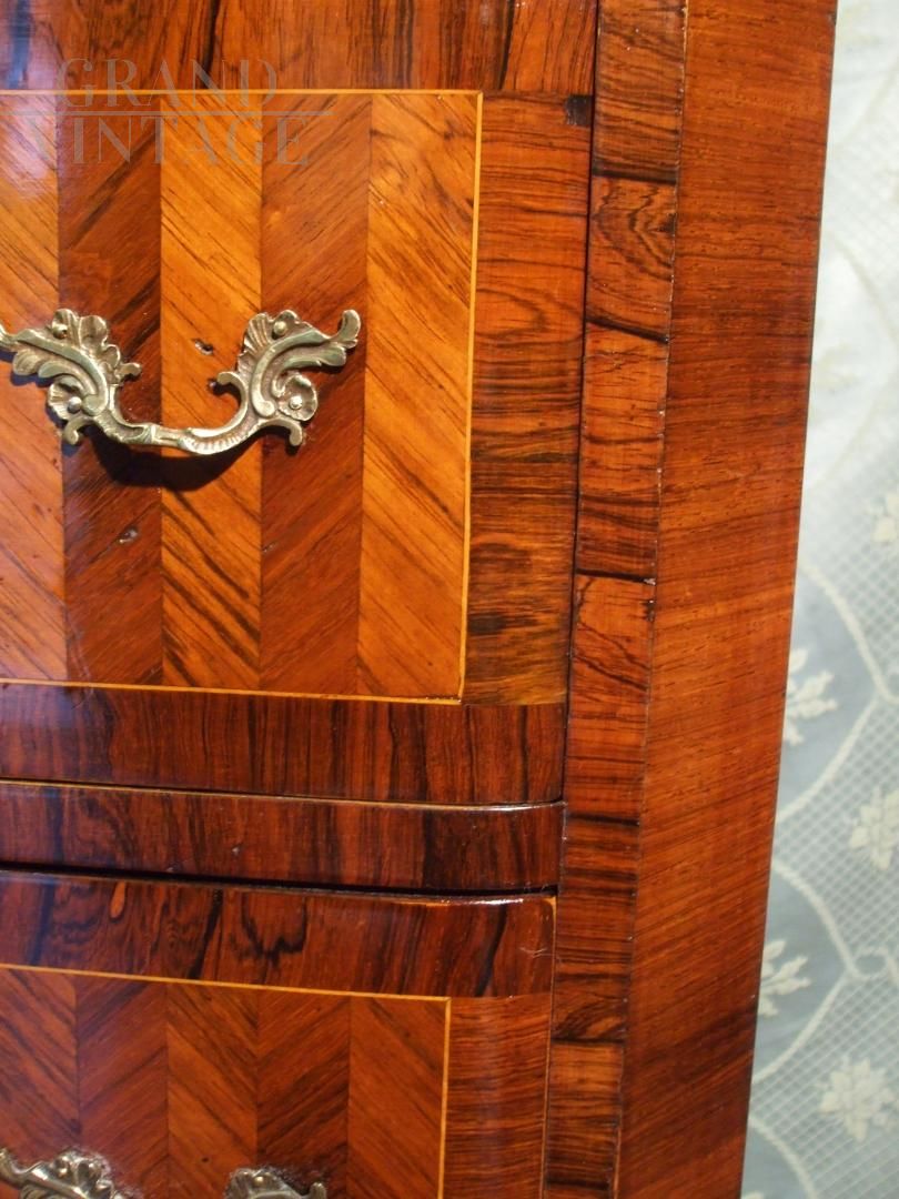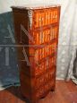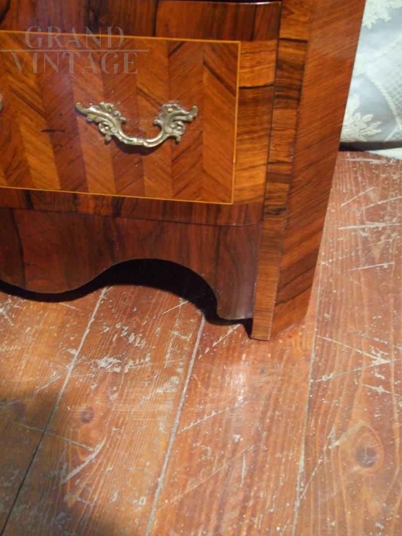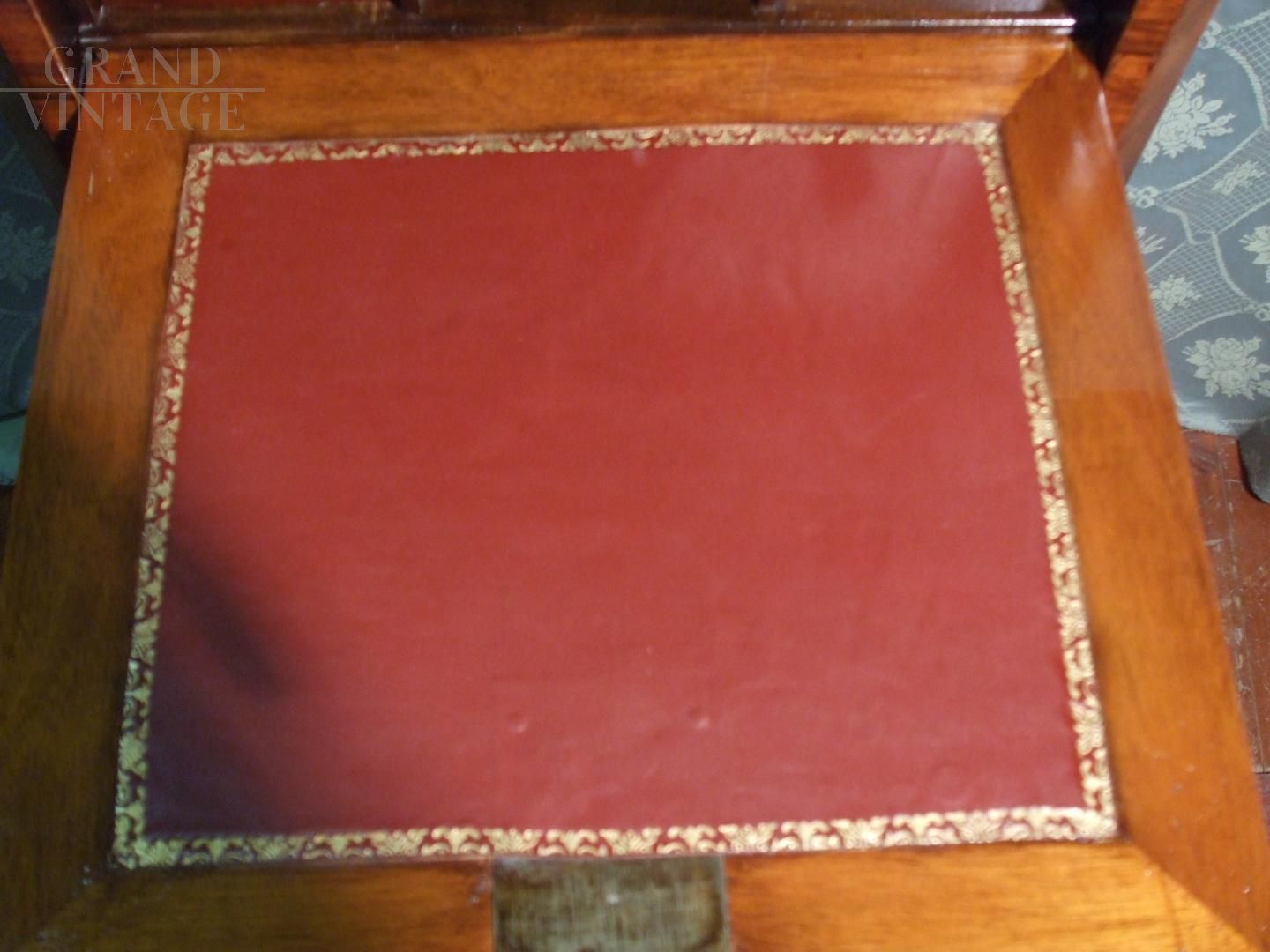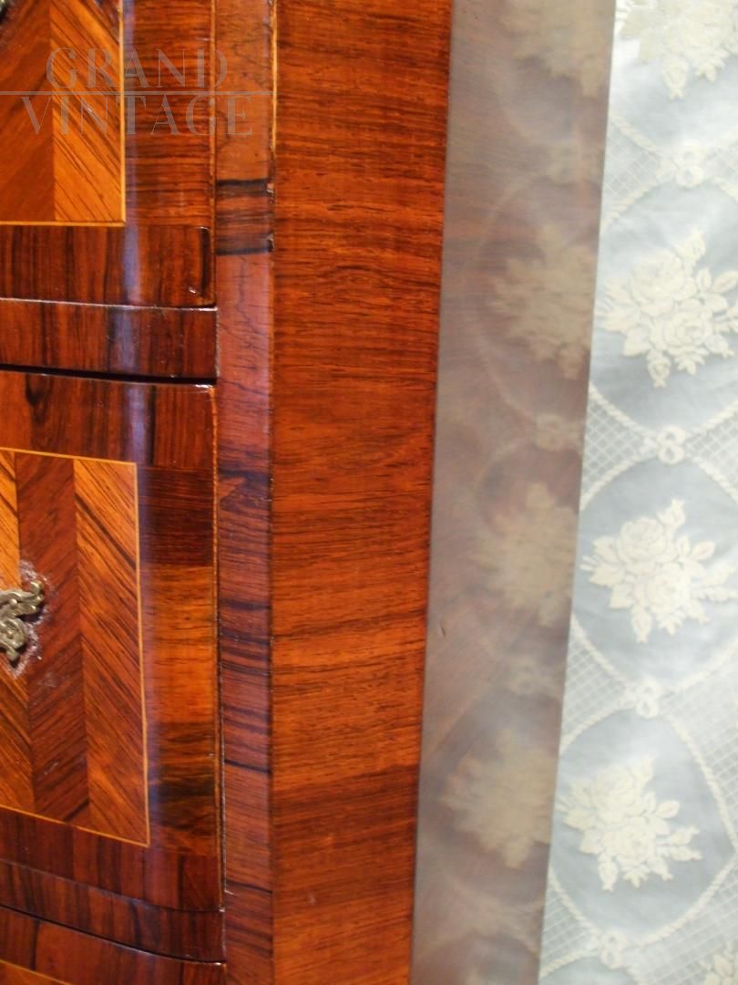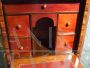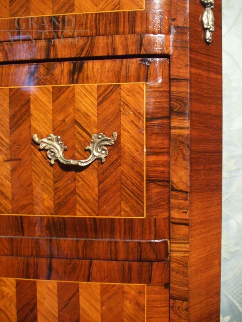 Small secretaire veneered in rosewood, bois de rose and boxwood, herringbone pattern on the drawers. The beautiful bronzes make it precious and refined. France red marble top. Internal top is lined in bordeaux goatskin finished in hot-stamped gold. The small size makes it particularly rare and adaptable to any environment.