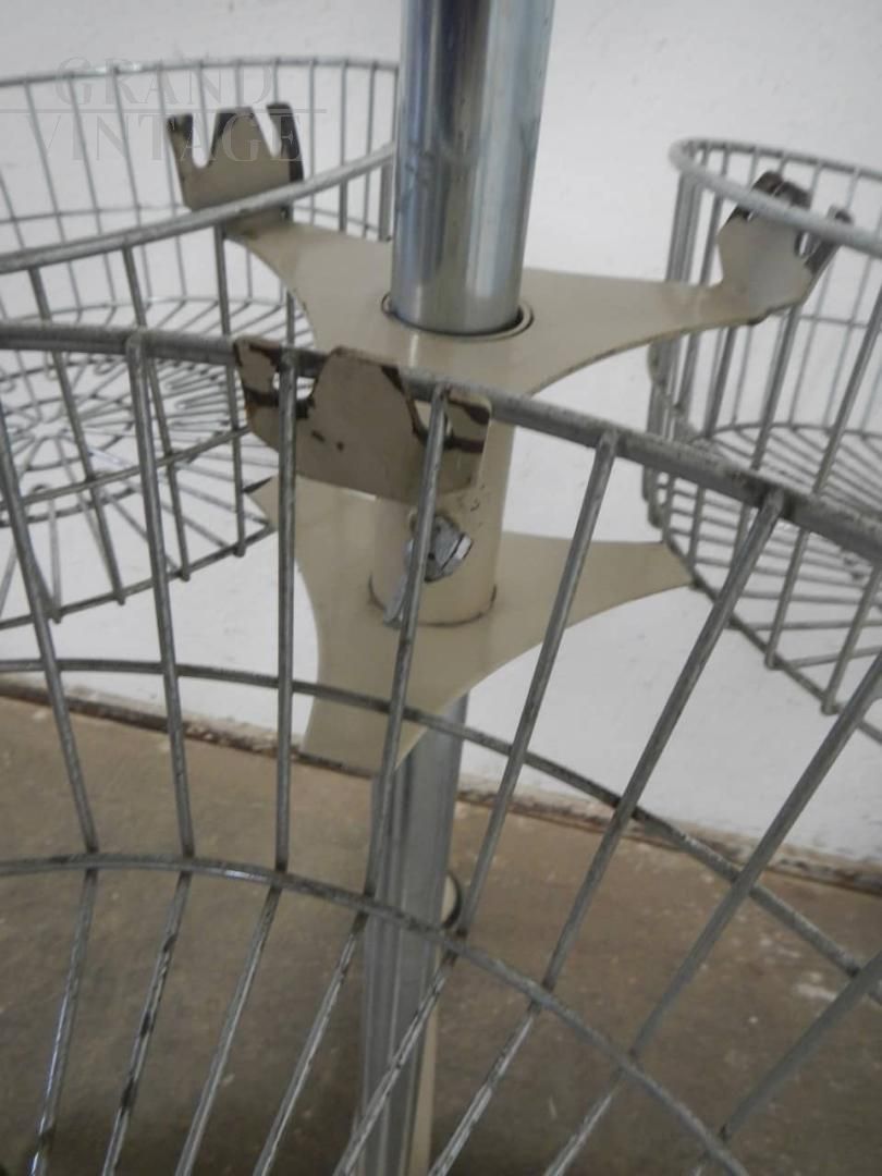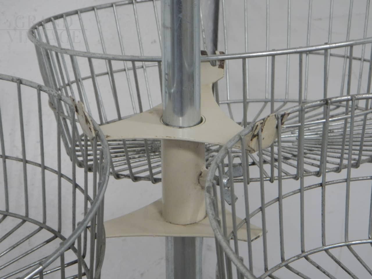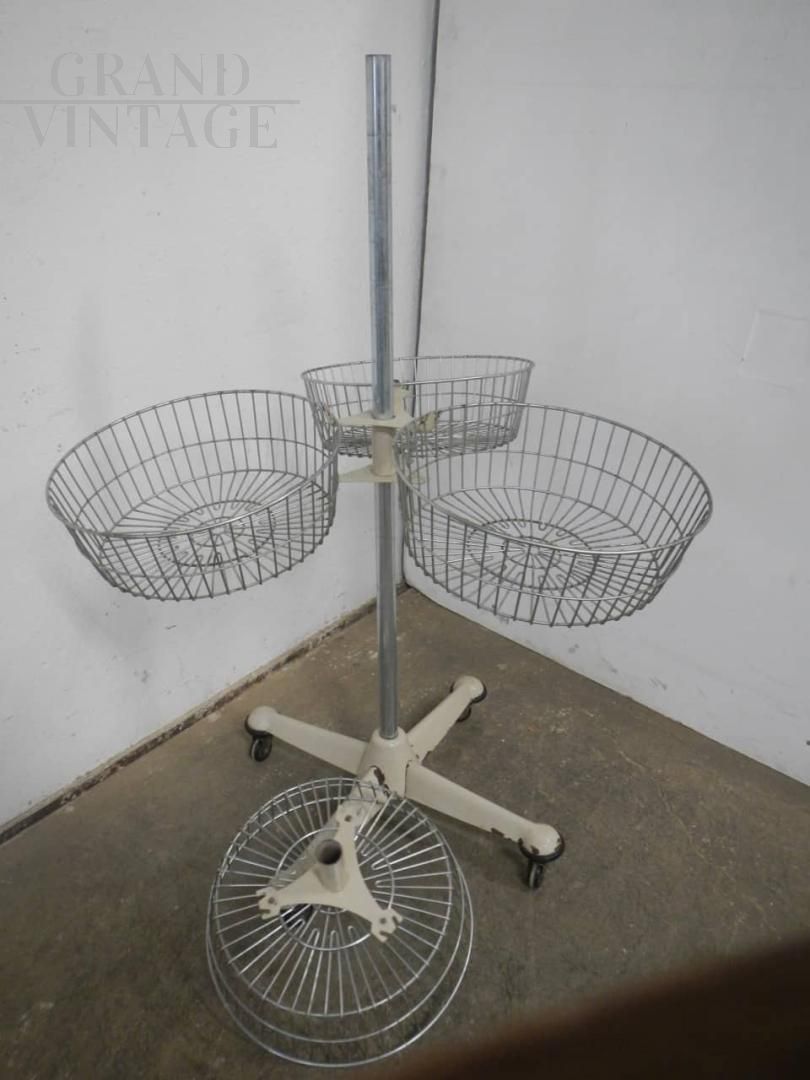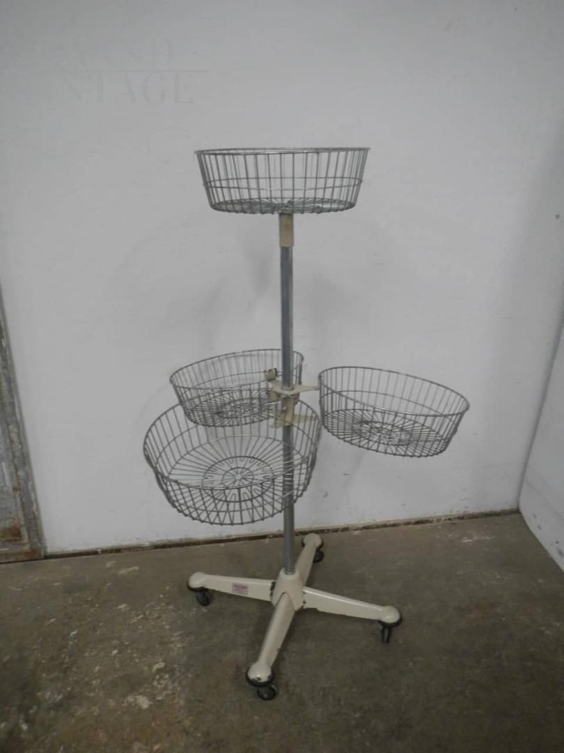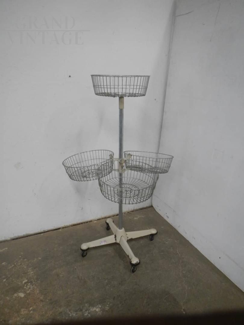 Small shop display trolley in beige lacquered iron with 4 iron mesh storage baskets with a diameter of 36 cm and a height of 13 cm. In good condition with signs of use, in some parts the enamel has come off, as shown in the photo. The trolley is height adjustable and is equipped with wheels, the upper basket can be removed. Produced by Zenith Brevetti Sarezzo (Milan) Italy.