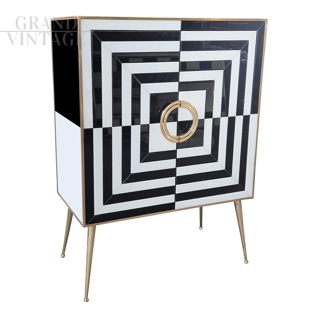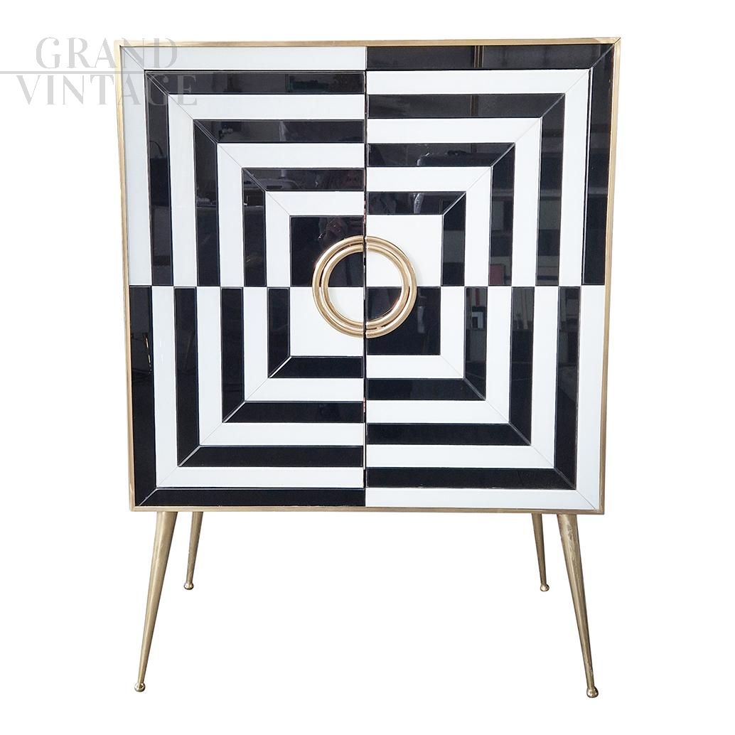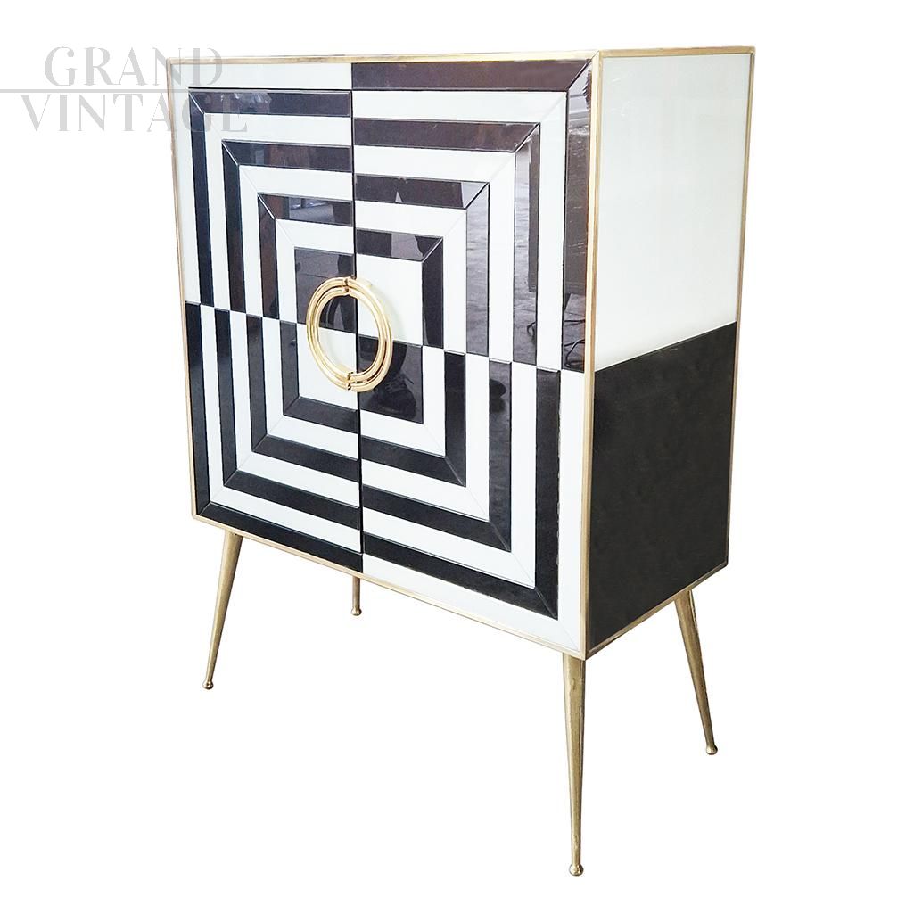Small sideboard bar cabinet in optical black and white glass and mirror