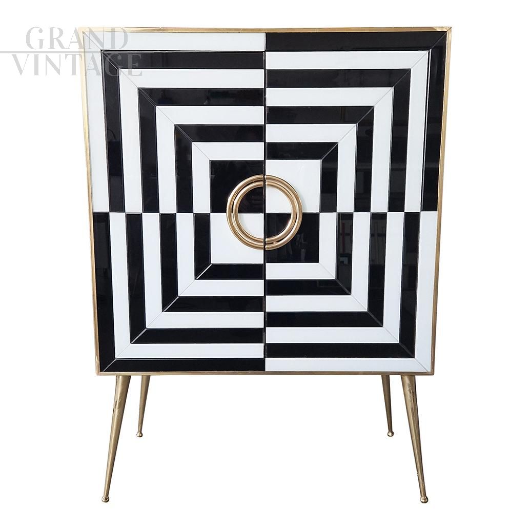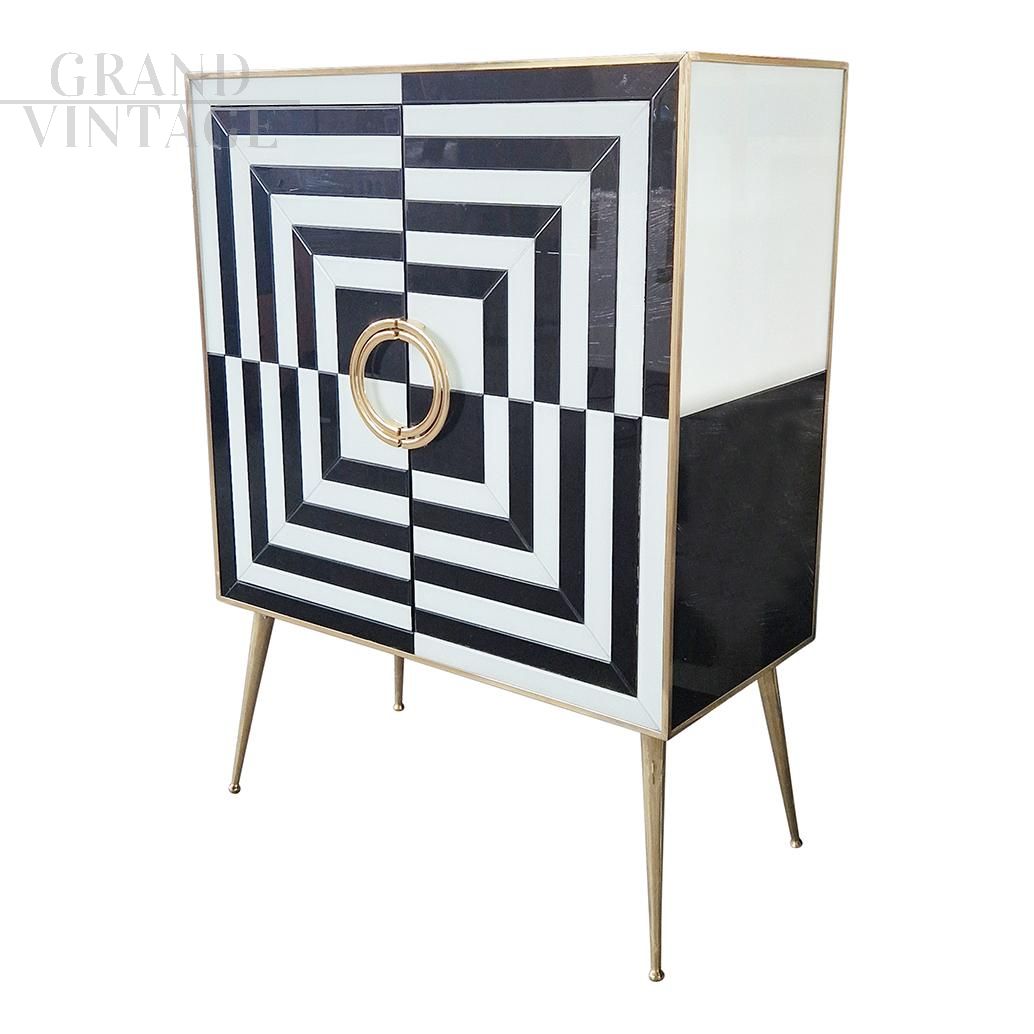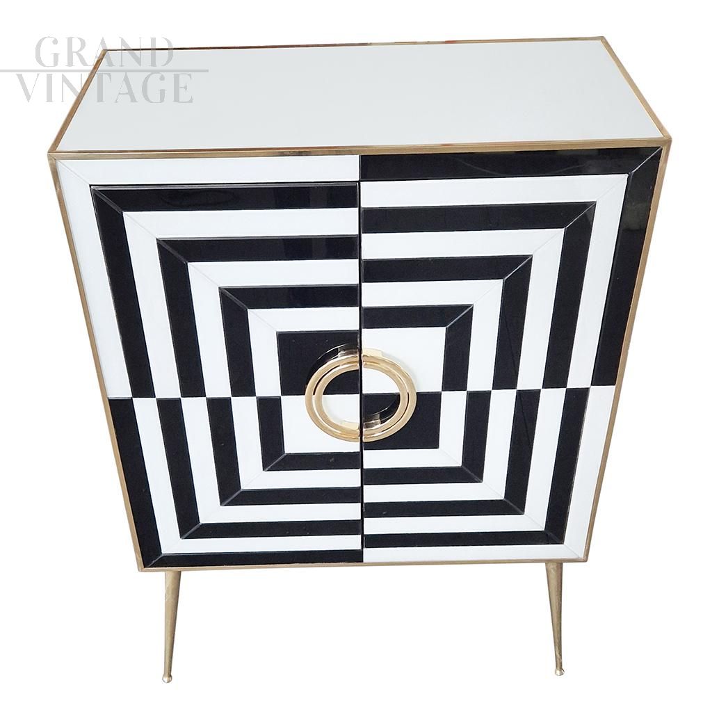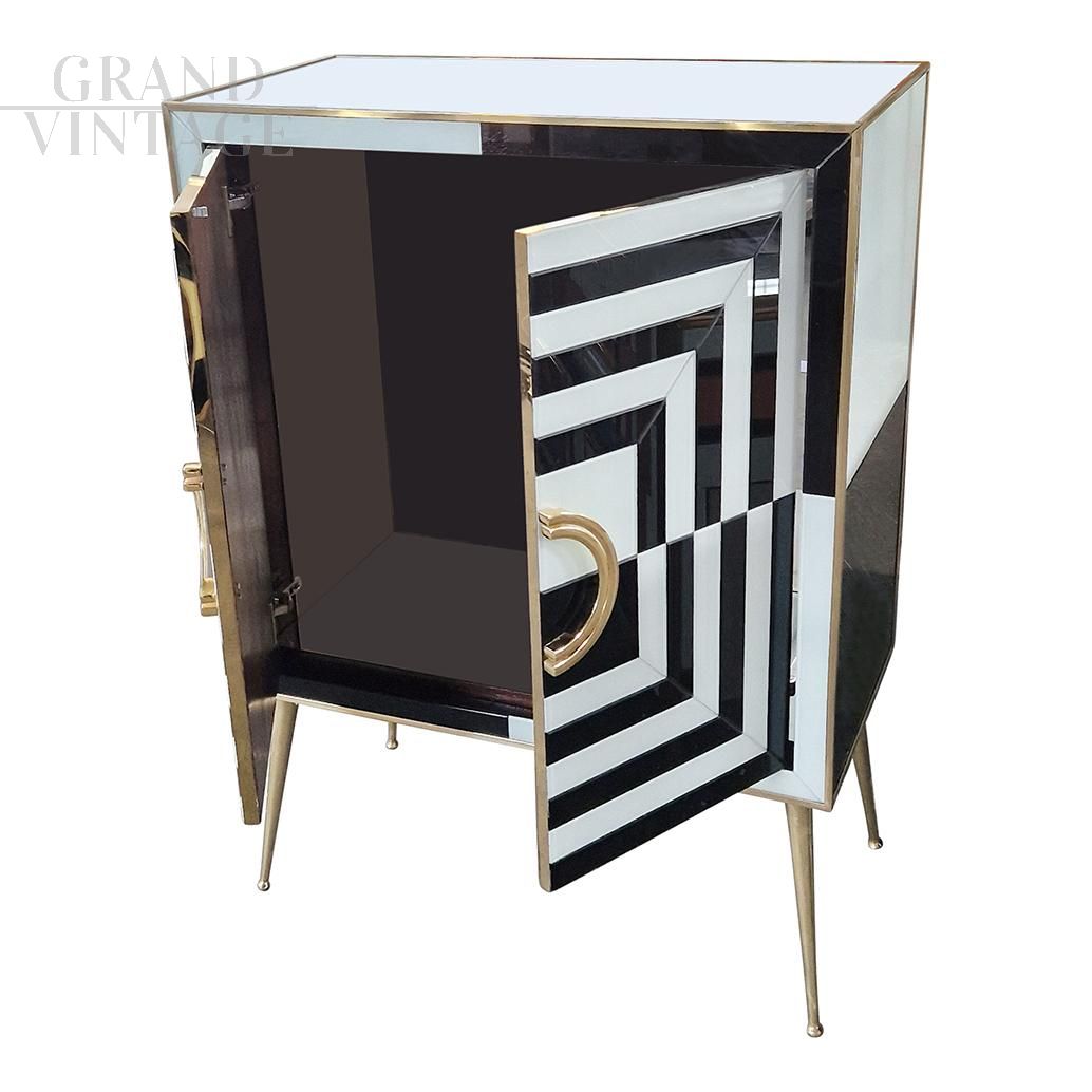 Small sideboard bar cabinet in optical black and white glass and mirror