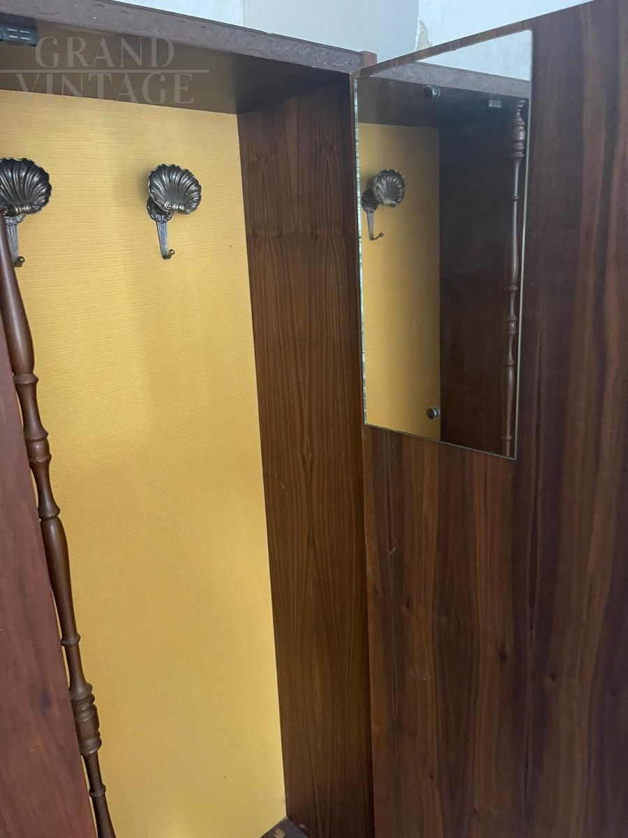 Rosewood entrance entryway wardrobe with two doors, Italy 1950s, with interior lined in yellow fabric, complete in the inside with two decorted clothes hangers and a mirror on the door.