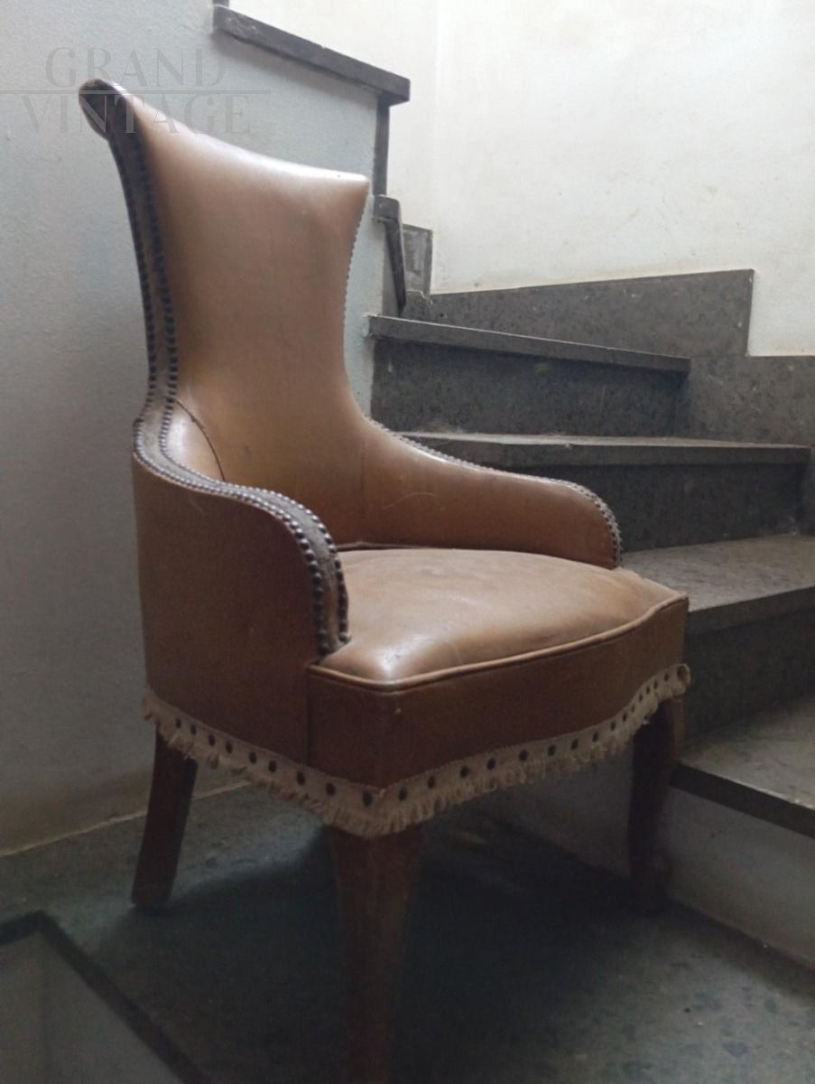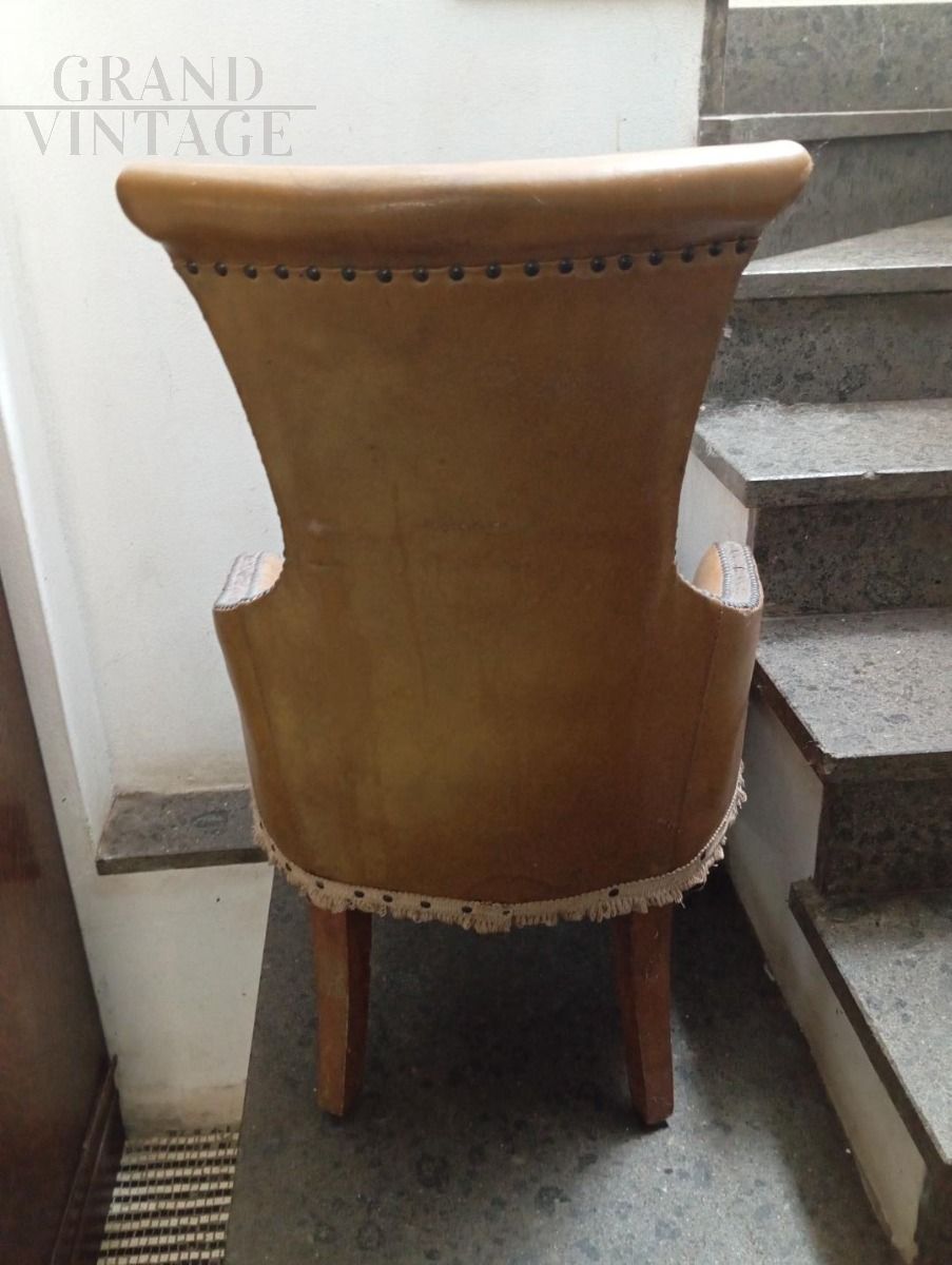 Small fireplace or bedroom armchair from the early twentieth century in its original dark yellow / beige leather, delightful in its simplicity, it retains the natural signs of age, as shown in the photo.