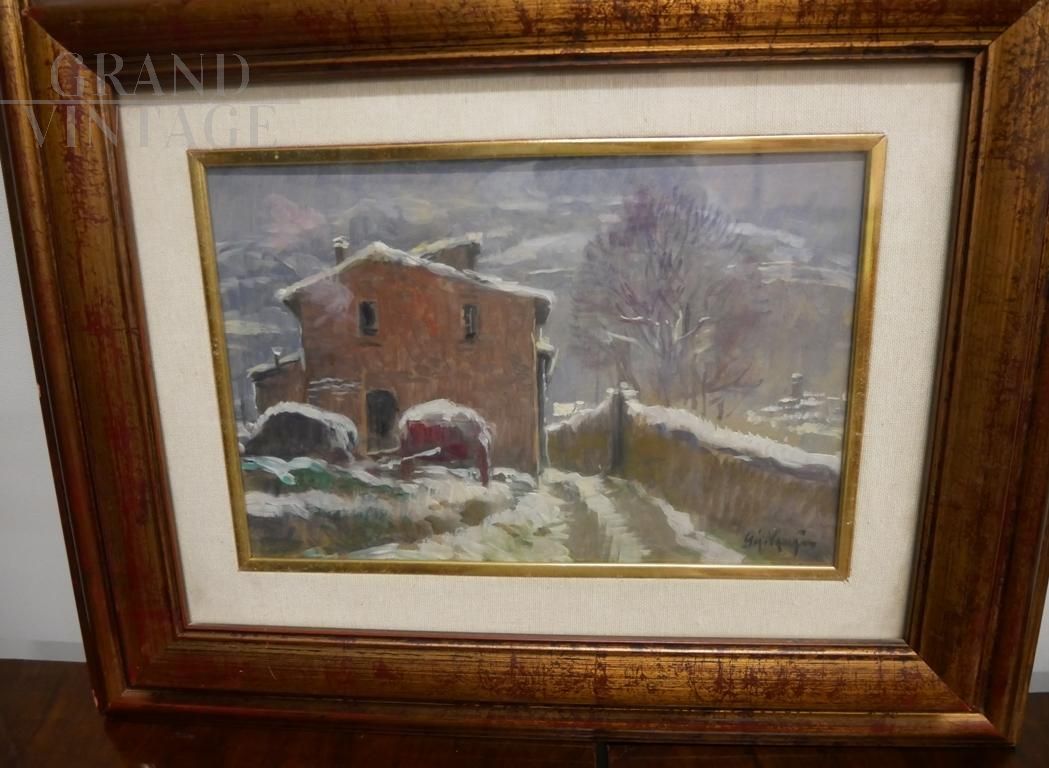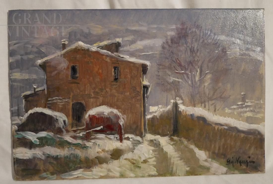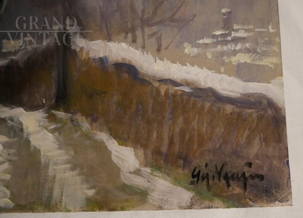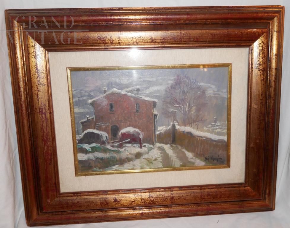 Snowy landscape, oil painting on cardboard, 20th century, signed