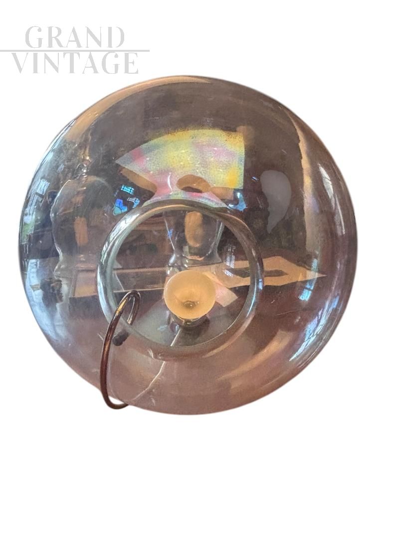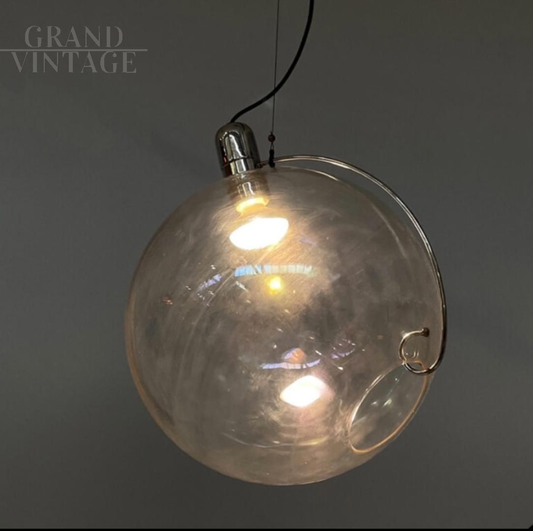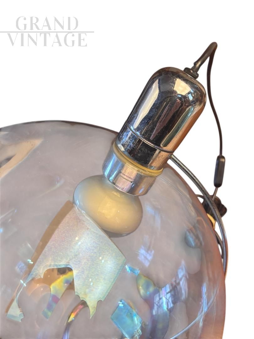 Sona chandelier pendant light by Carlo Nason for Lumenform with adjustable spherical lampshade in iridescent glass, produced in Italy around 1970. On one side the diffuser has a hole, on the other the bulb. From the bulb to the hole there is a curved structure in chromed metal rod, which allows you to change the inclination of the pendant lamp. Cylindrical metal ceiling attachment.
