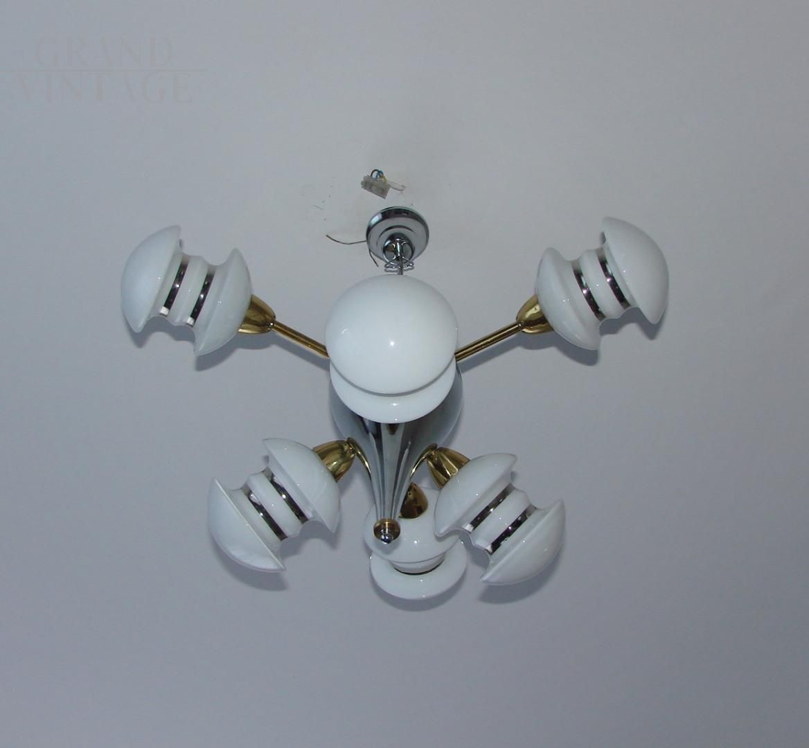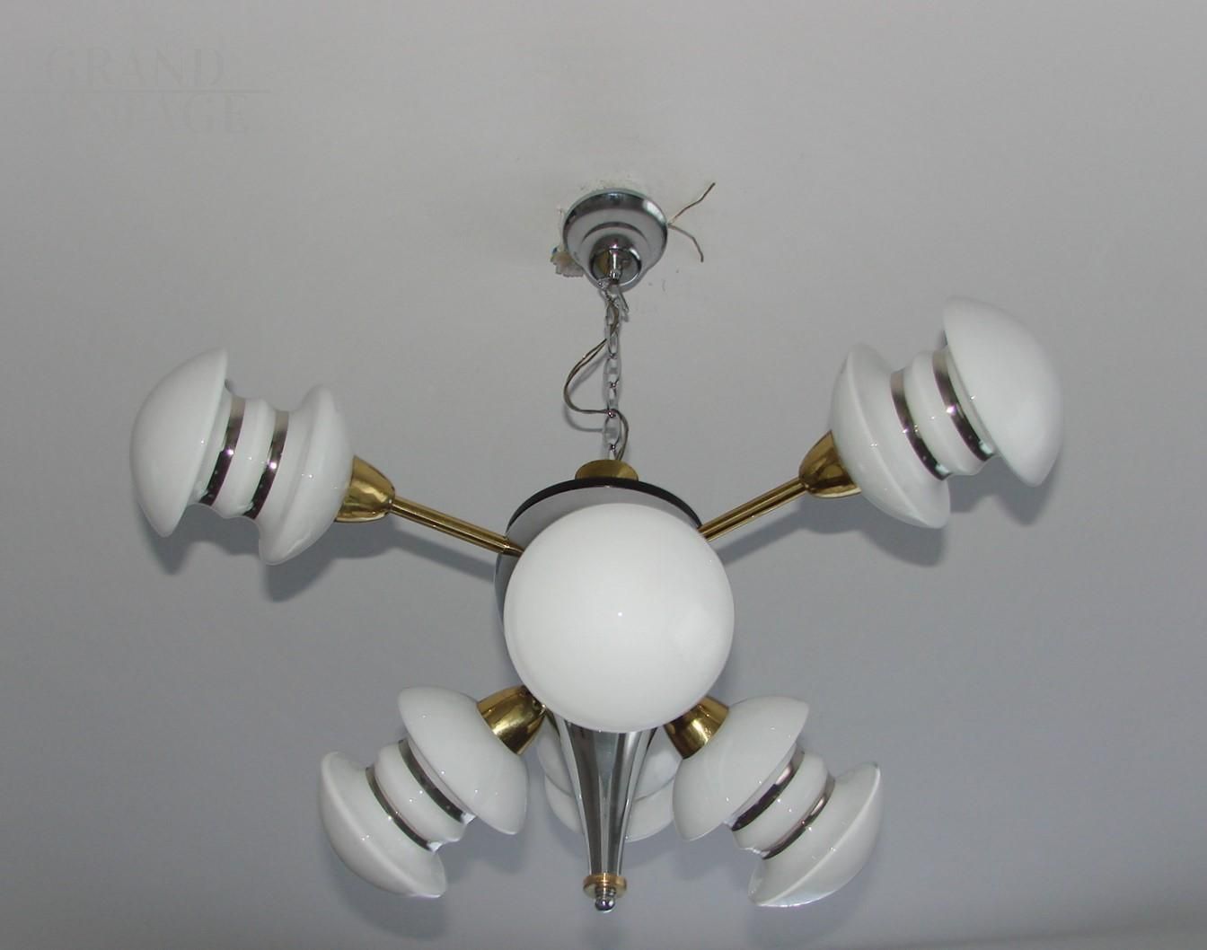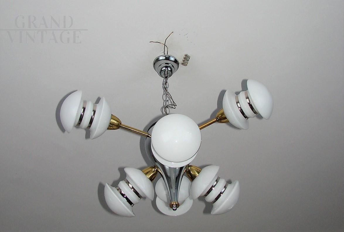 Space age 60s chandelier with chromed metal structure and 6 white glass lampshades. The chandelier needs 6 bulbs with E14 socket.