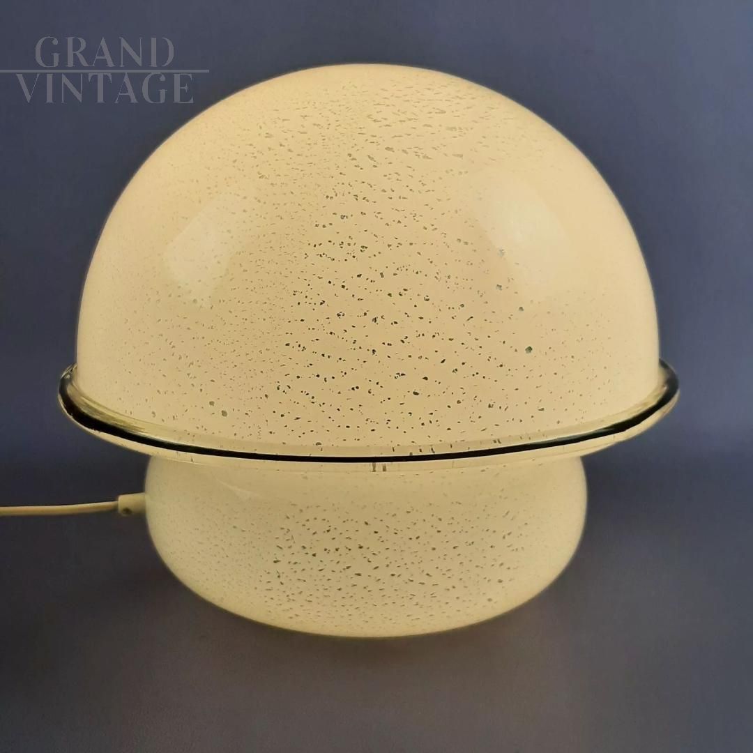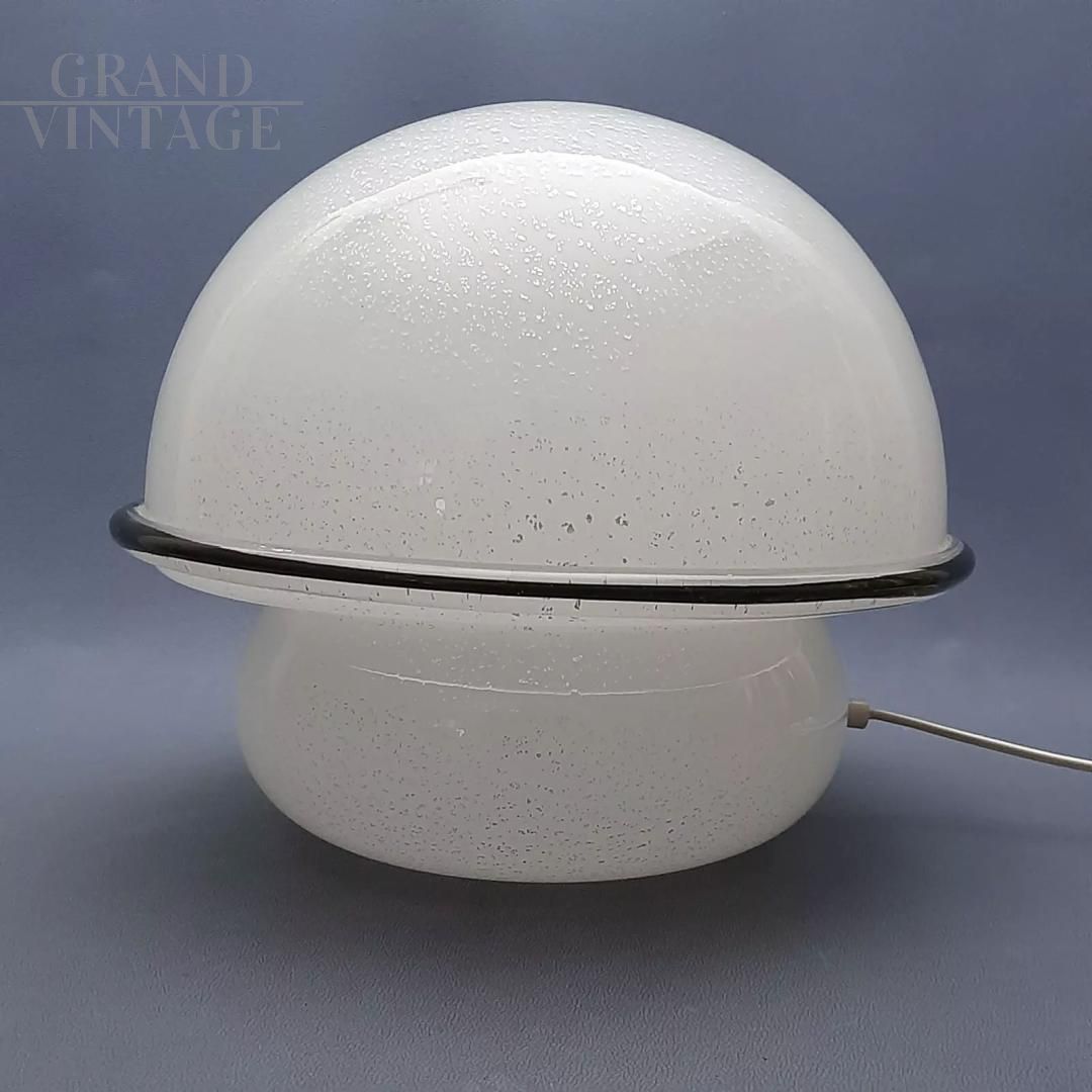 Spectacular large mid-century modern Italian table lamp, with particular mushroom design in Space Age style, in shiny opaline white Murano glass with details in submerged silver. Excellent Italian manufacturing, very scenic and rare. Excellent general storage conditions. Completely worked and finished by hand in Italy in the 1970s. Ideal for collectors and enthusiasts, or as a gift idea.