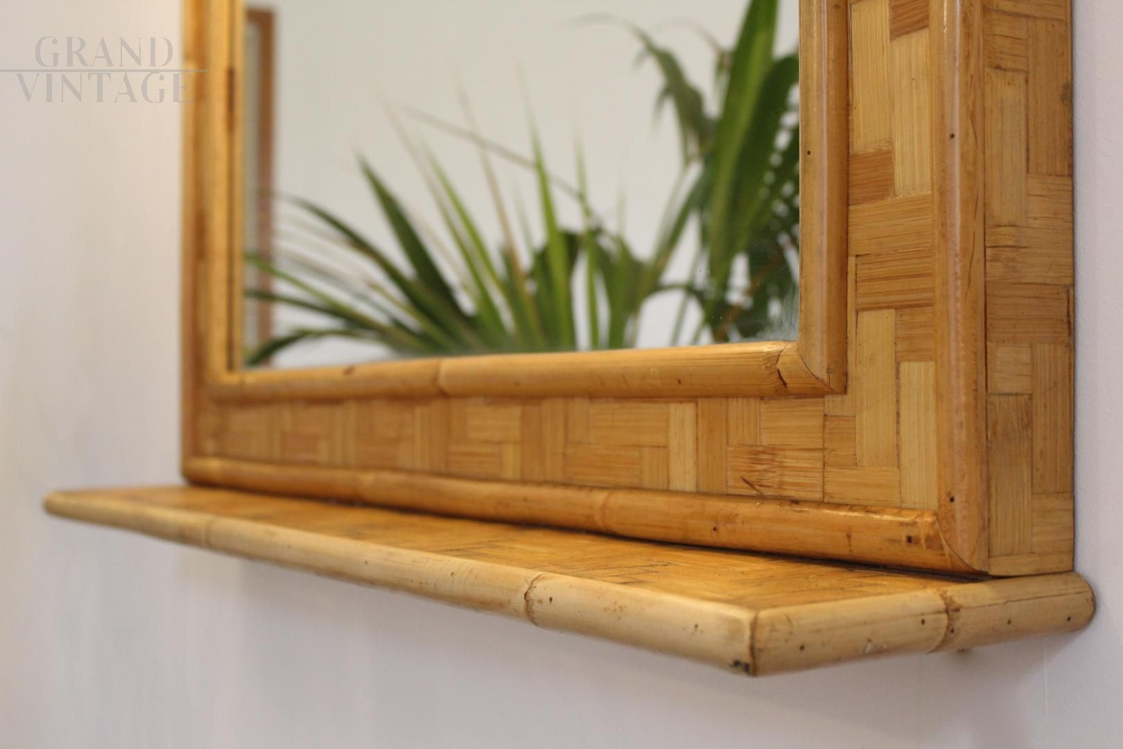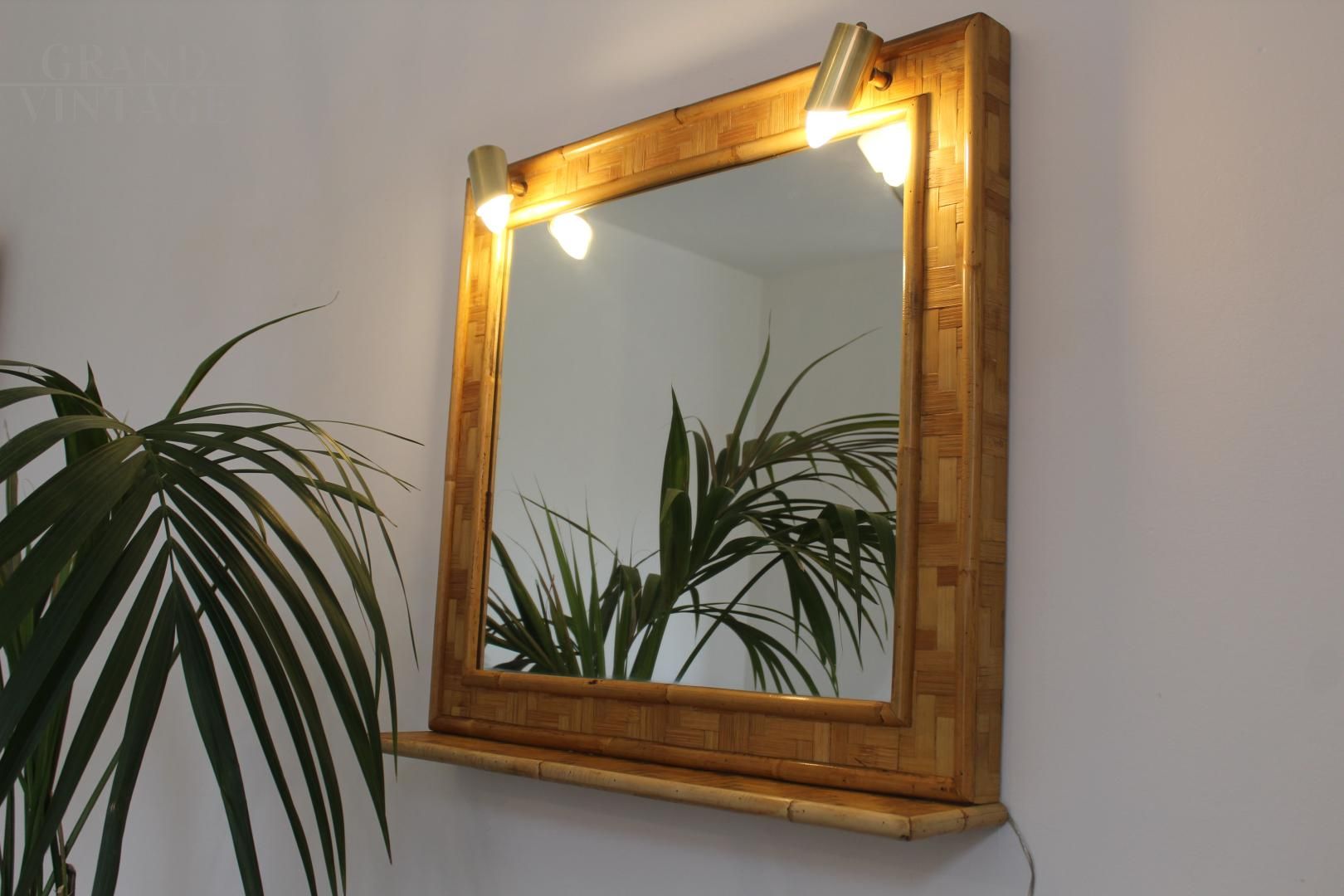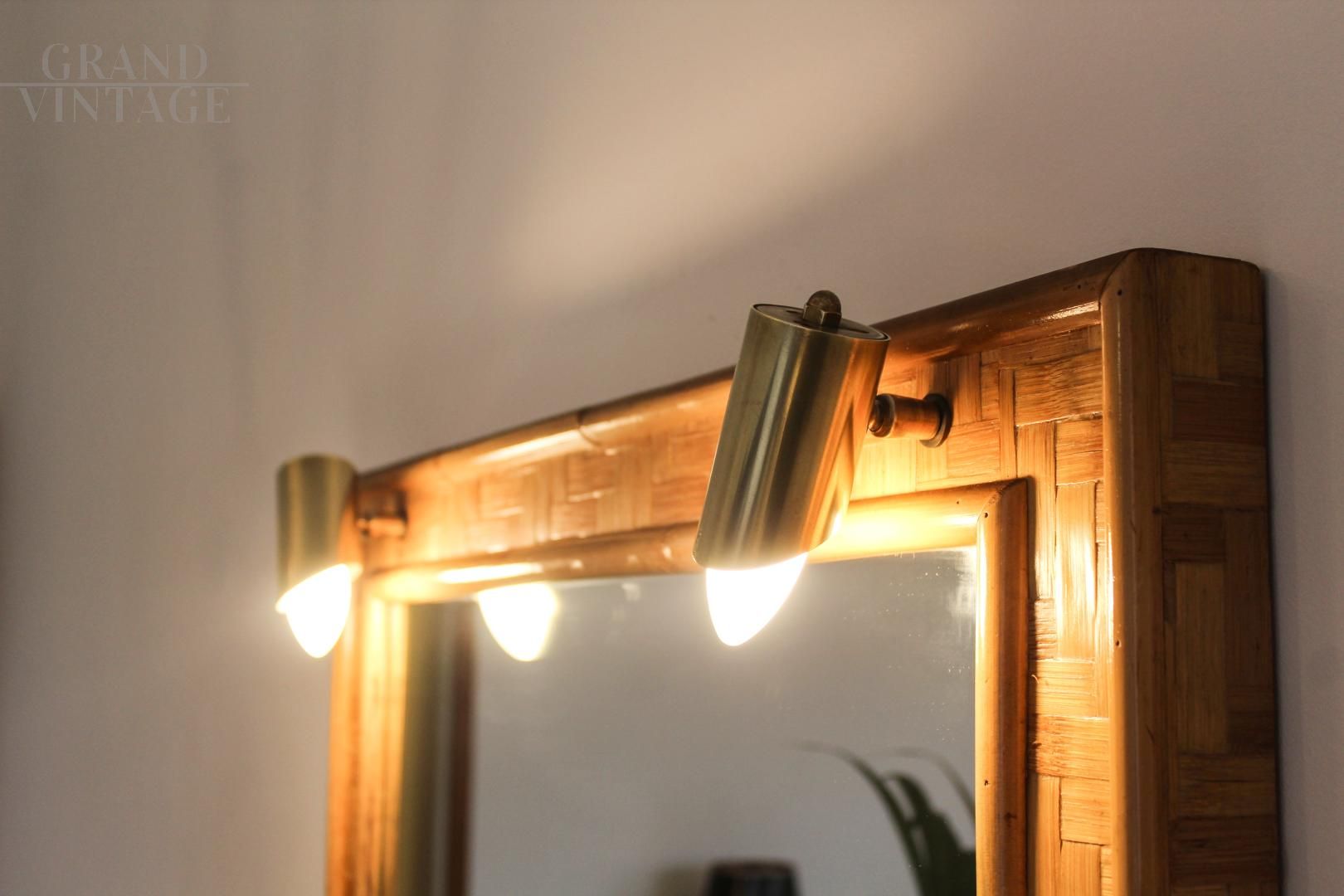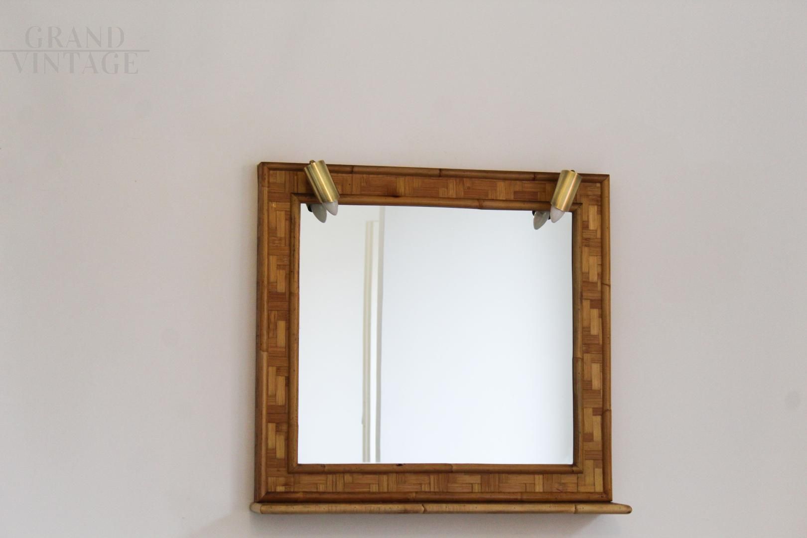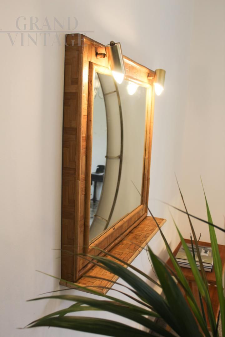 Vintage mirror in bamboo and brass, Italy 1970s, equipped with shelf and lighting system consisting of two light points. Clean and elegant design.
