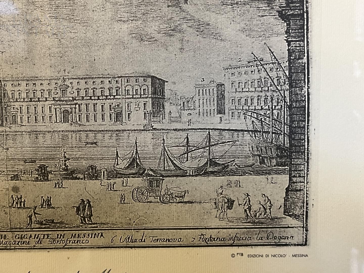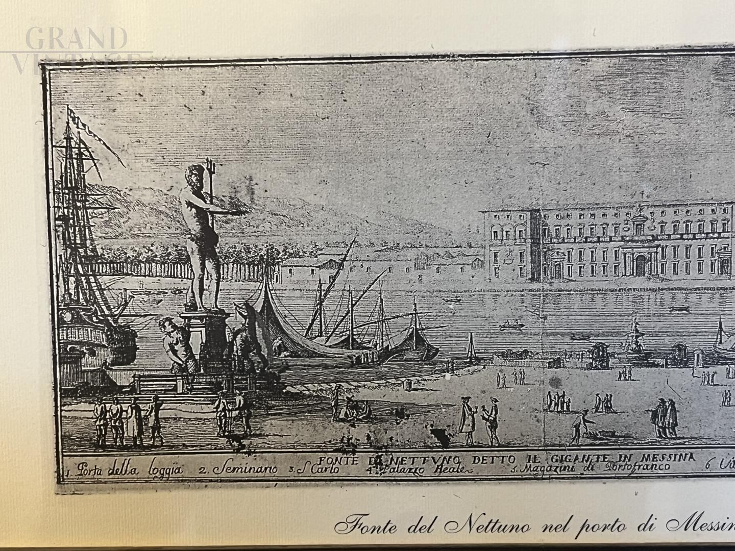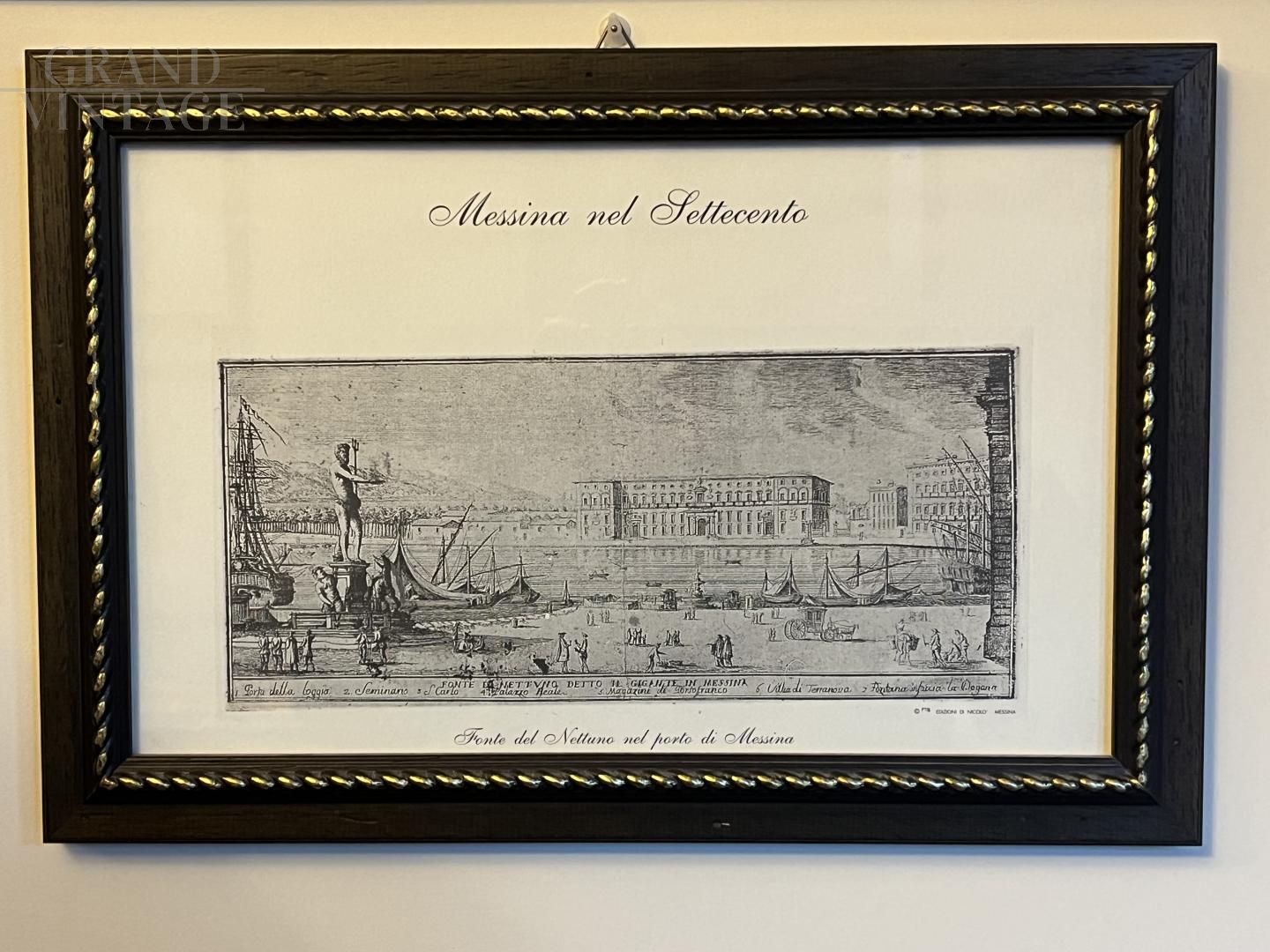 Antique print with an eighteenth-century view of the Italian city of Messina depicting the city port with the Renaissance statue of Neptune and the now disappeared Royal Palace. Printed on paper by Edizioni di Nicoló, Messina. The print is framed and in excellent condition.