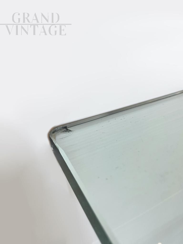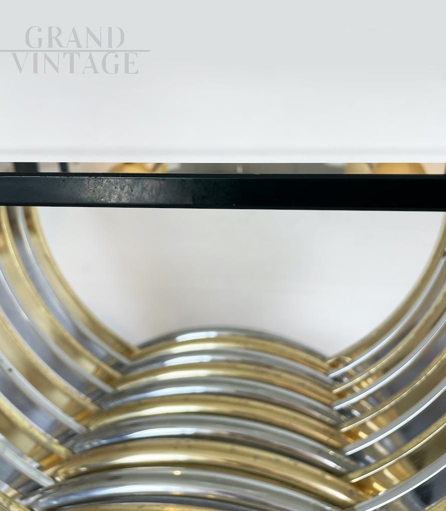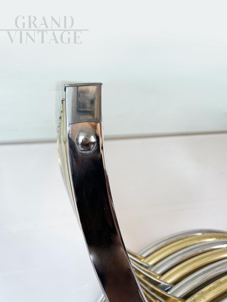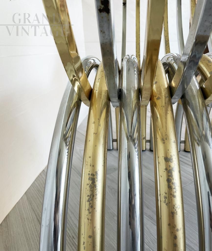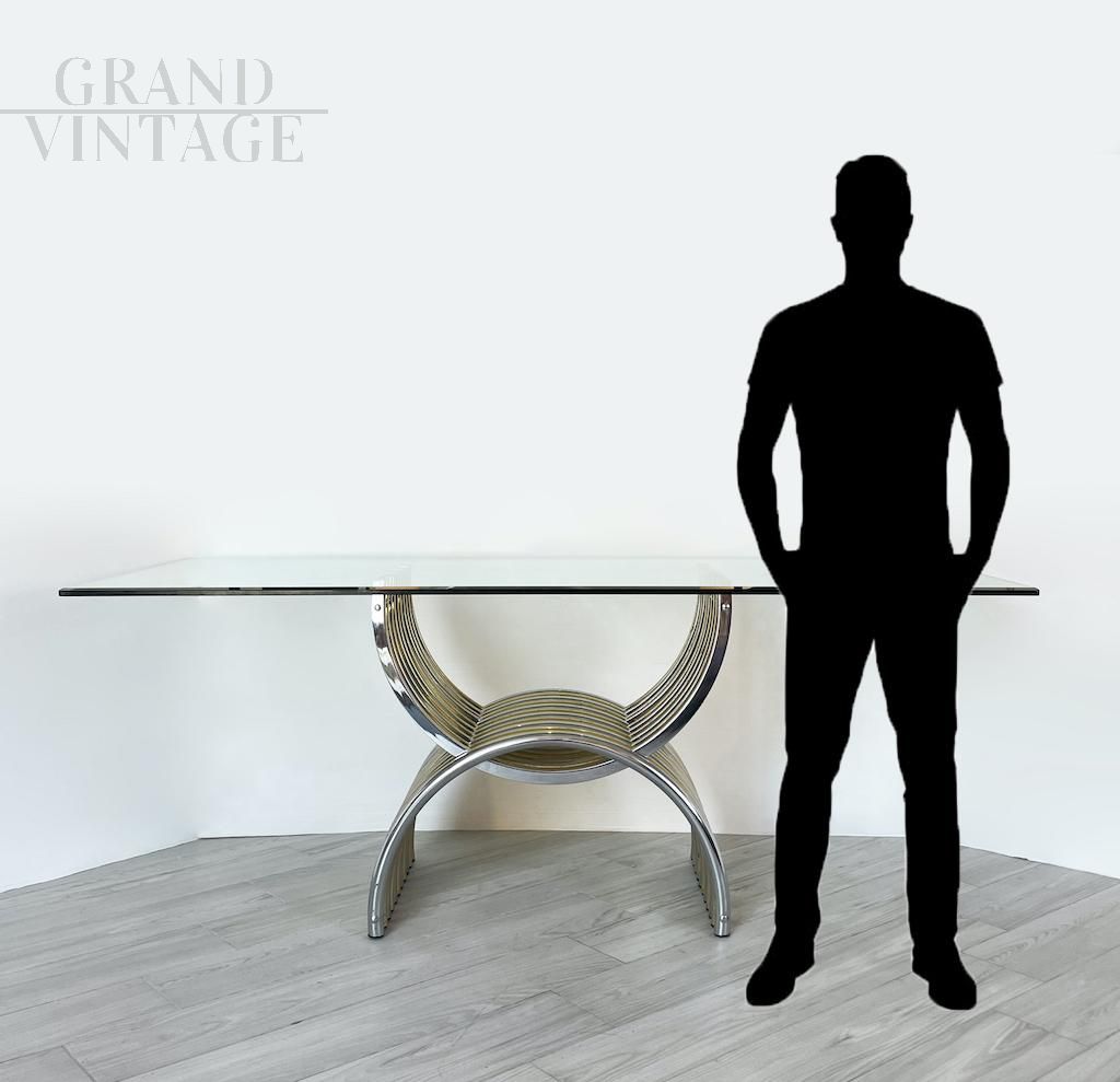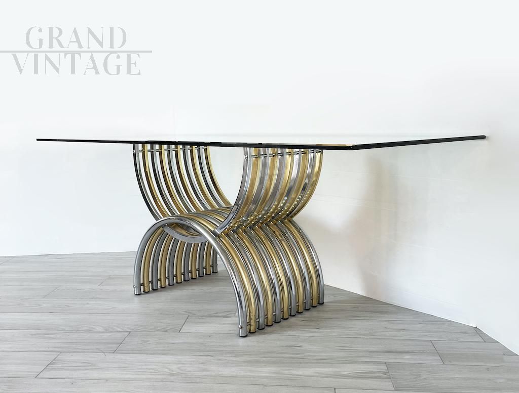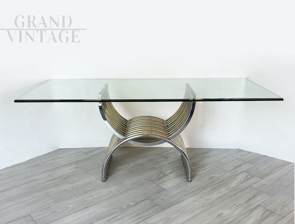 Elegant Vintage 1970 dining table featuring a base obtained from the intersection of two semicircles in chromed metal and brass, arranged alternately. The result is a very particular chromatic effect that gives the table an elegant, light and bright touch. The top is entirely in glass with a thickness of 1.5 cm and slightly beveled on the long sides. Signs of aging visible in the photo. Italy 1970s.