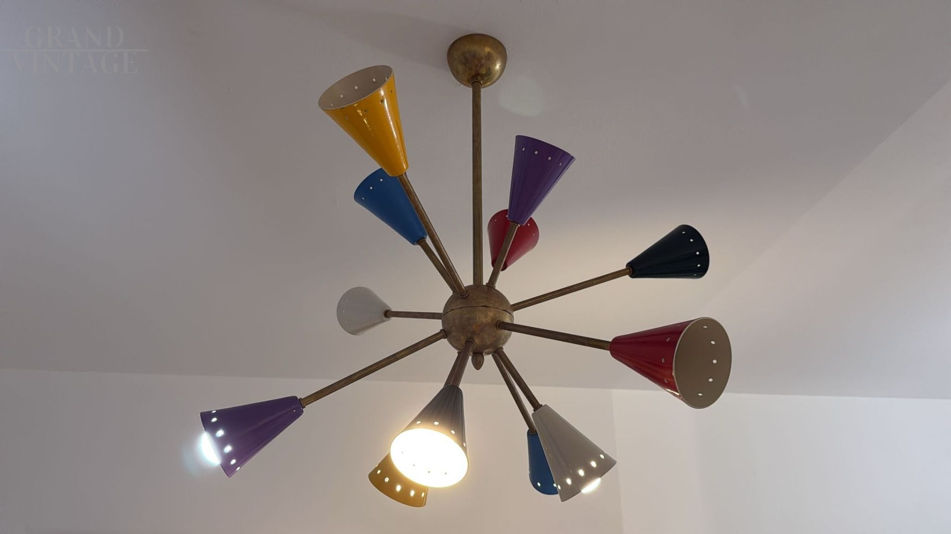 Stilnovo Sputnik-style chandelier with a brass frame and 12 conical lights in various colors: white, red, blue, yellow, purple, and black. In excellent condition, with minor natural signs of wear. The structure has no markings.