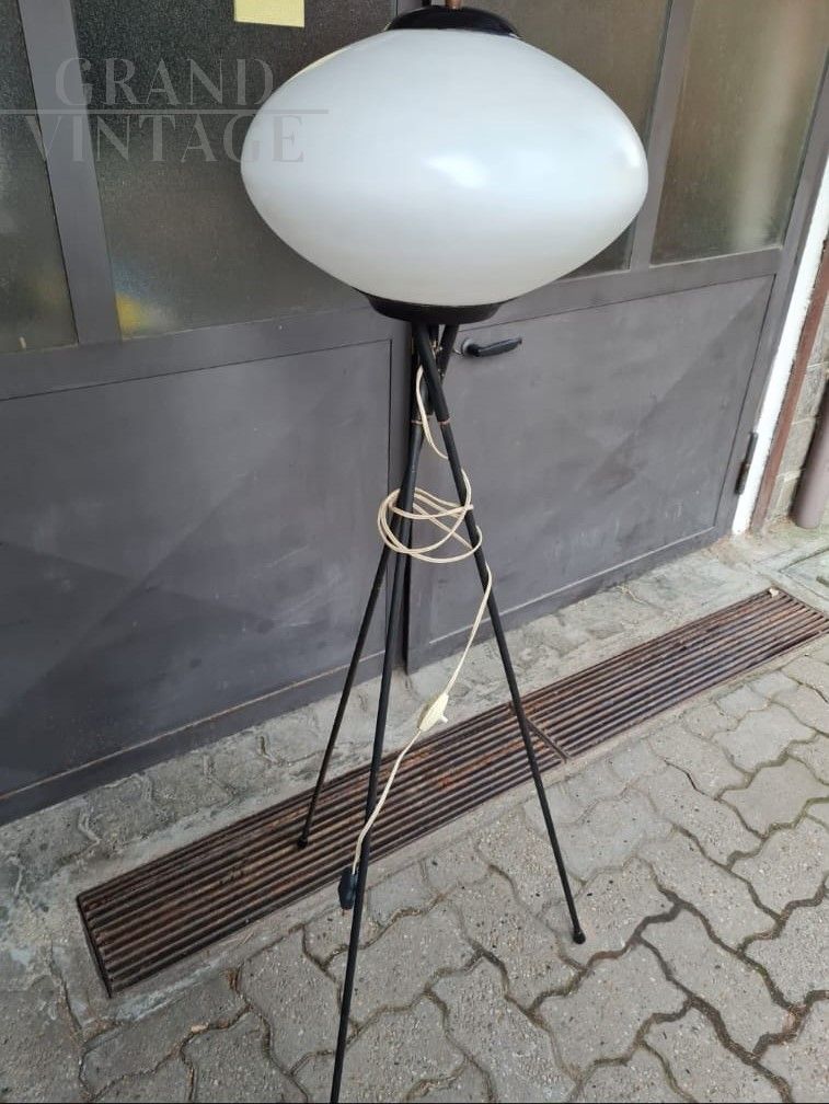 Italian mid-century modern design Stilnovo style tripod floor lamp, 1950s, with metal structure and opal white glass ellipse lampshade. In very good condition, working.