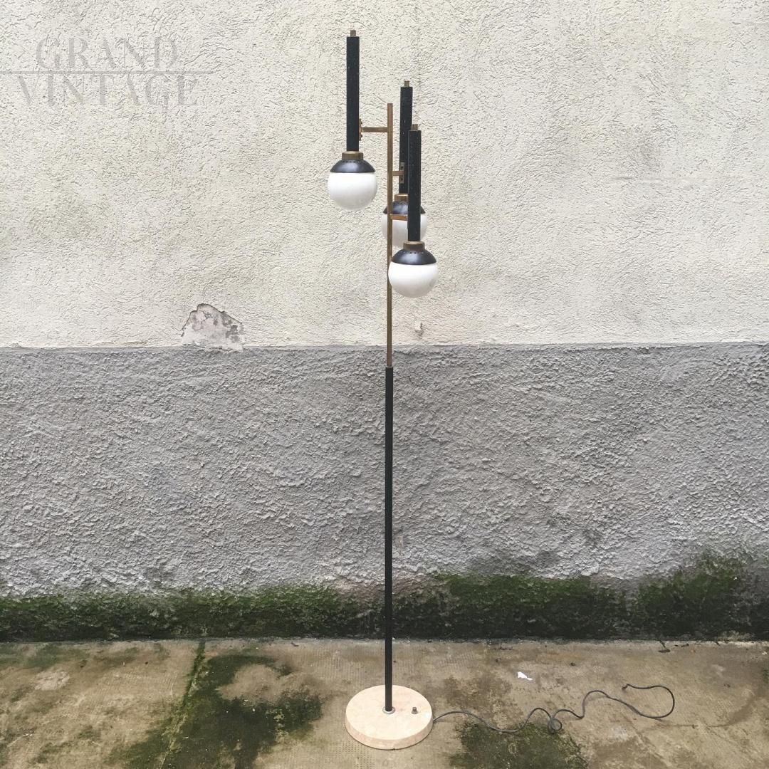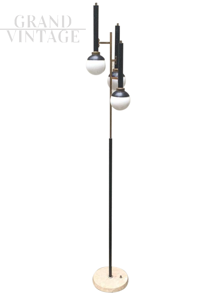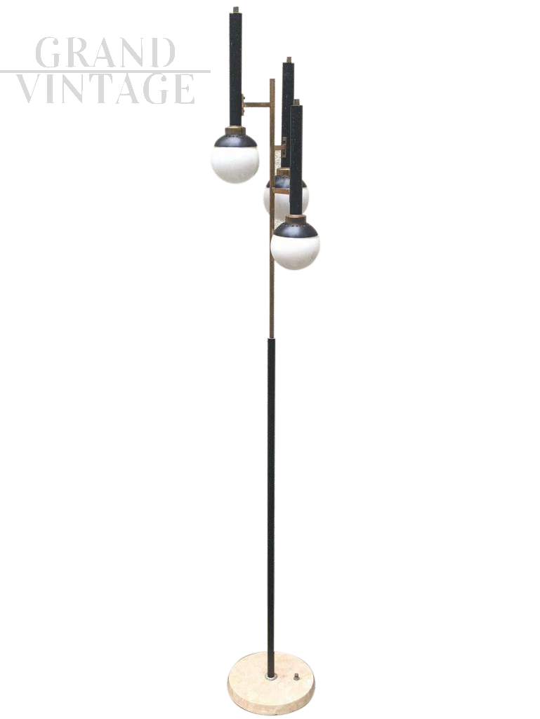 This vintage floor lamp in painted metal, brass and 3 small glass globes is in the typical mid-century Italian style. Round marble base, foot switch.