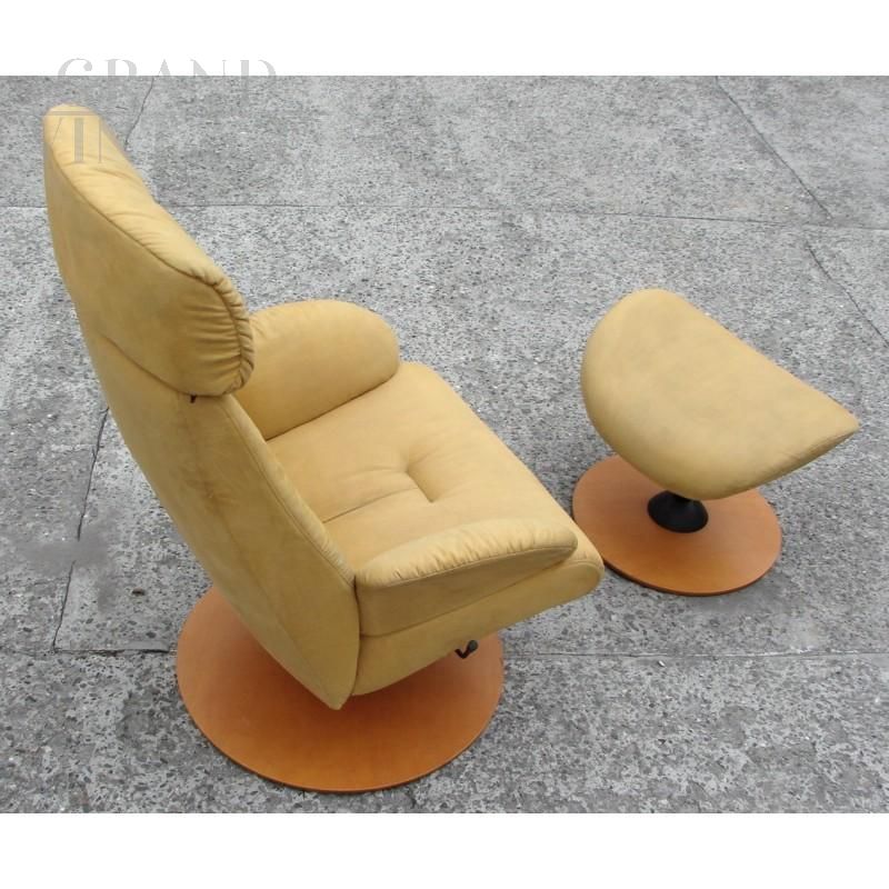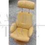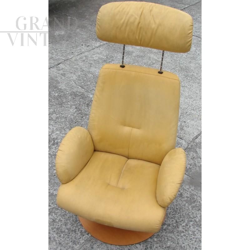 Yellow suede leather upholstery. The armchair is swivel and with height-adjustable headrest, and has the function that transforms it into a rocking armchair.