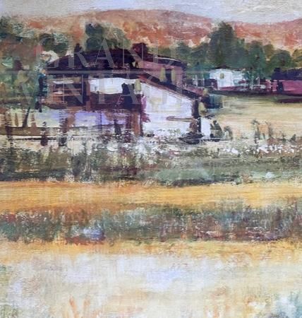 Painting by Giorgio Chiarini Boddi depicting an Italian summer landscape with country houses entitled Estate (Summer), oil on canvas from the 1960s. Measurements 94 x 86 cm.