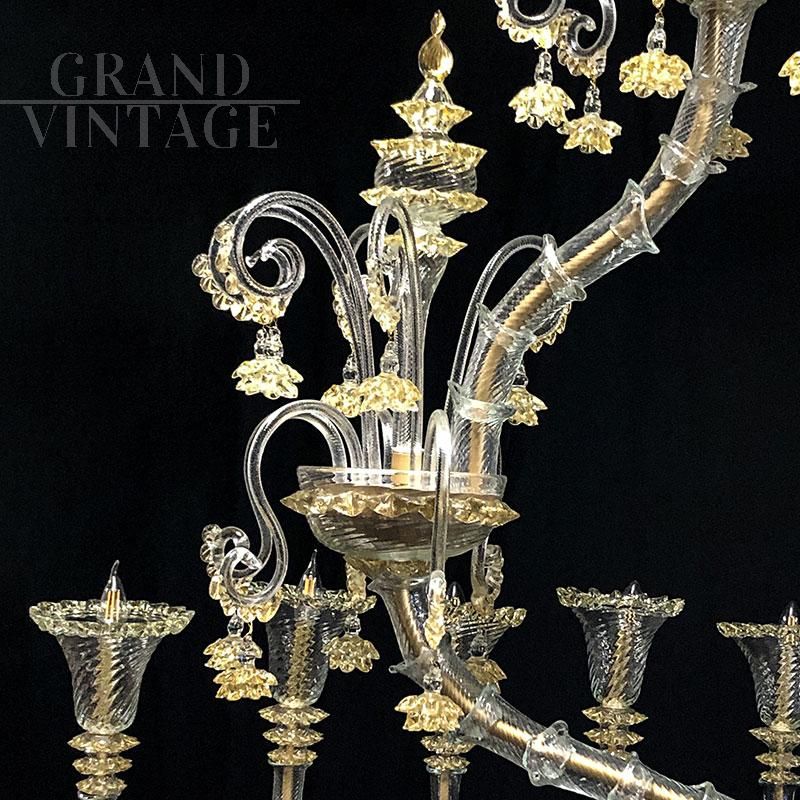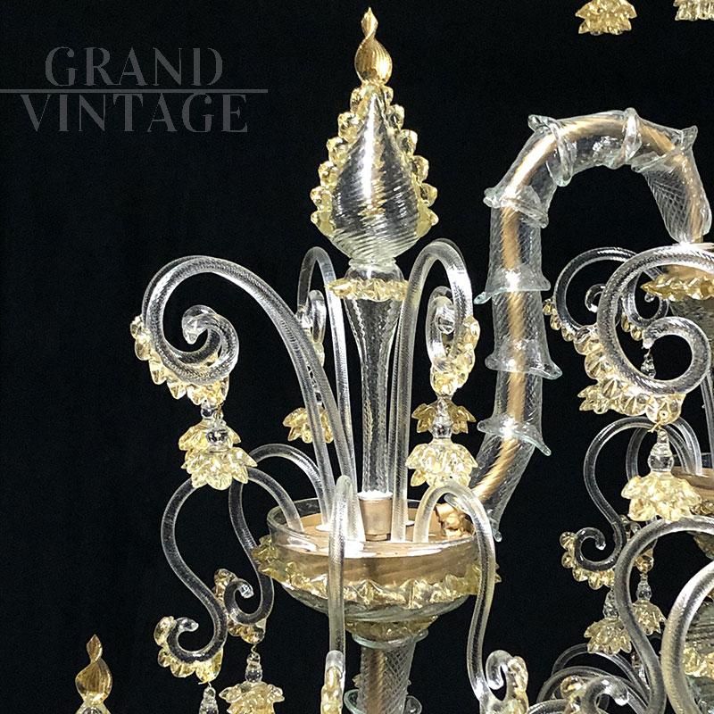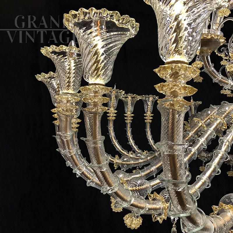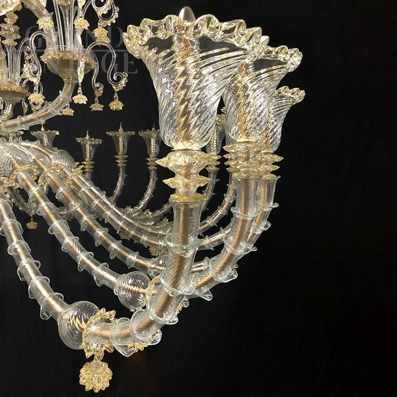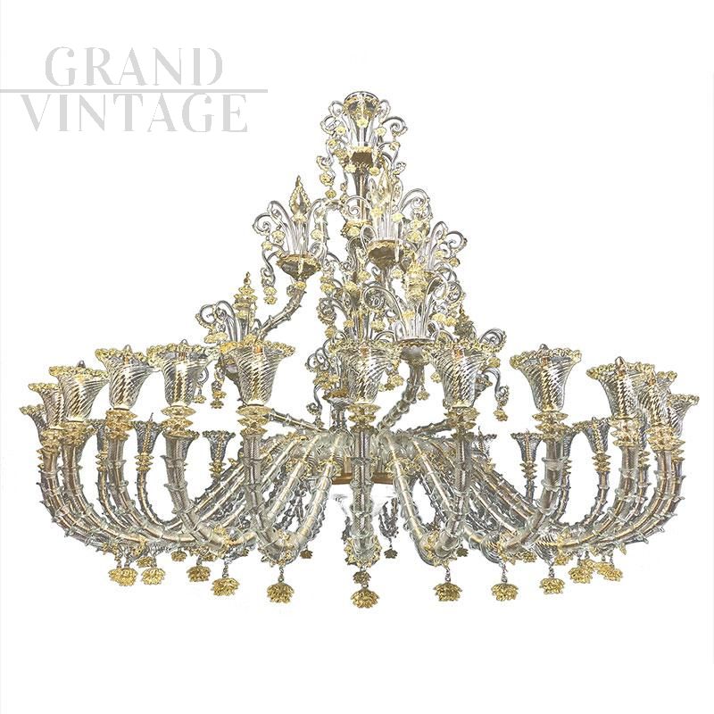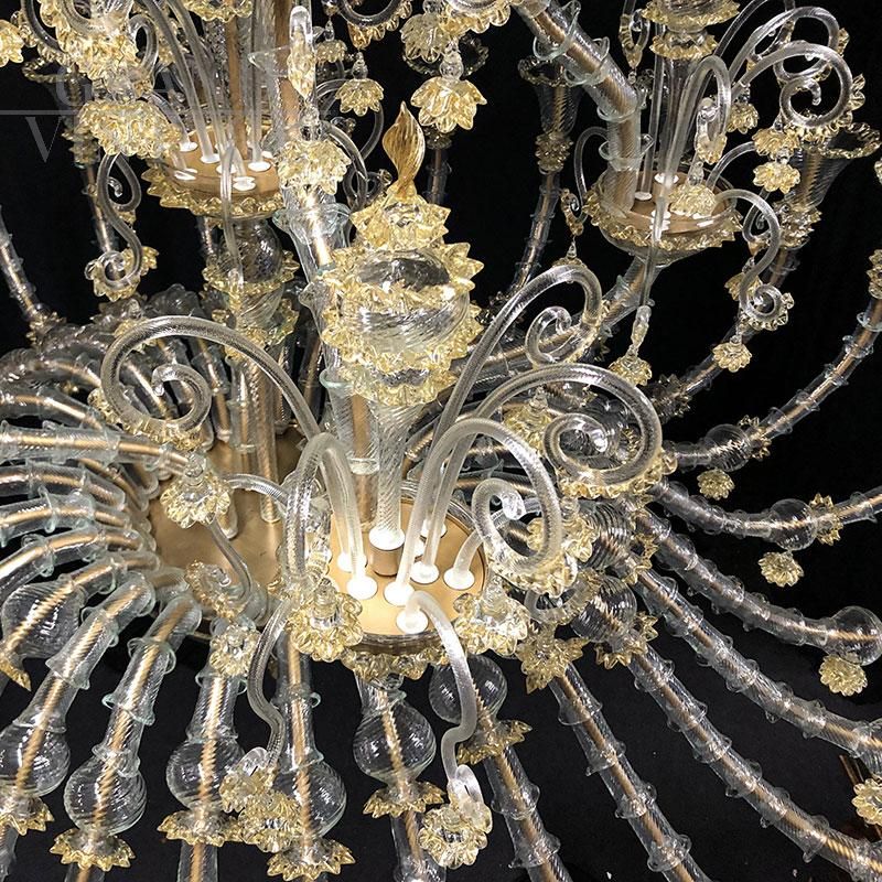 Large and sumptuous chandelier in transparent and white Murano glass, forged with ancient lace workmanship and with gold decorative elements. System with 28 lights organized in one order.