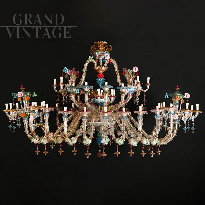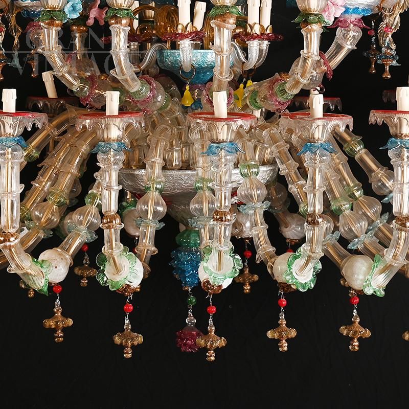 Large and sumptuous artistic Murano glass chandelier in the Rezzonico style, a beautiful boat model with elements in Murano glass blown and handcrafted with ancient technique. The glass that makes up the chandelier is threaded onto each chromed metal arm. This model is made with golden and white decorations and with glass paste flowers in yellow, blue, green and pink shades.