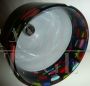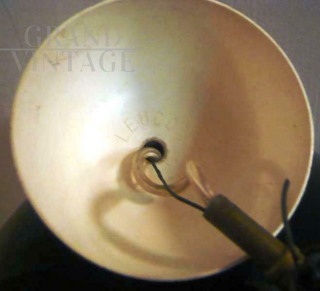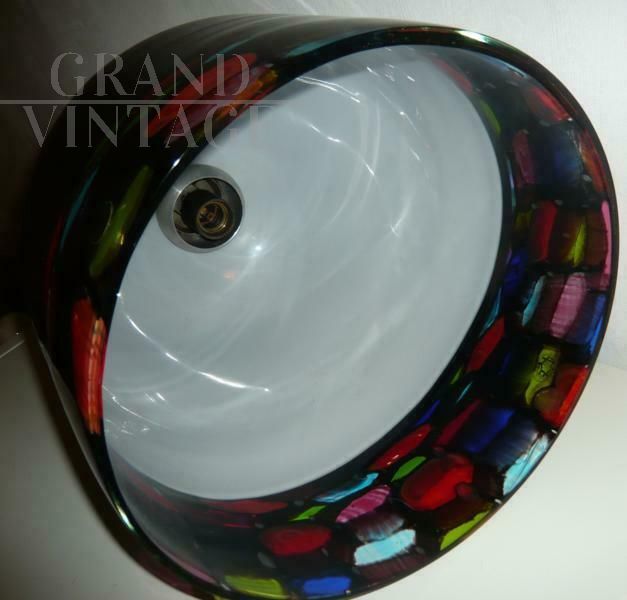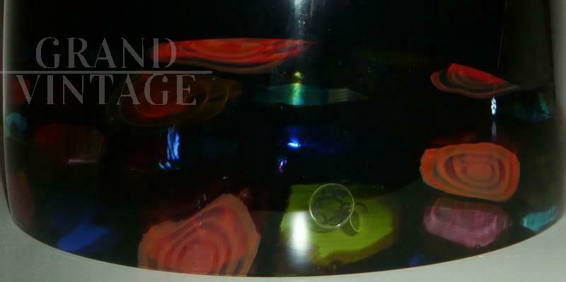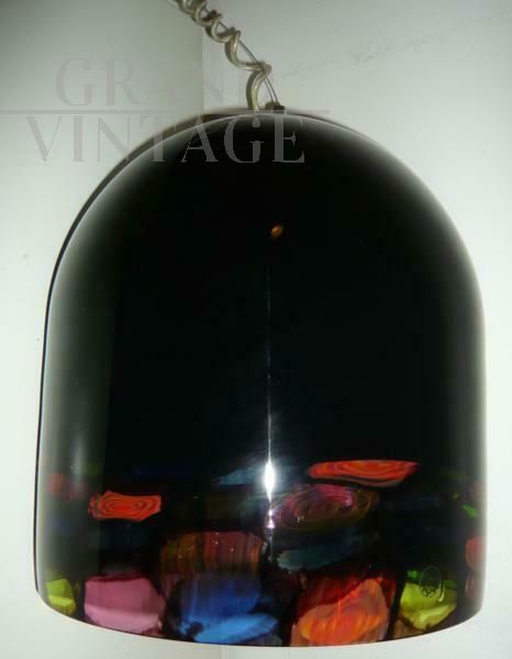 Famous and precious Leucos suspension lamp by Noti-Massari produced from 1970 to 1979. Each piece is unique due to its completely handmade manufacturing. Made in the renowned Murano glass factories. hand-blown with black lampshade and incorporation of large polychrome Murrine, internally covered in white, the glass dome chandelier is 40 cm high with a diameter of 36 cm. In very good condition, it has no flaws. Original lamp holder and wire with socket, working.
